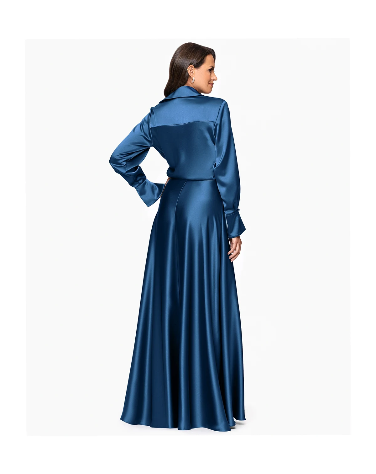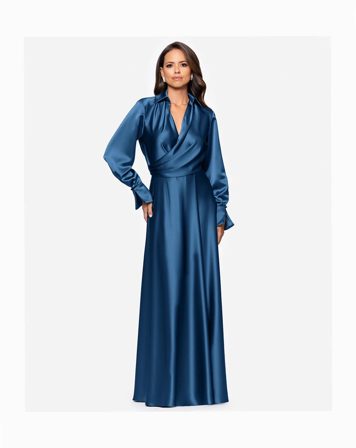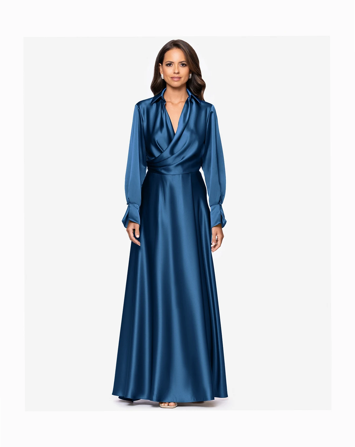 Achieve a polished and sophisticated look with a collared neckline and long sleeves on this XSCAPE dress. The structured silhouette offers a refined option for formal gatherings.