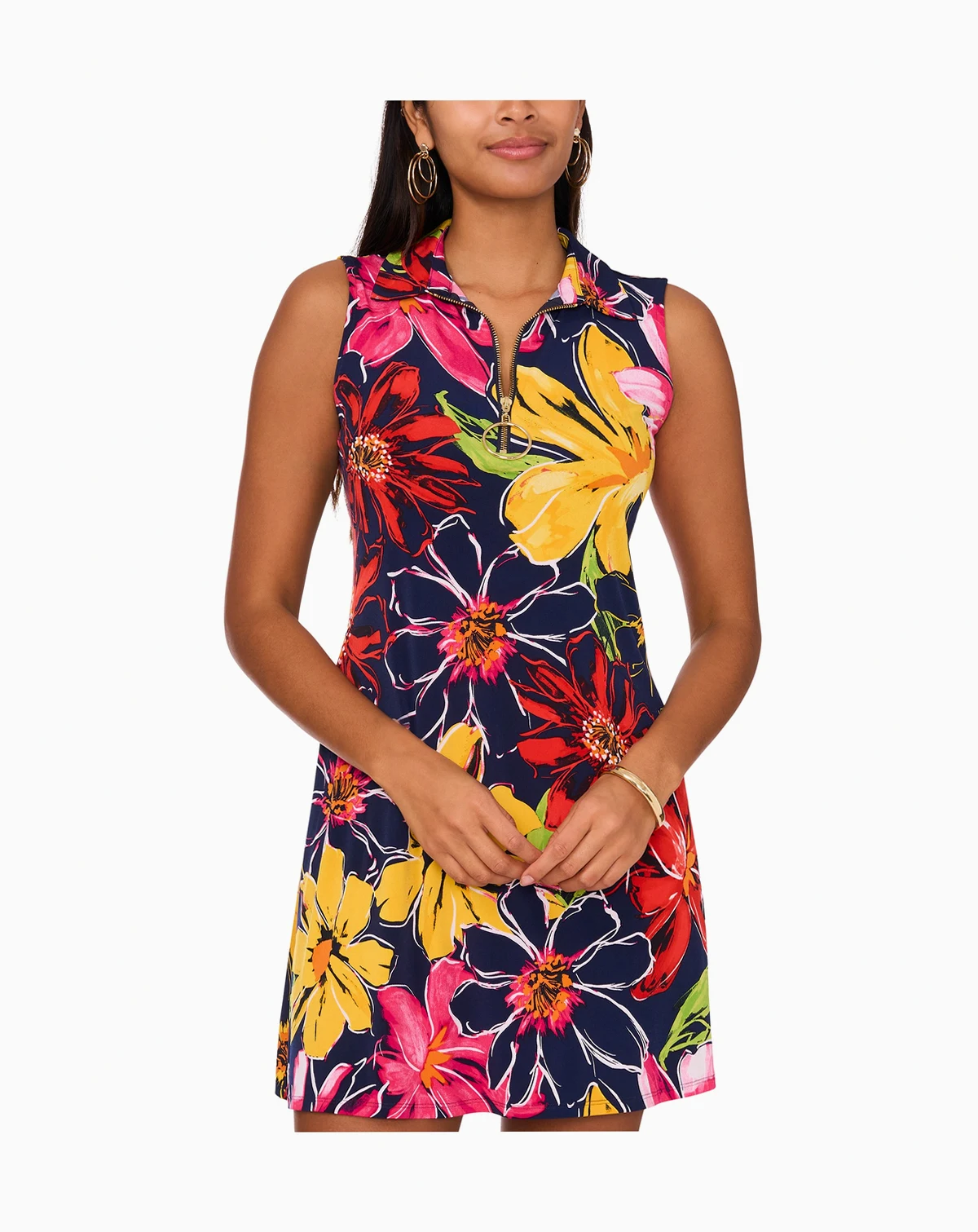 Women's Floral Jersey Front-Zip Sleeveless Dress