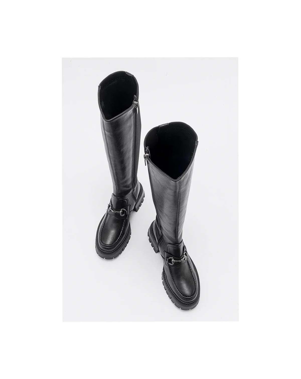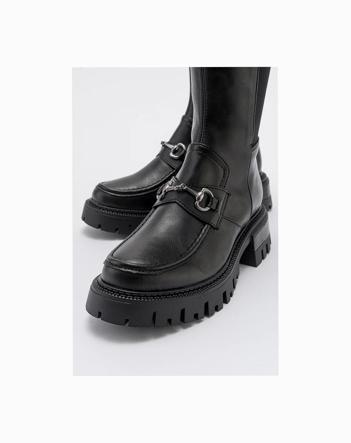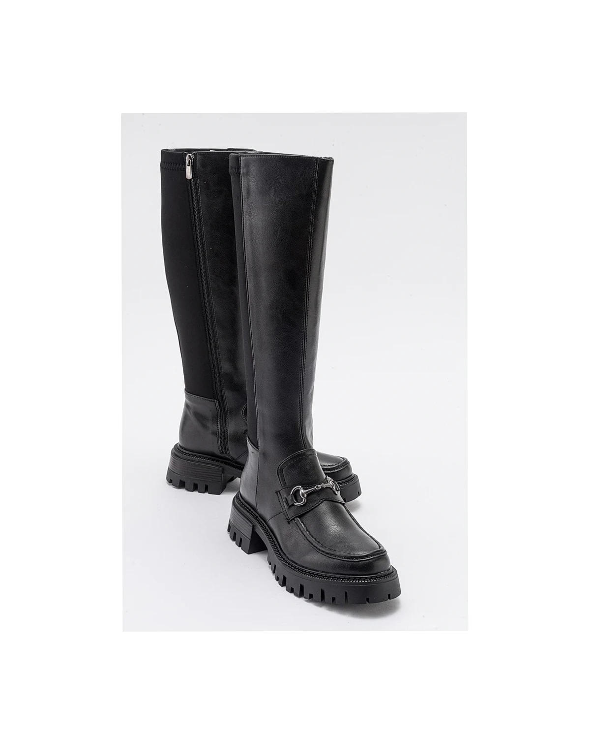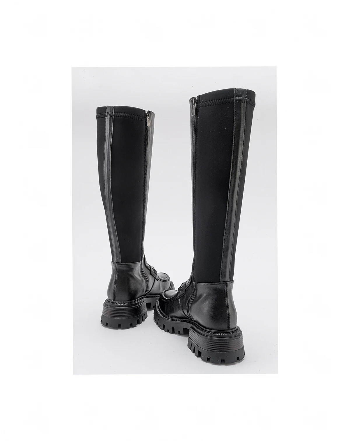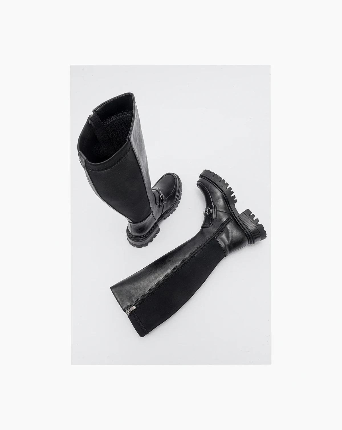 A contemporary stretch boot defined by buckle accents and a streamlined silhouette