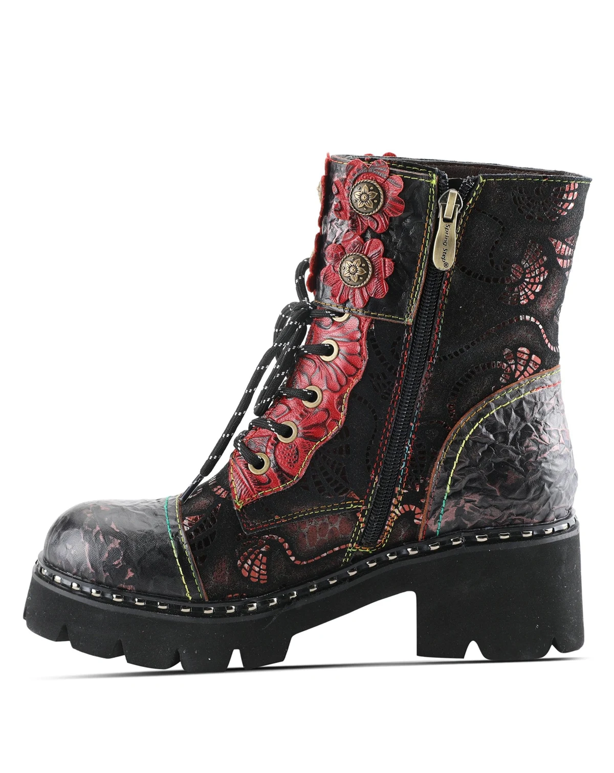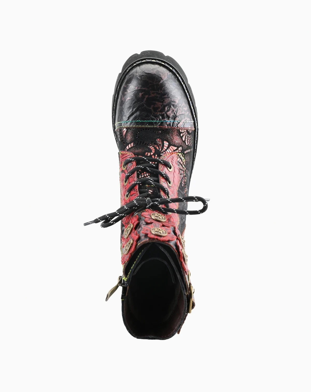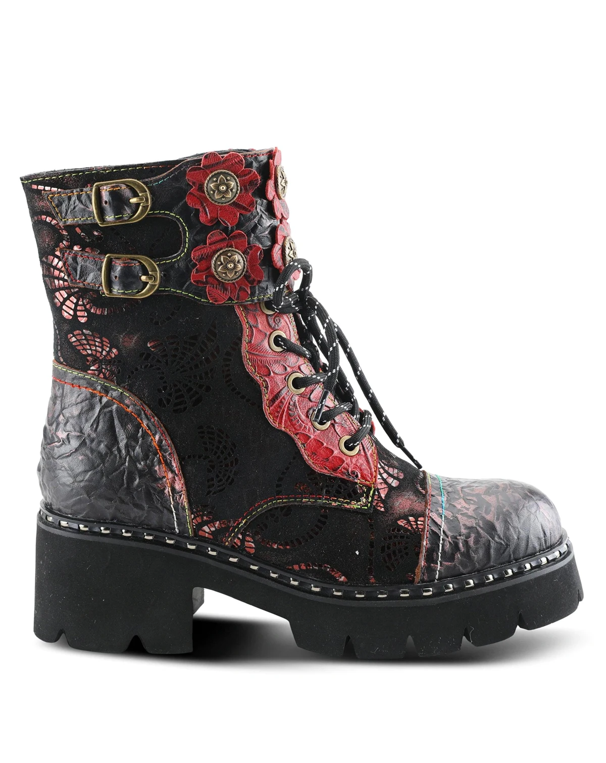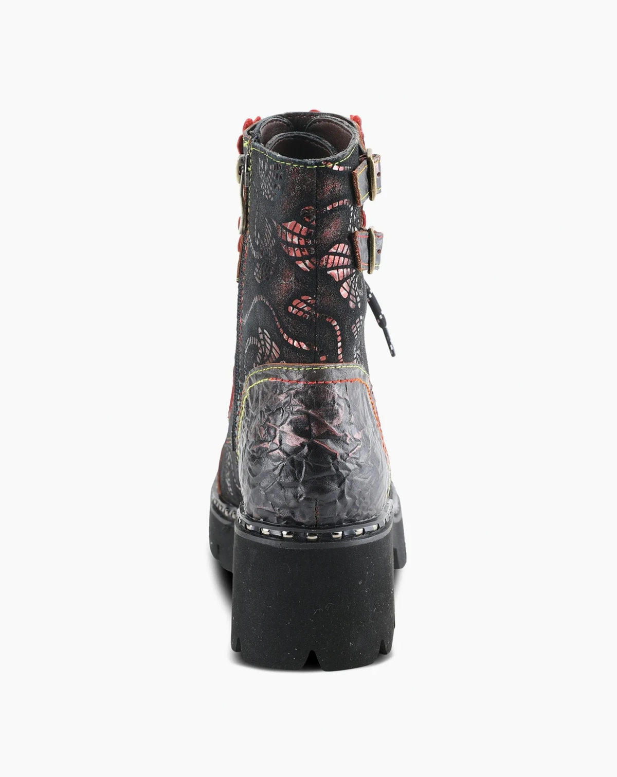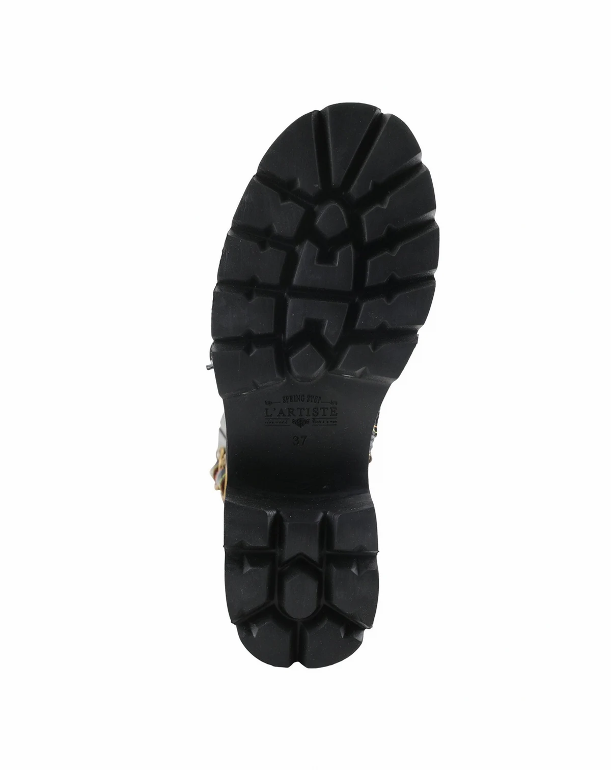 Unleash your edge with L Artiste s LIMITLESS boots—a bold fusion of rocker attitude and artistic craftsmanship. This mid-shaft leather boot features intricate floral cutouts, metallic stud accents, and an adjustable top strap for that rebellious charm. The rainbow stitching adds signature L Artiste flair, while the functional lace-up, zipper, and buckle closures ensure a customized fit. Faux fur lining and a cushioned insole keep you comfortable, even on your wildest adventures. Finished with a chunky 2¼" heel and 1" platform on a contemporary lug outsole for extra traction and style. True to size fit.