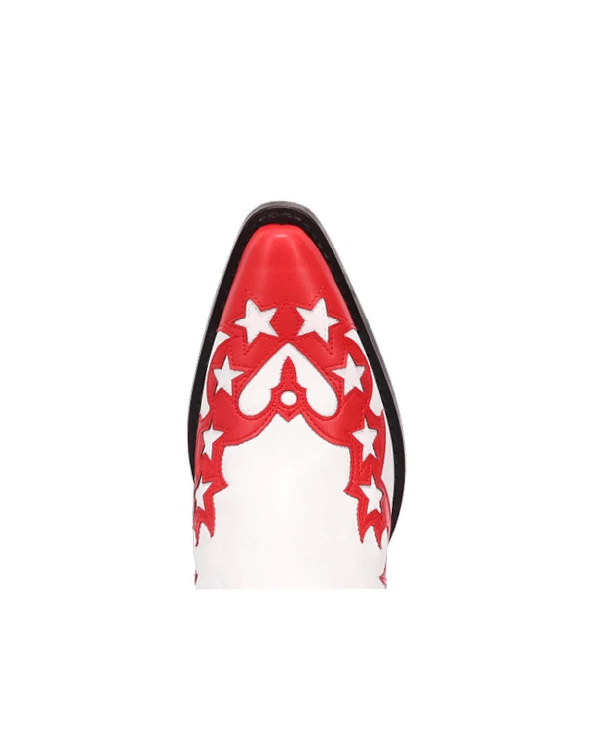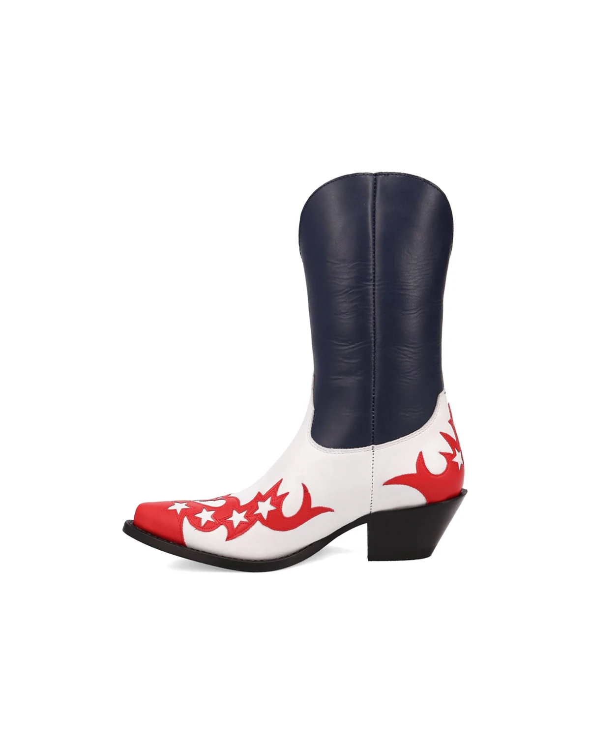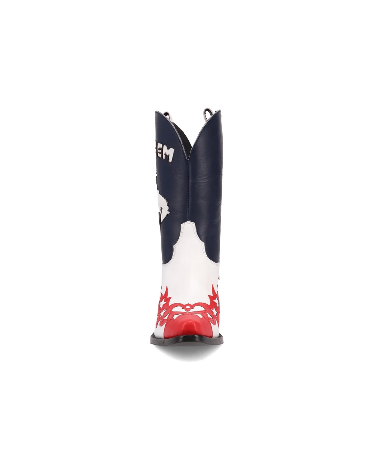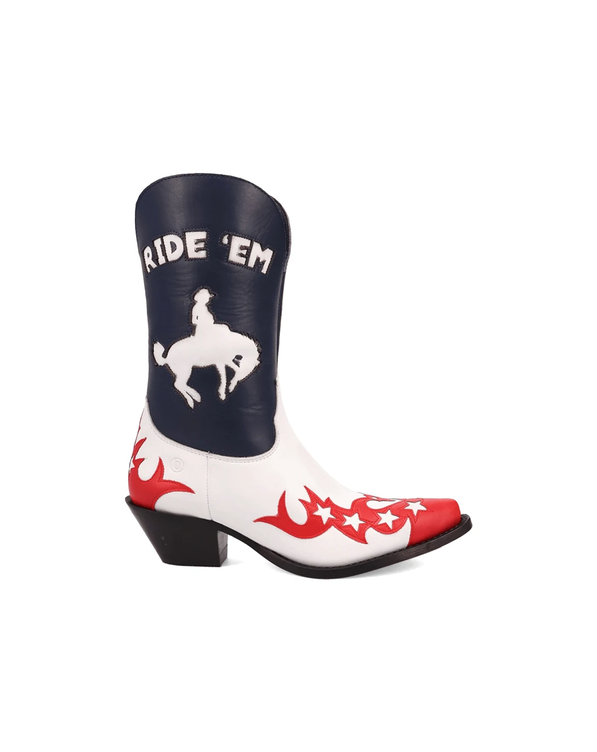 Find your freedom with these stylish boots. The captivating red, white, and blue design with stars, evokes a sense of independence and a touch of the iconic 'Ride 'Em Cowgirl' spirit.
