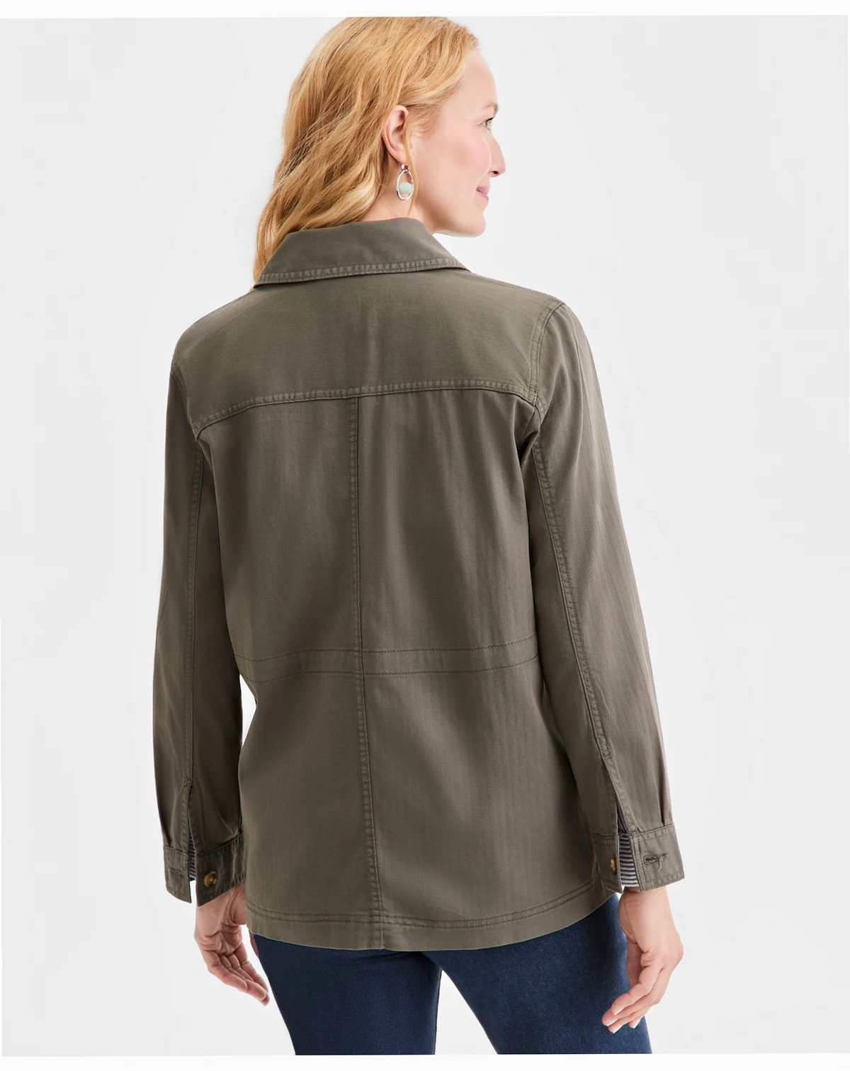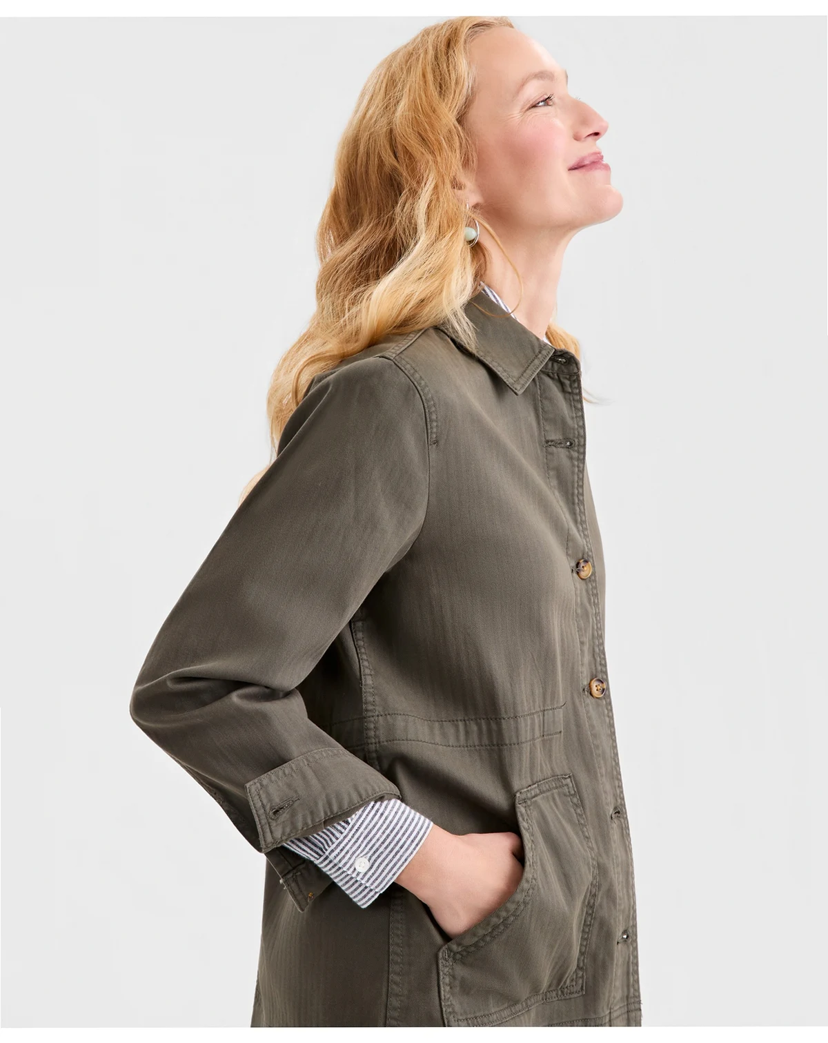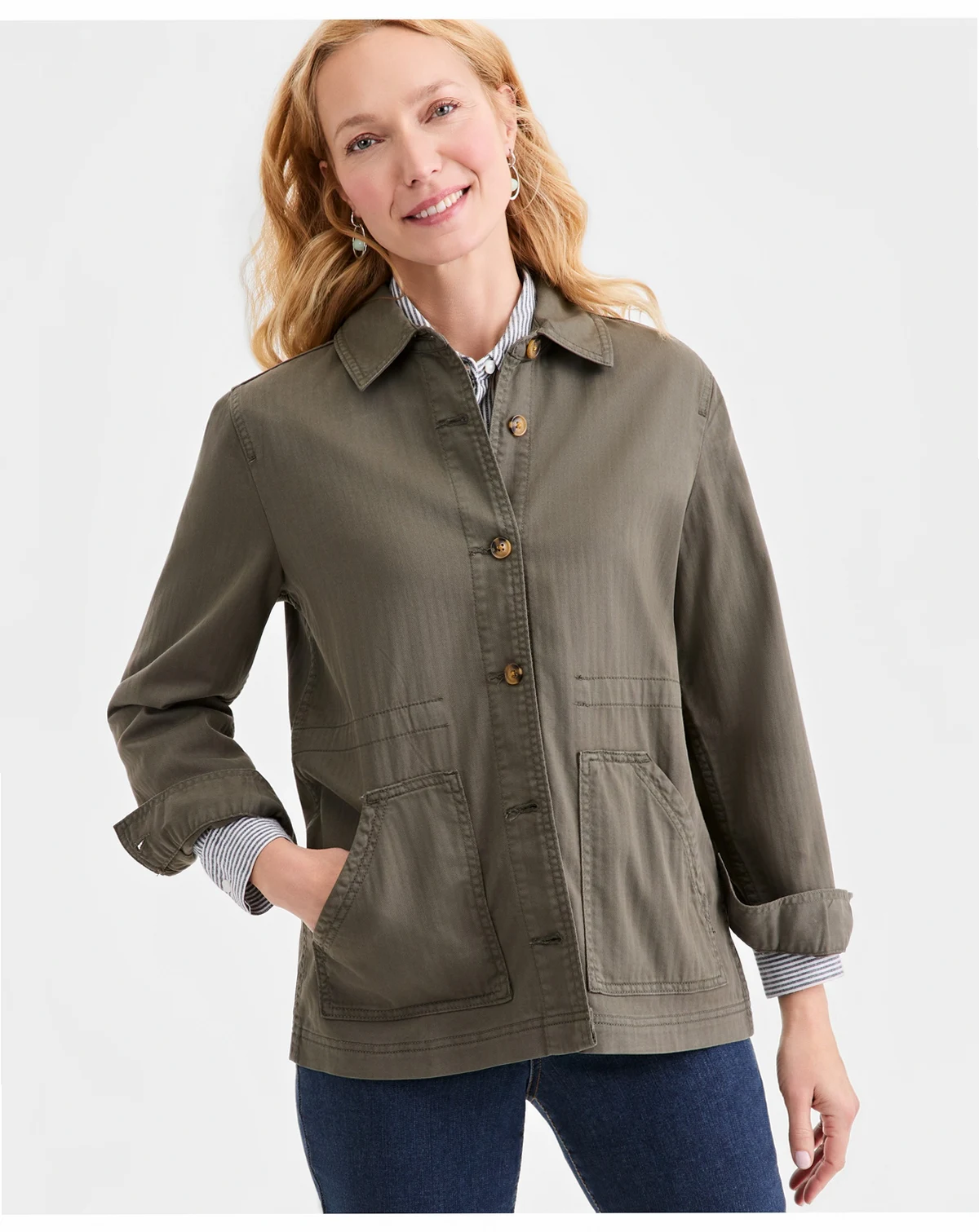 Subtle herringbone patterning adds a tailored touch to the relaxed feel of this button-front jacket from Style & Co.