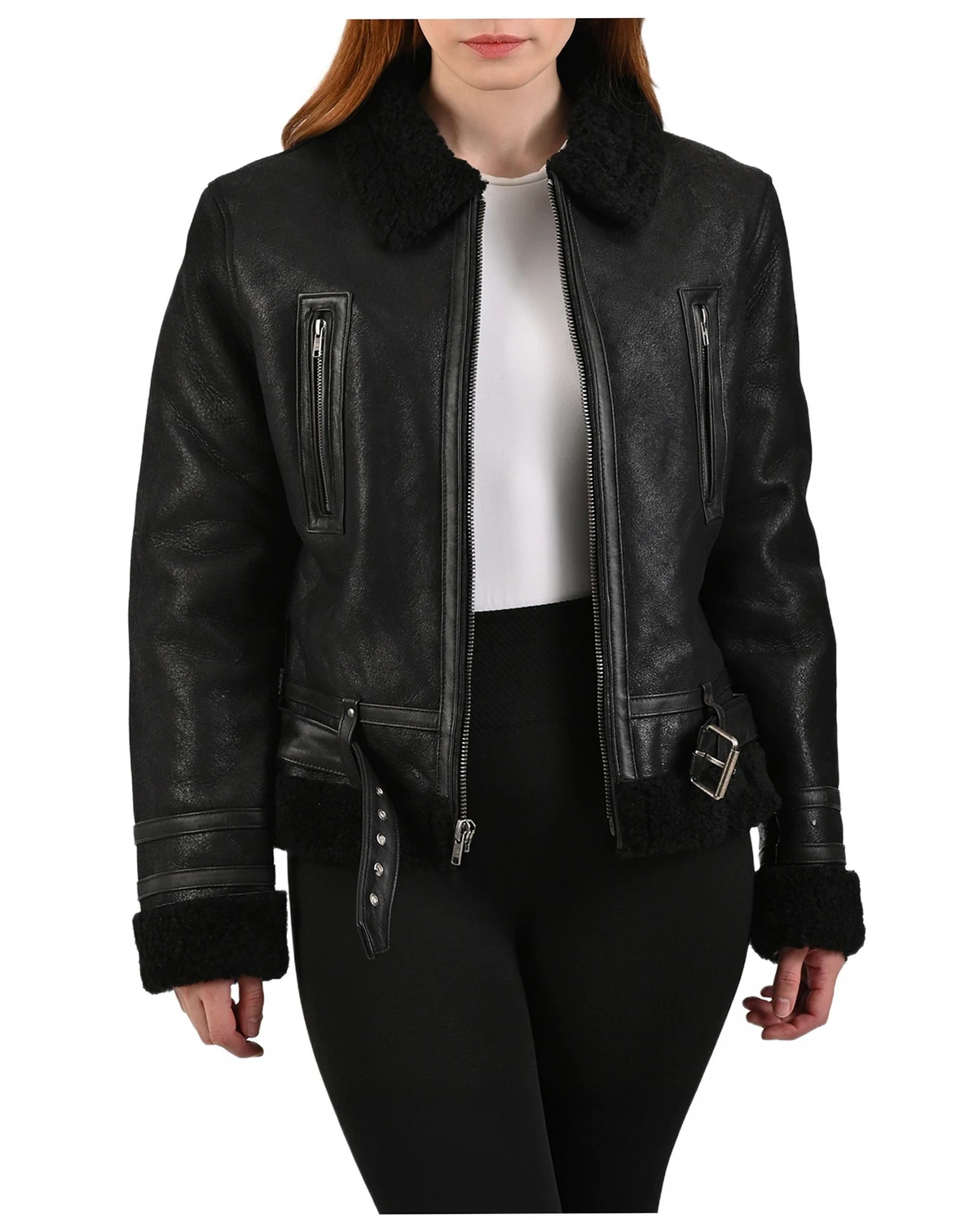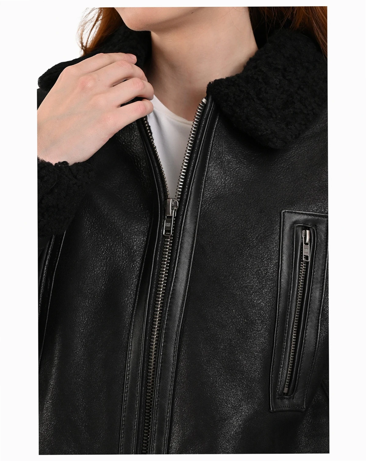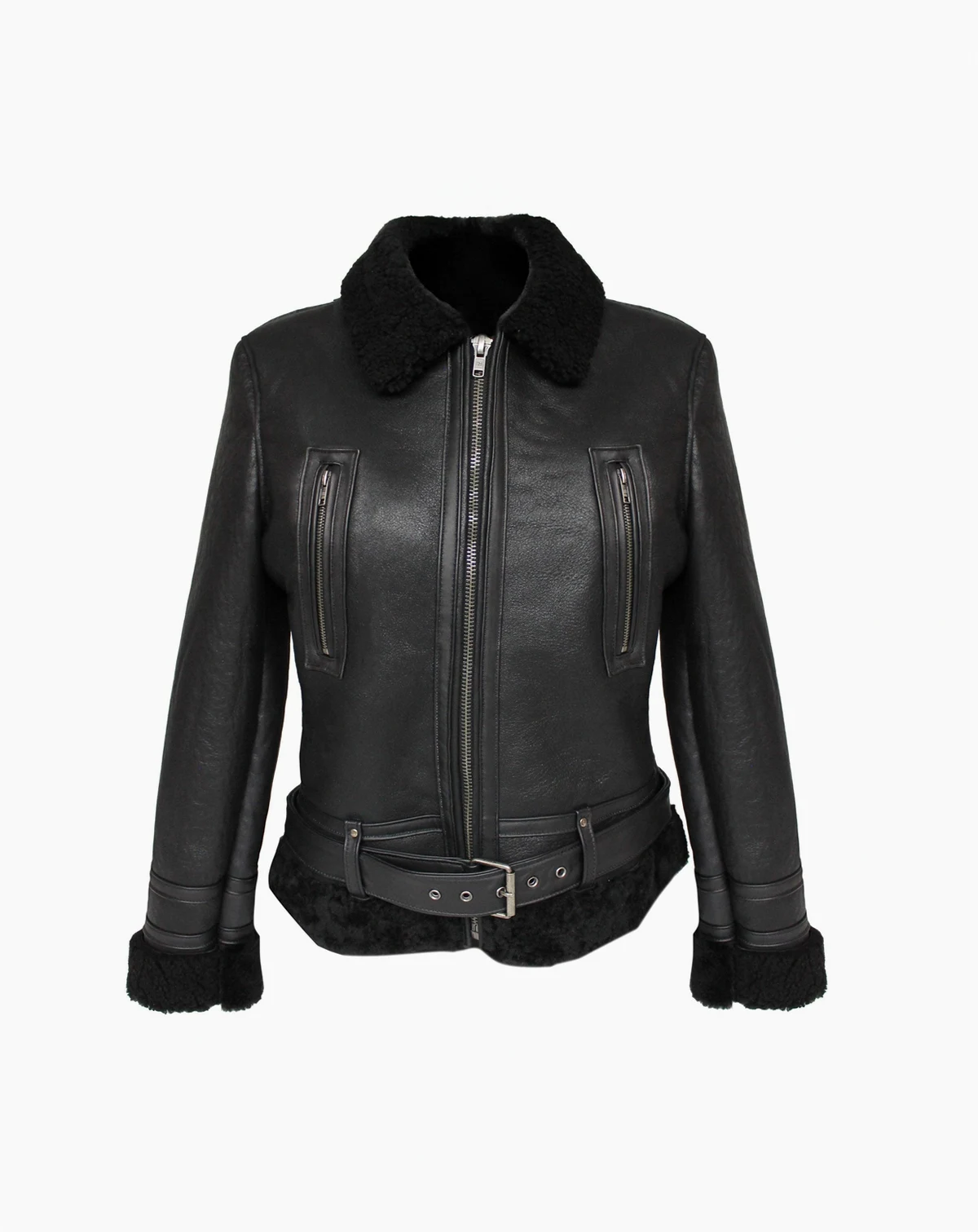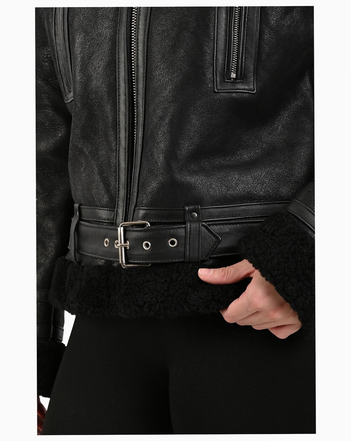 This casual aviator-inspired jacket is crafted from double-sided sheepskin with a crackle finish that highlights its design. The soft shearling lining stands out on the collar, cuffs and waistband, adding a touch of warmth and style. The adjustable belt with custom buckle enhances its feminine silhouette, while the zippered chest pockets add a modern and functional touch. Ideal for any occasion, this piece combines elegance and versatility.