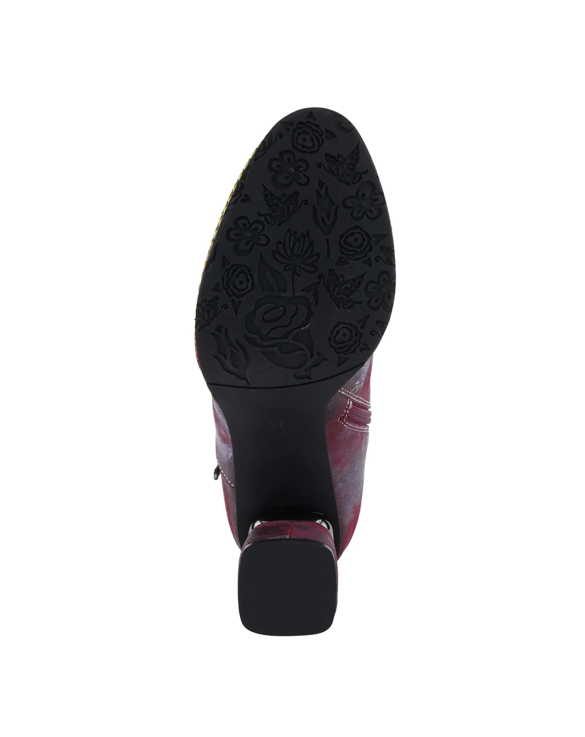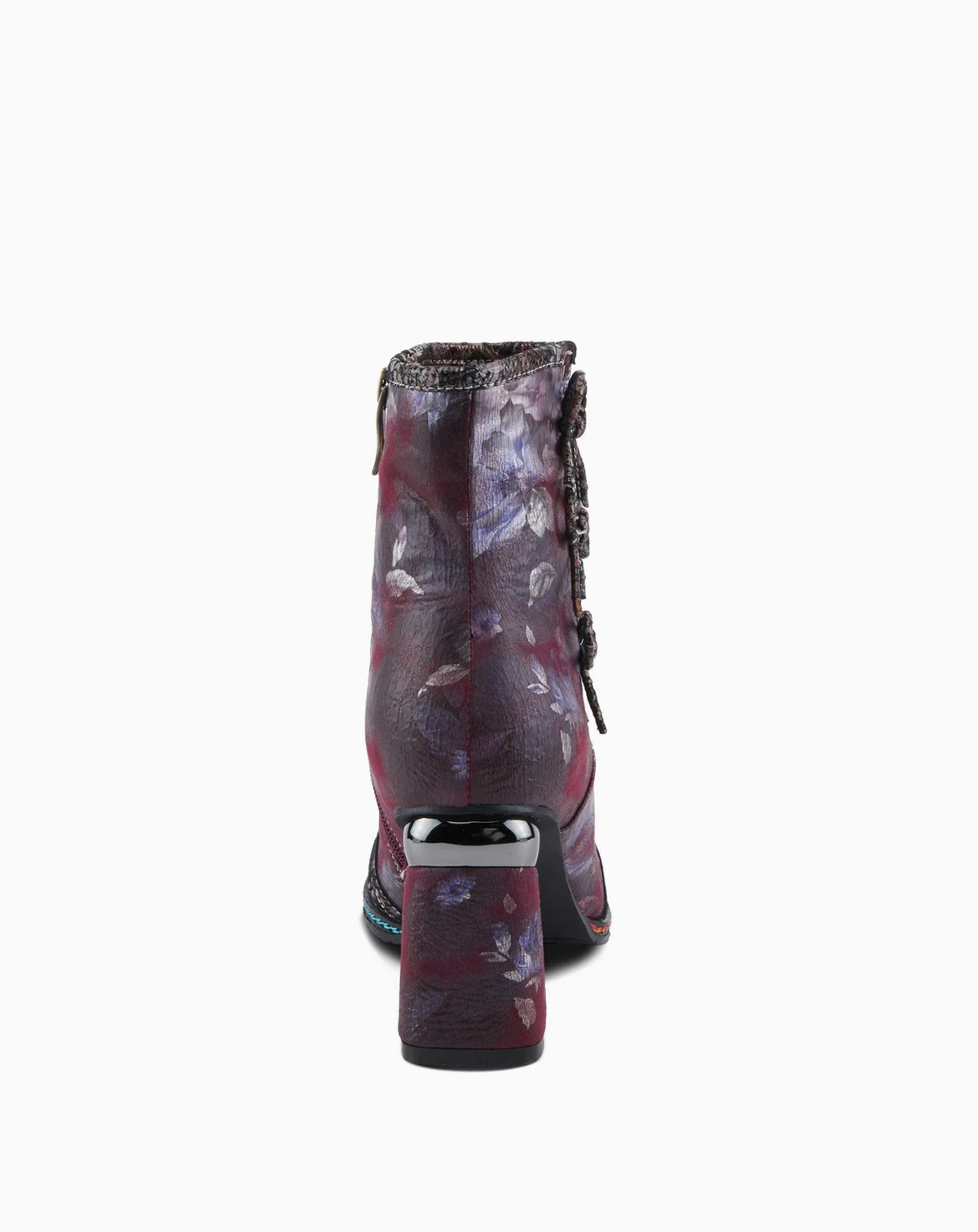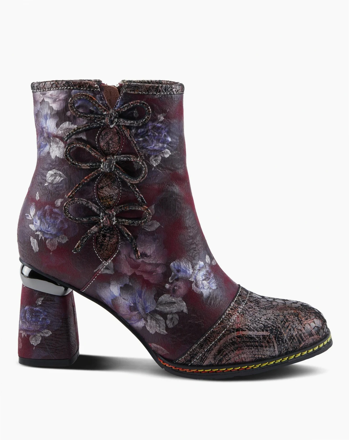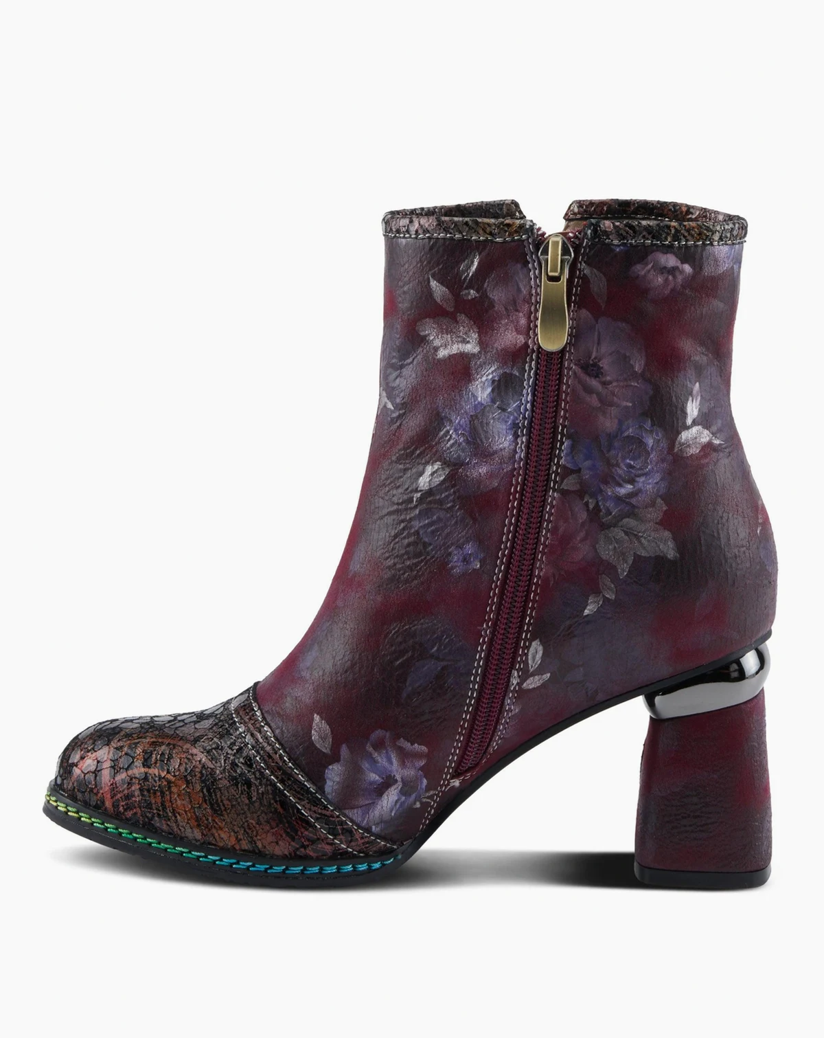 Step into standout sophistication with the L Artiste Carre — a show-stopping bootie designed for the fashion-forward. This leather combo boot features a sleek metallic cap toe and a multicolored floral upper, accented by three playful decorative ribbons along the outer shaft. A bold, printed block heel adds eye-catching flair, while contrast rainbow stitching around the welt gives this boot an unexpected pop of color. Lined in velvet with a cushioned insole and inner zipper for easy entry, Carre blends elegance, comfort, and artistic detail in every step. Shaft height: 7½". Circumference: 10". Fits true to size.
