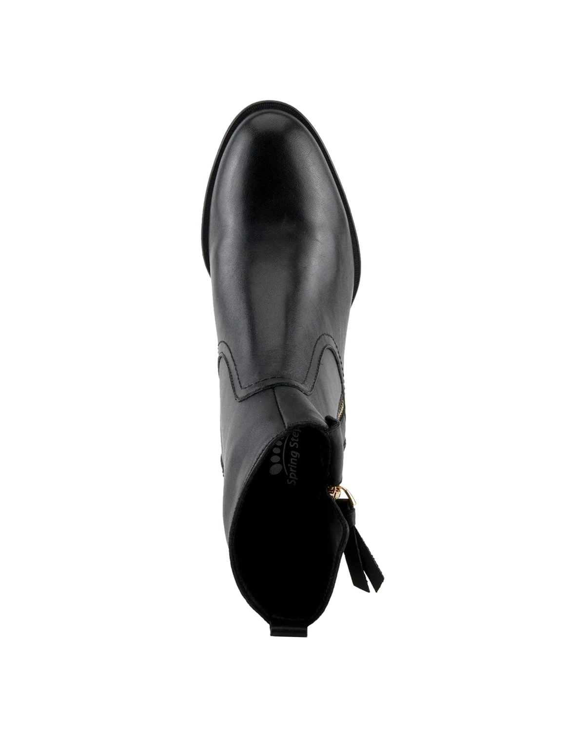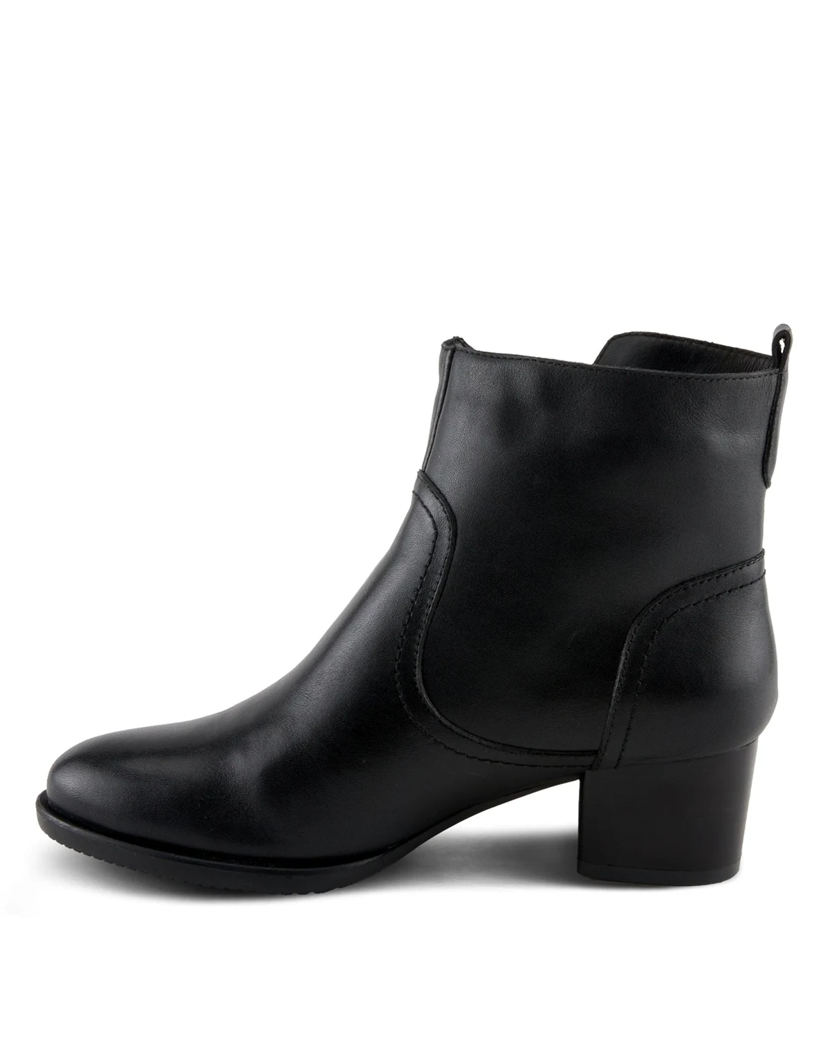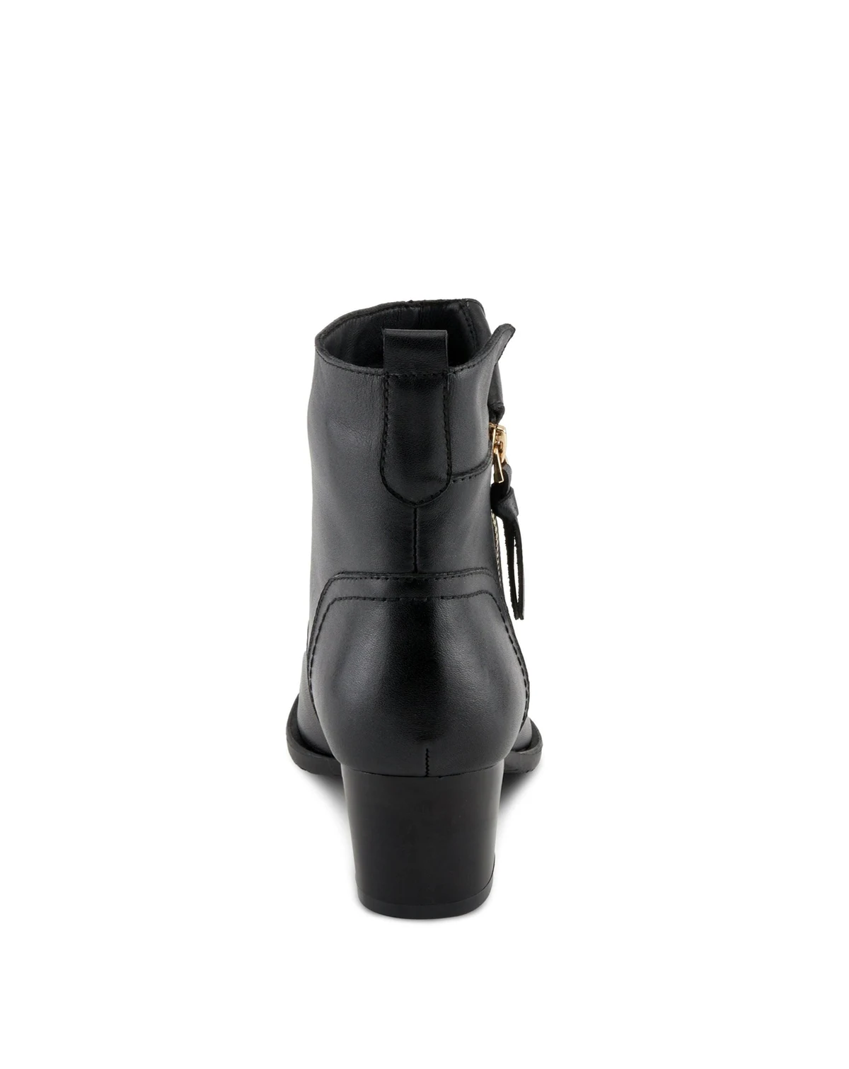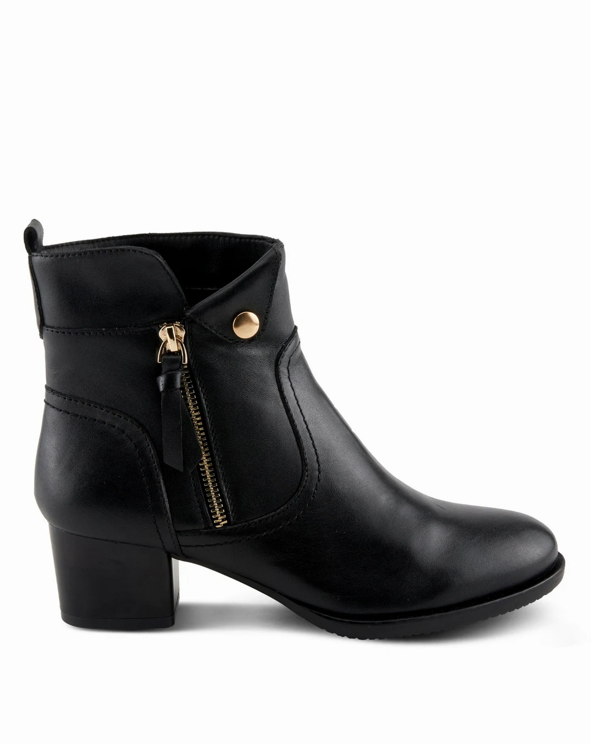 Designed for the modern woman on the move, this short-heeled leather bootie blends timeless elegance with everyday comfort. The rich leather upper is accented by a gold snap button and functional outer zipper, while the flexible sole and flattering heel height offer wear-all-day support and sophistication.