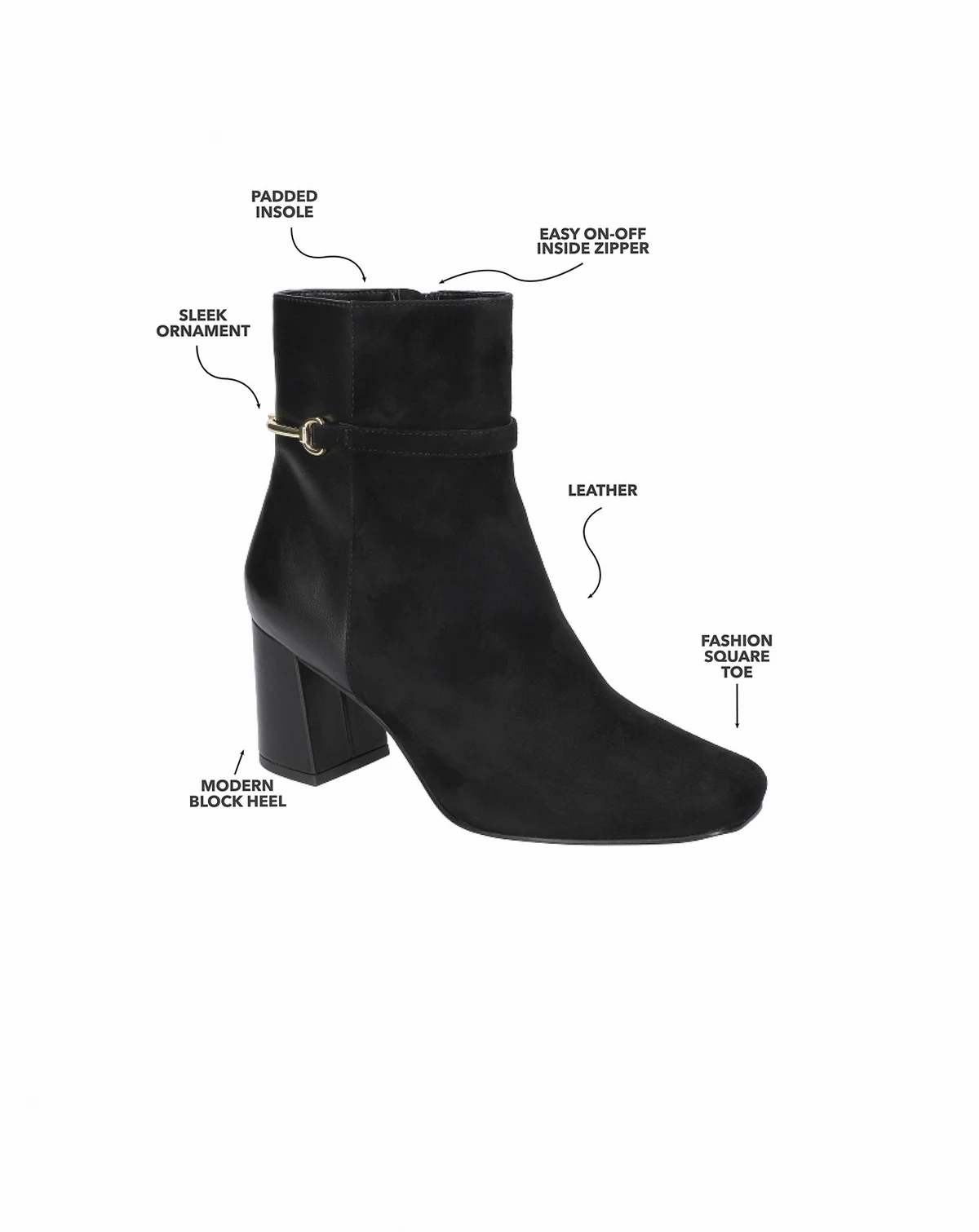 Square-toe booties continue to dominate the market. Not only does the Quincy by Bella Vita embody this sought-after look, but it also exudes a minimalist and sophisticated vibe, aligning perfectly with current trends. This block heel modern bootie radiates freshness with a contemporary bit ornament. Padded heel-to-toe with an inside zipper for easy on/off, you'll feel effortlessly fashionable and styled with the Quincy.