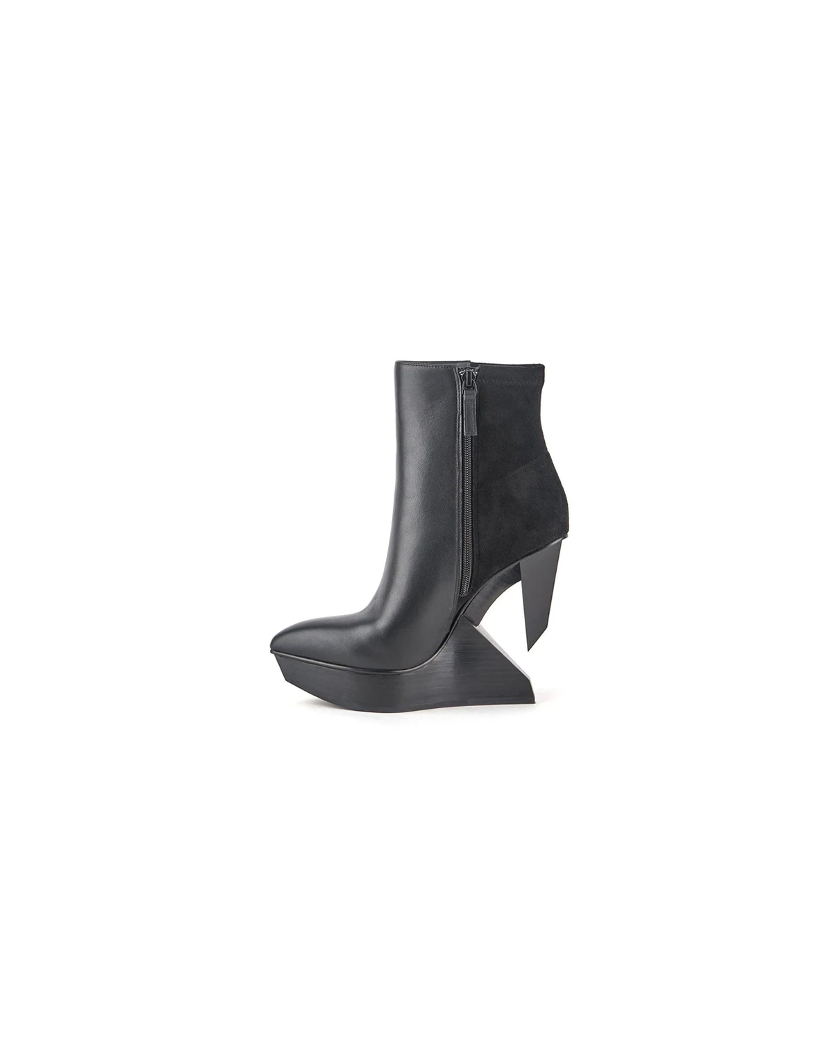 Designed to be noticed, the Edge Bootie is inspired by the hard shape of icicles for a daring yet elegant composition. Quality leather is used to construct the upper and lining. The floating heel is constructed using an ABS wedge supported with metal shanks and finished with a metallic finish.
