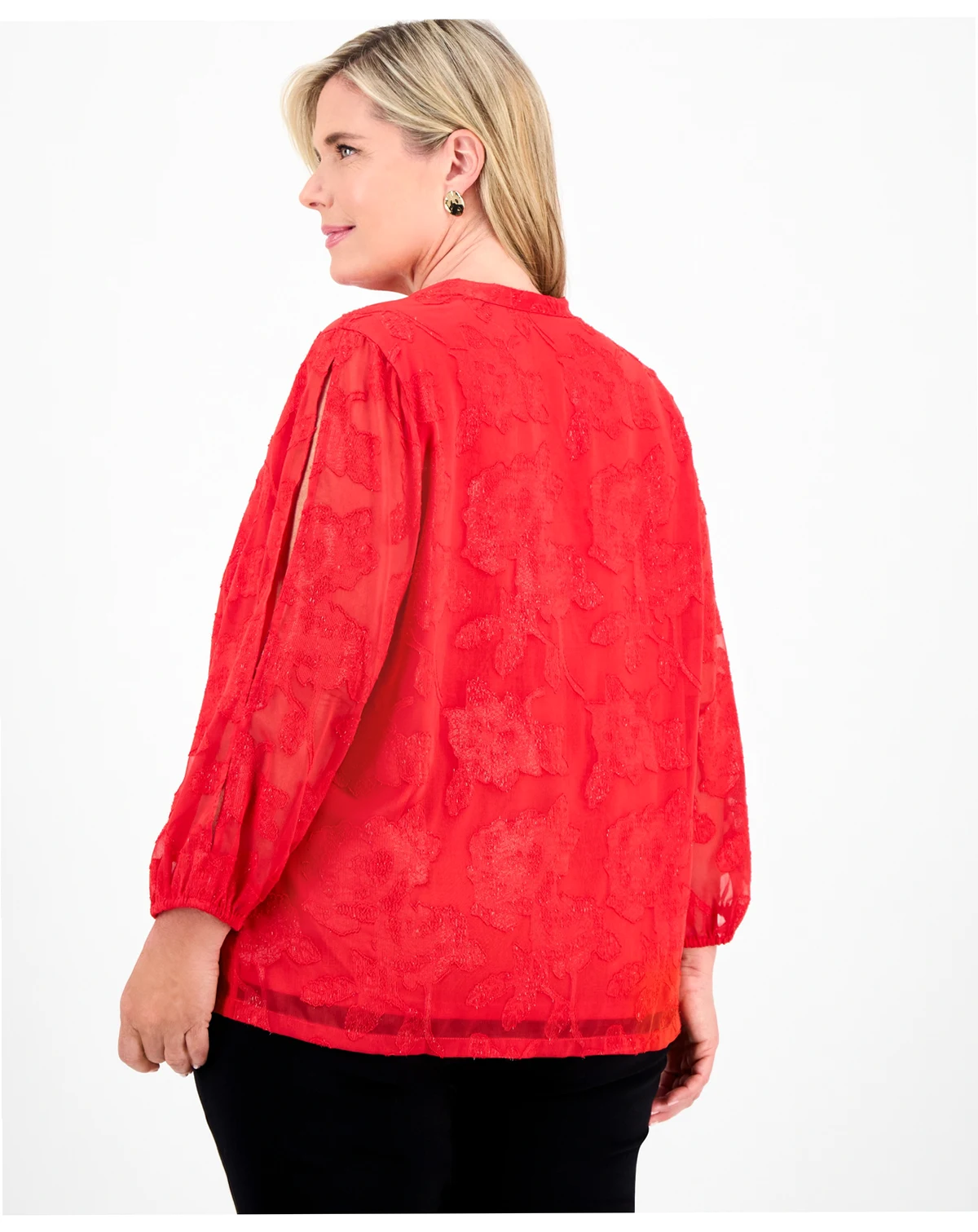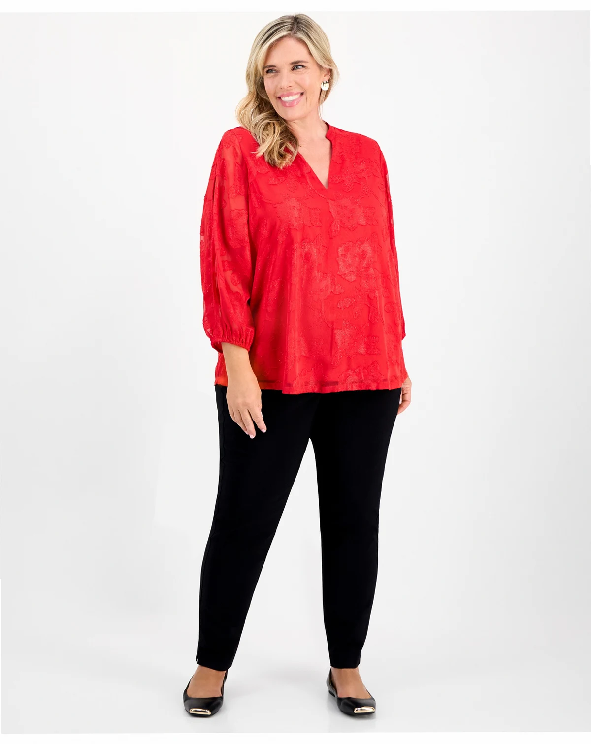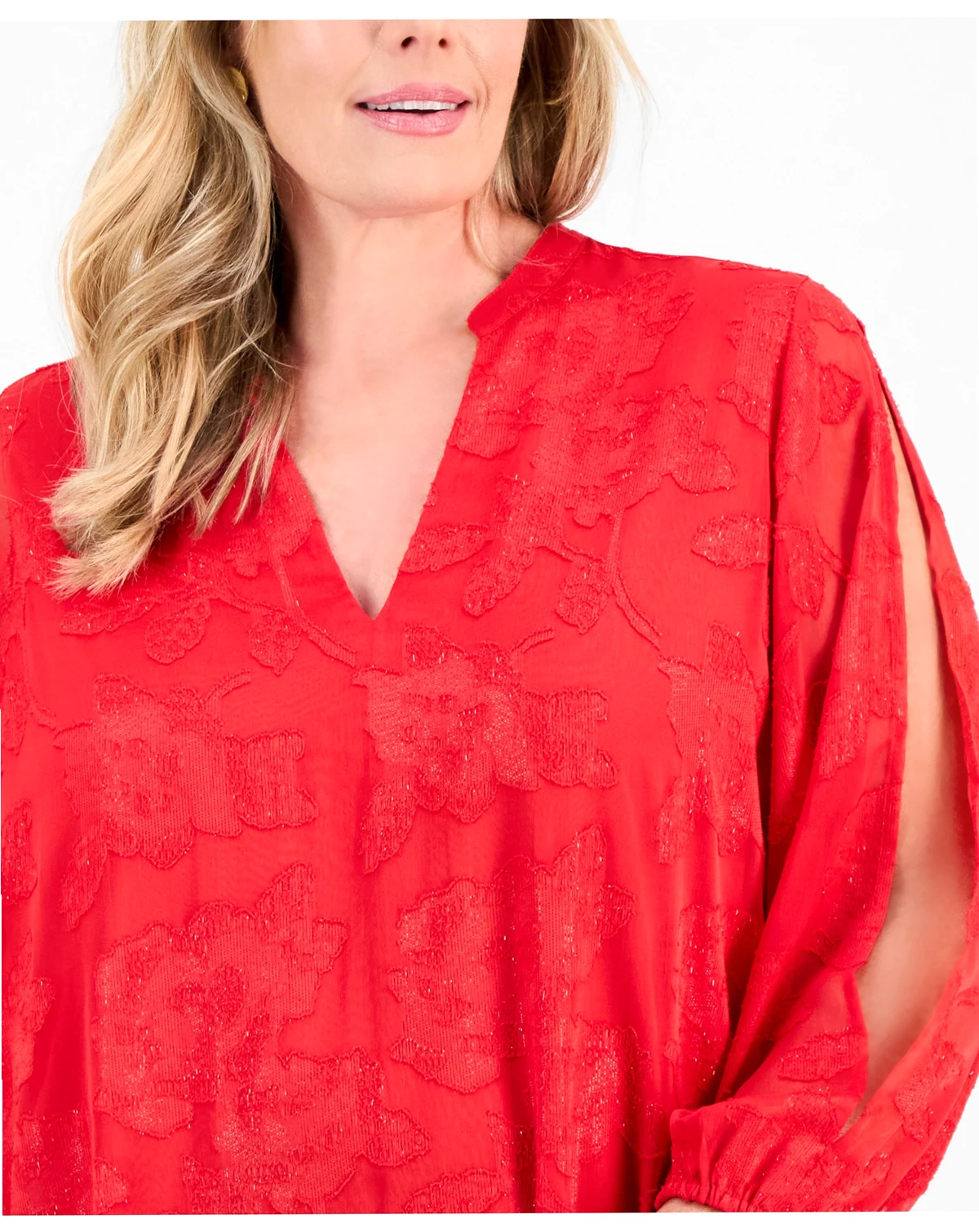 Shimmering with metallic threads woven through the burnout jacquard fabric and framed at the sides with graceful blouson sleeves, JM Collection's plus size blouse brings a fancier touch to your everyday outfits.