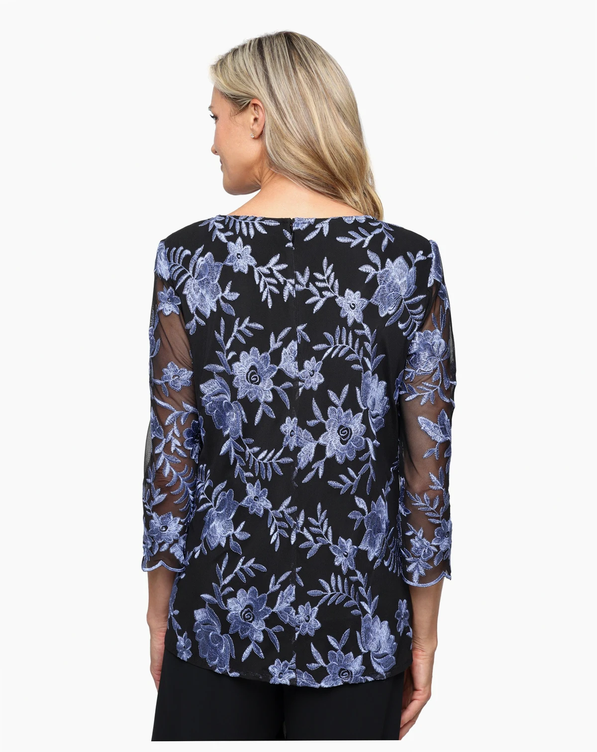 Enjoy versatile styling with this Alex Evenings top, designed as a mock twinset with an attached scallop detail jacket. The 3/4-sleeve length and power mesh fabric offer a contemporary look.