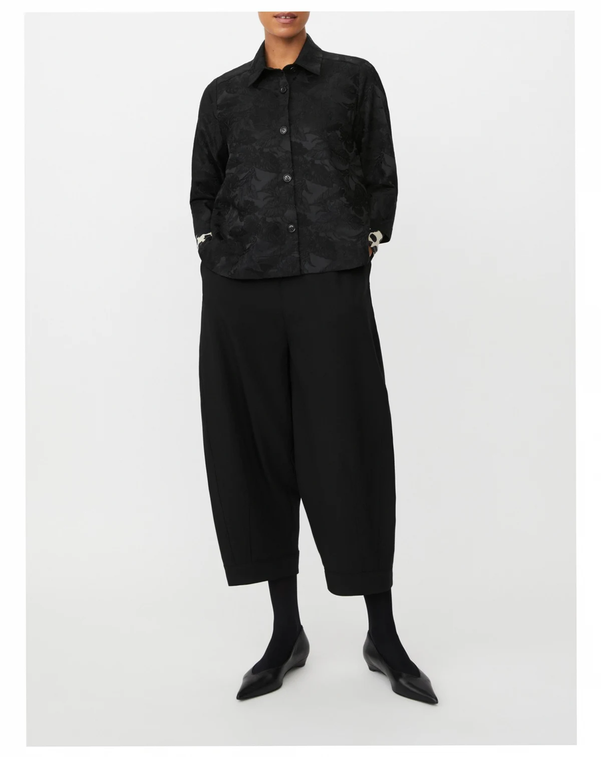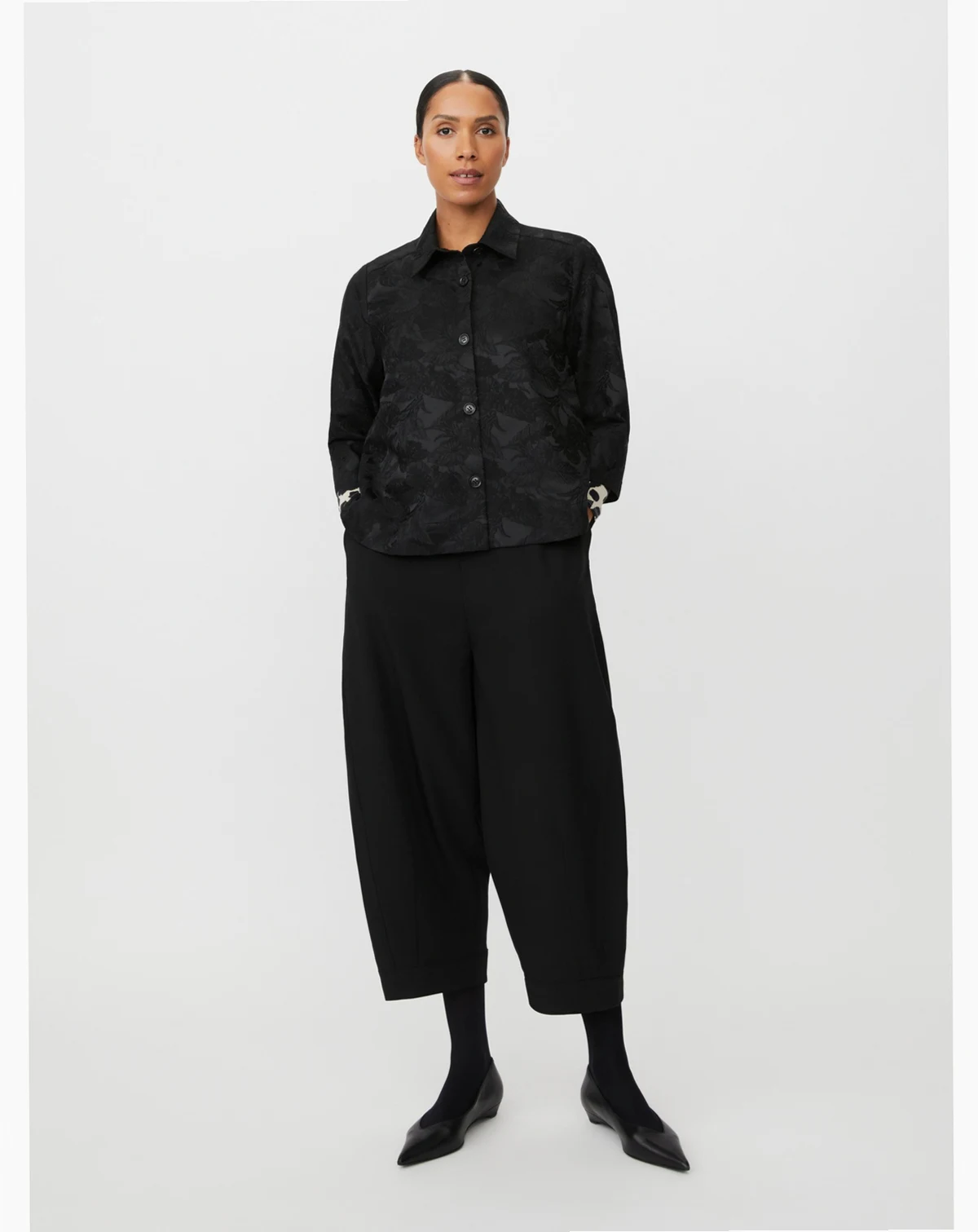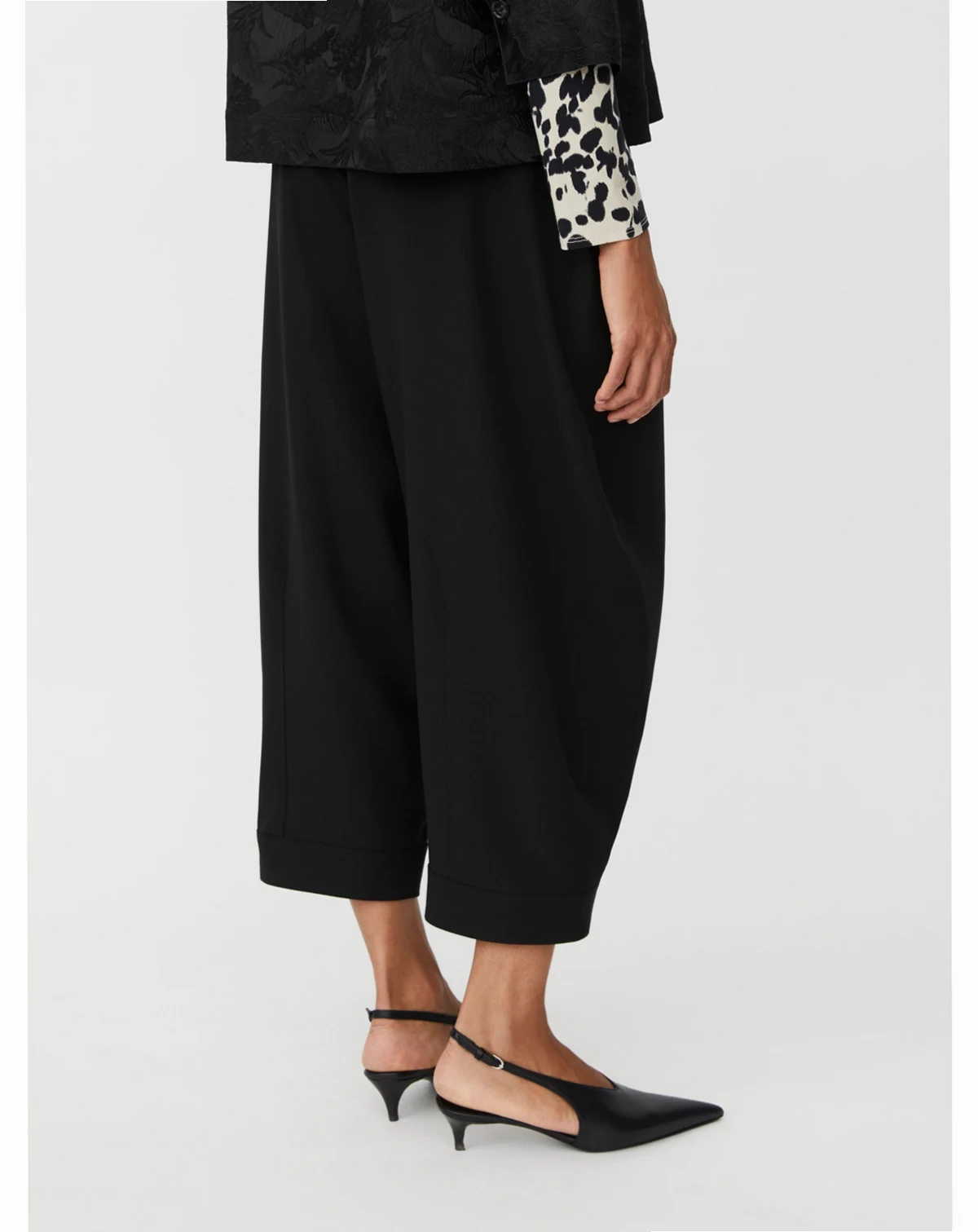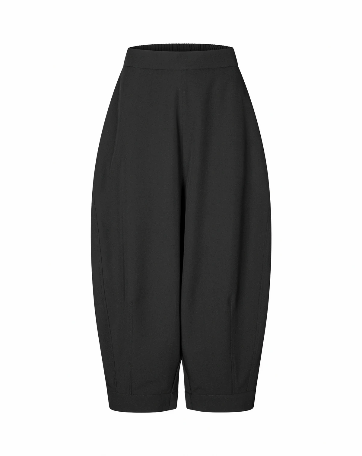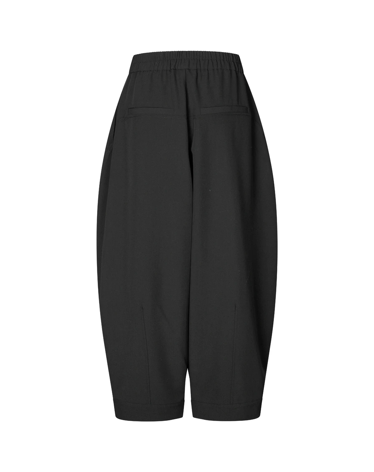 These trousers embody relaxed elegance with a soft fabric and flattering below-knee length. The close waist fit is enhanced by an elasticated back waistband, while wide, slightly tapered legs create a modern silhouette with comfort. Finished with discreet side slit pockets, polished back pockets, and a hidden side zip. Style effortlessly with a T-shirt for casual days or a feminine top for refined occasions.