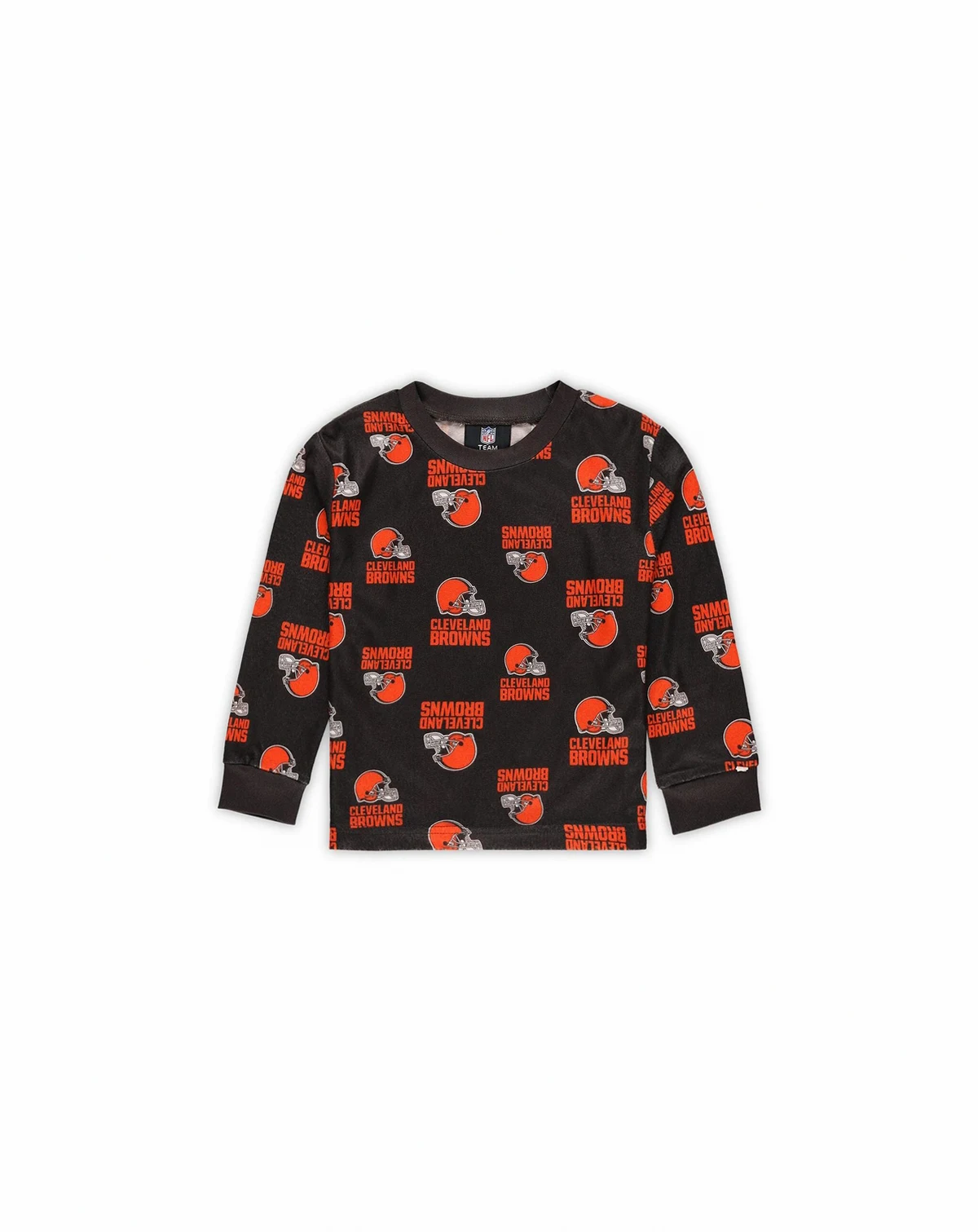 Wrap your little one in team spirit with this Cleveland Browns All-Over-Print Long Sleeve T-Shirt and Pants Sleep Set from Outerstuff. Featuring an all-over team logo print, this two-piece set includes a crew neck long sleeve T-shirt and pants to help you celebrate your team in style. The elastic waistband ensures a snug and comfy fit for a night of sweet dreams.