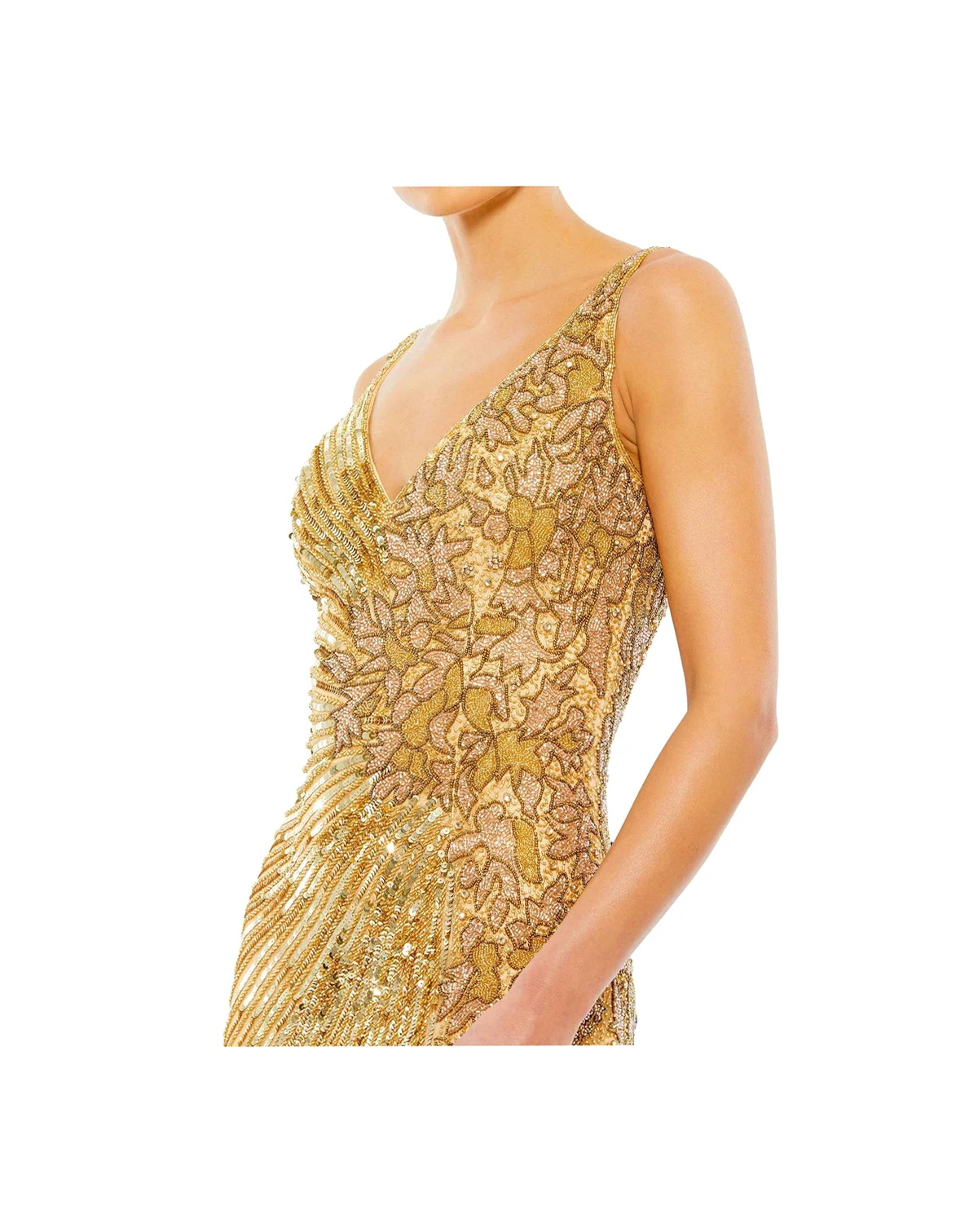 This stunning gown, adorned with intricate sequins and beads, ensures you shine at any event. The thigh-high slit and V-neckline add a sultry touch to this glamorous piece, making it perfect for turning heads and making a statement wherever you go.
