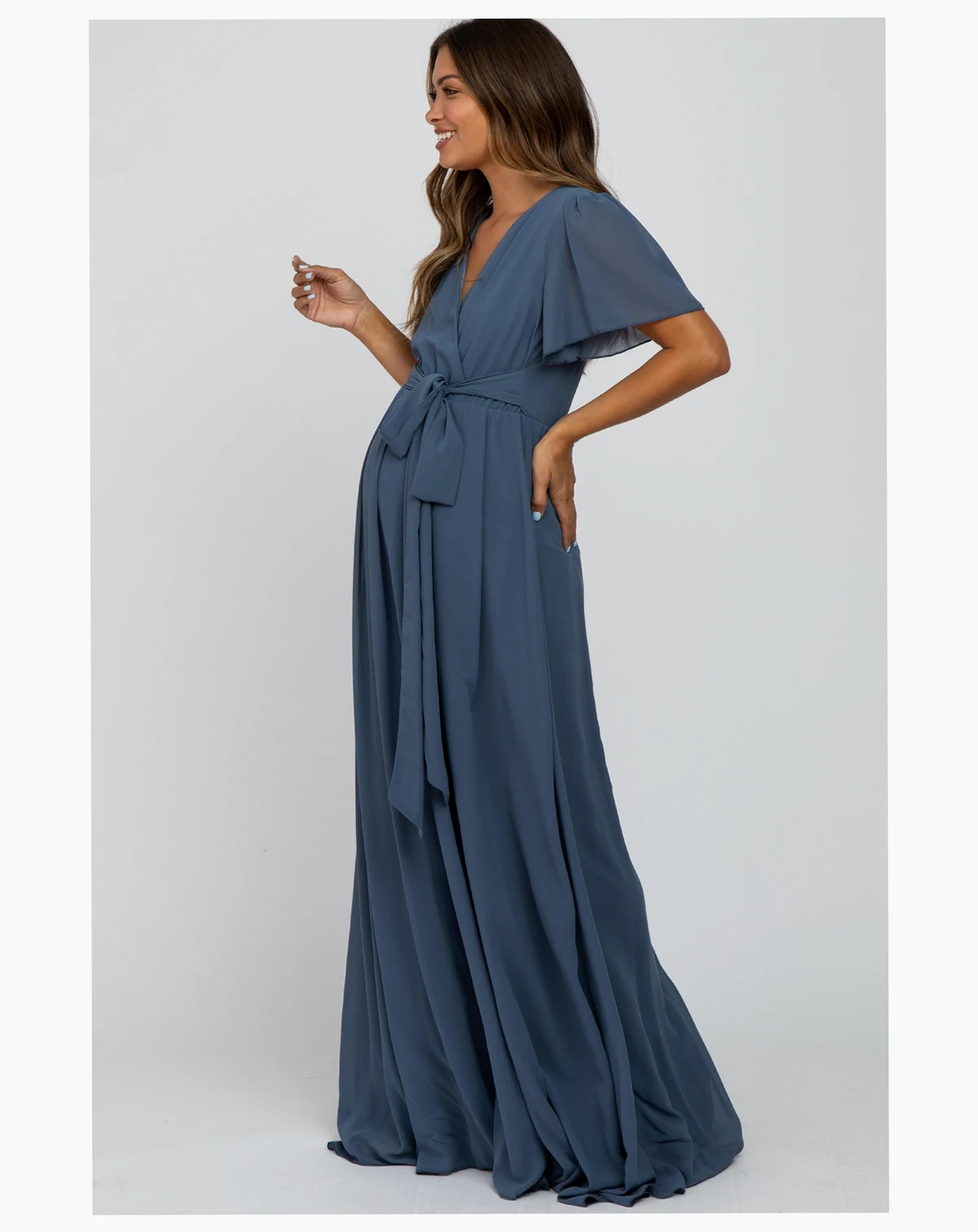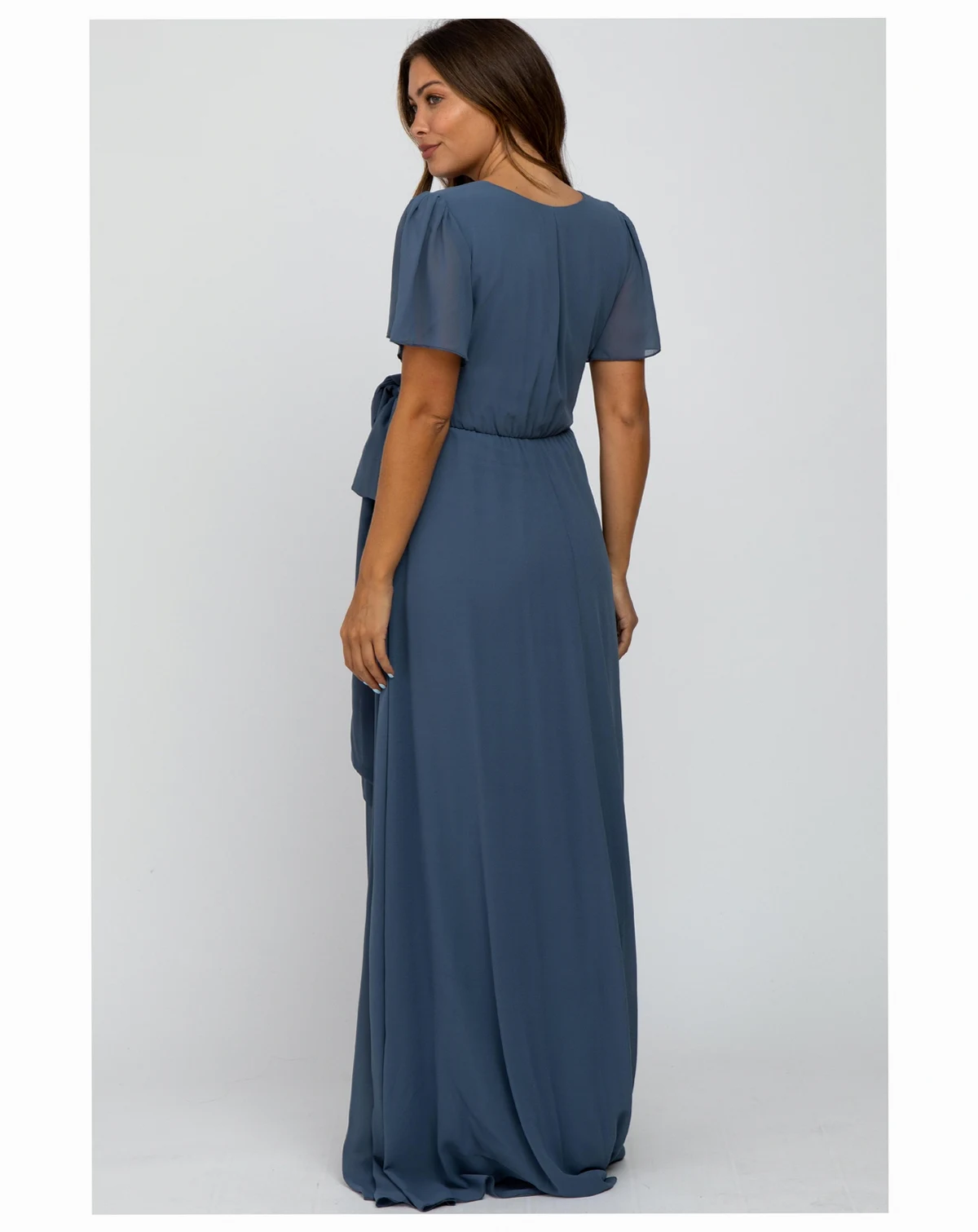 Elevate your maternity style with this chic Chiffon Short Sleeve Maternity Maxi Dress. Crafted from lightweight, breezy chiffon, this dress features flowy short sleeves and a flattering empire waist to beautifully accommodate your growing bump. The full-length skirt offers graceful movement, perfect for special occasions or everyday elegance. Designed for comfort and versatility, it s easy to dress up with heels for events or pair with sandals for a casual look. Look and feel radiant throughout your pregnancy with this timeless, must-have maxi dress!