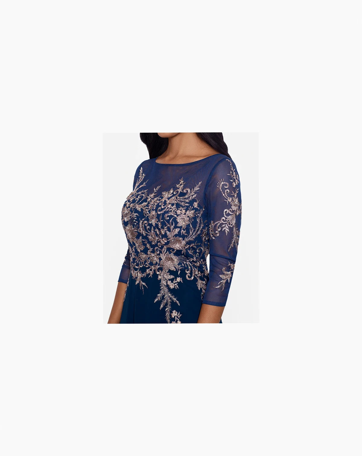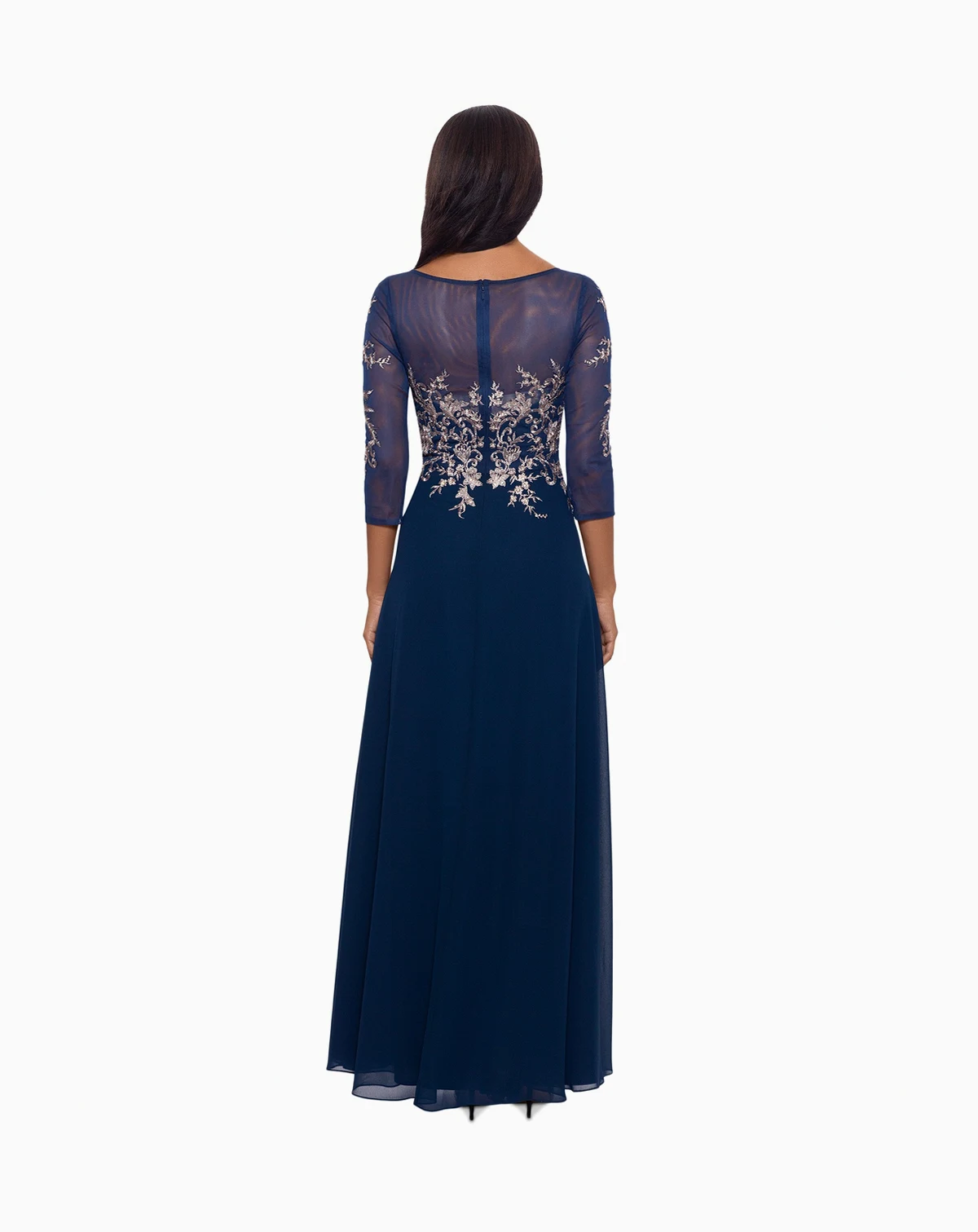 Betsy & Adam merges modern and timeless with this gorgeous gown, an elegantly embroidered design framed with contemporary 3/4-length sleeves and finished with a flowing skirt.