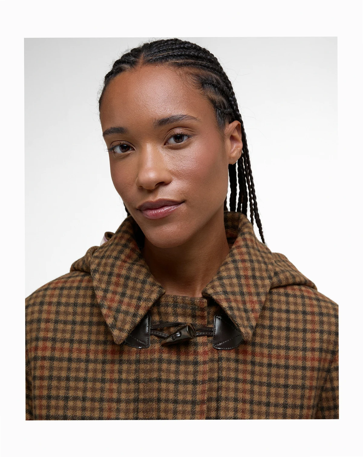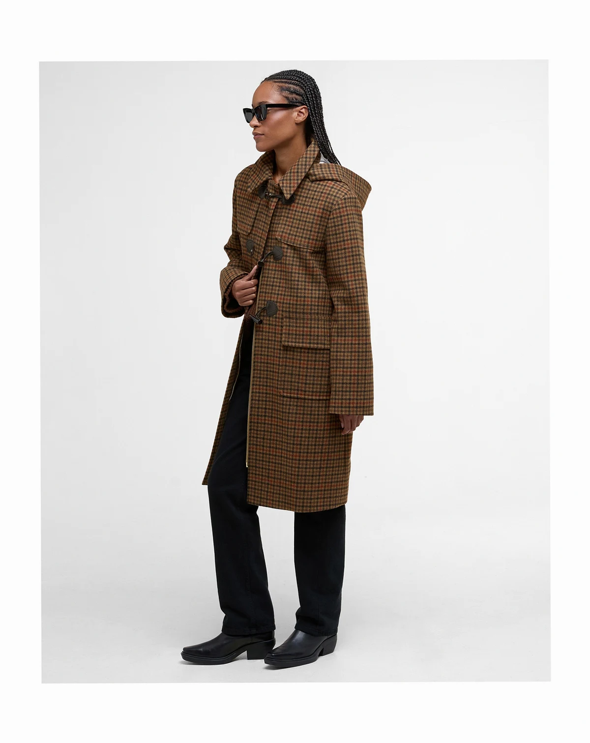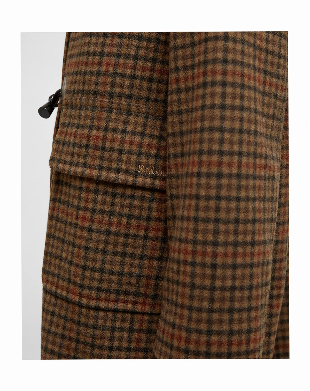 The Melody coat from Barbour is all kinds of stylish in a checkered print and fashioned with toggles at the center front. A button-off hood completes the cozy look.