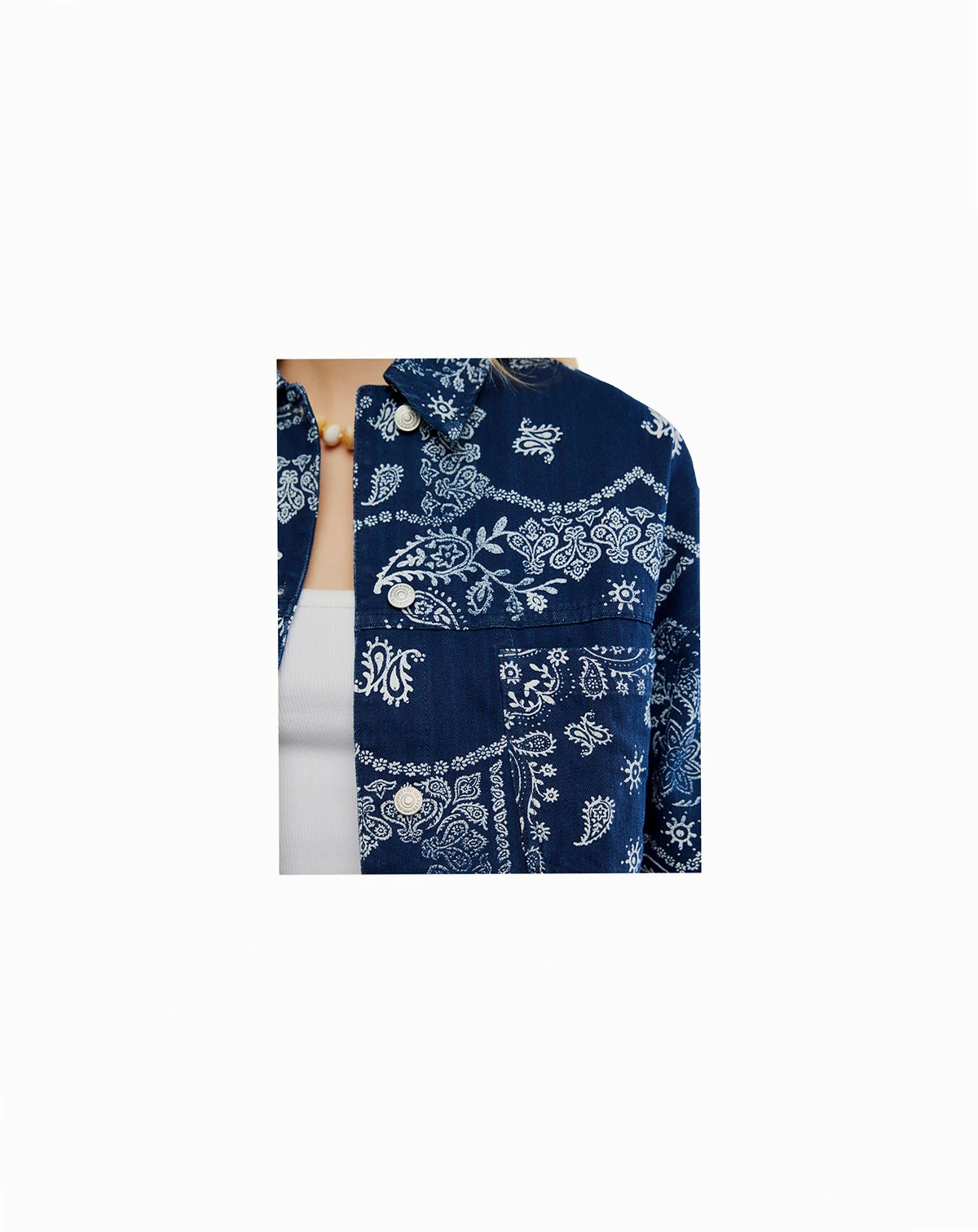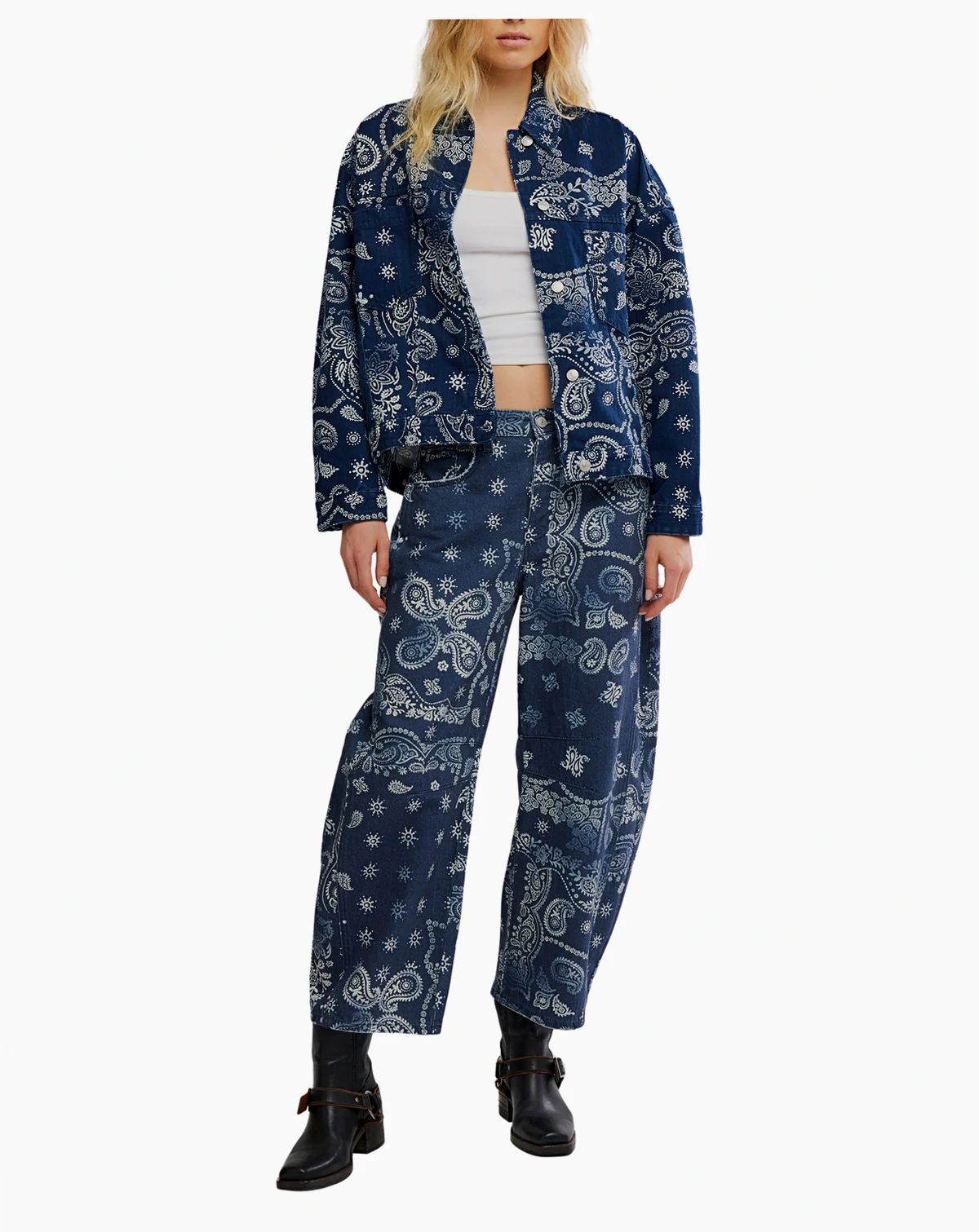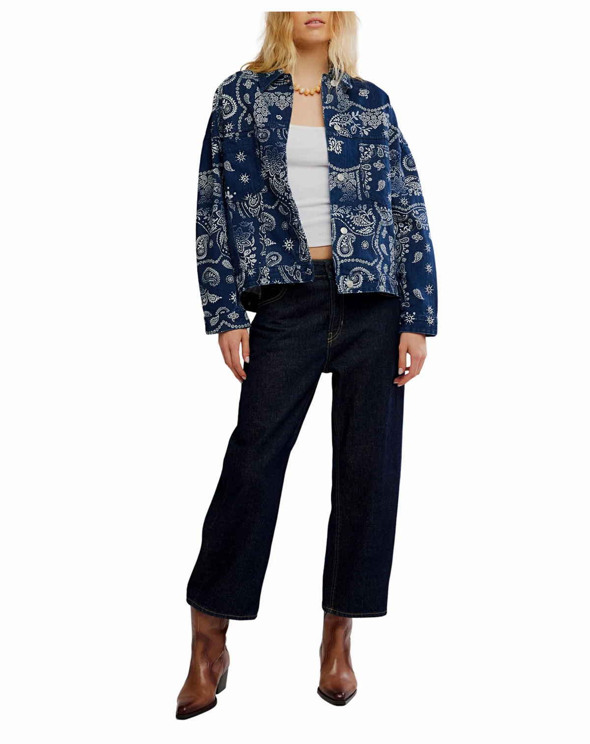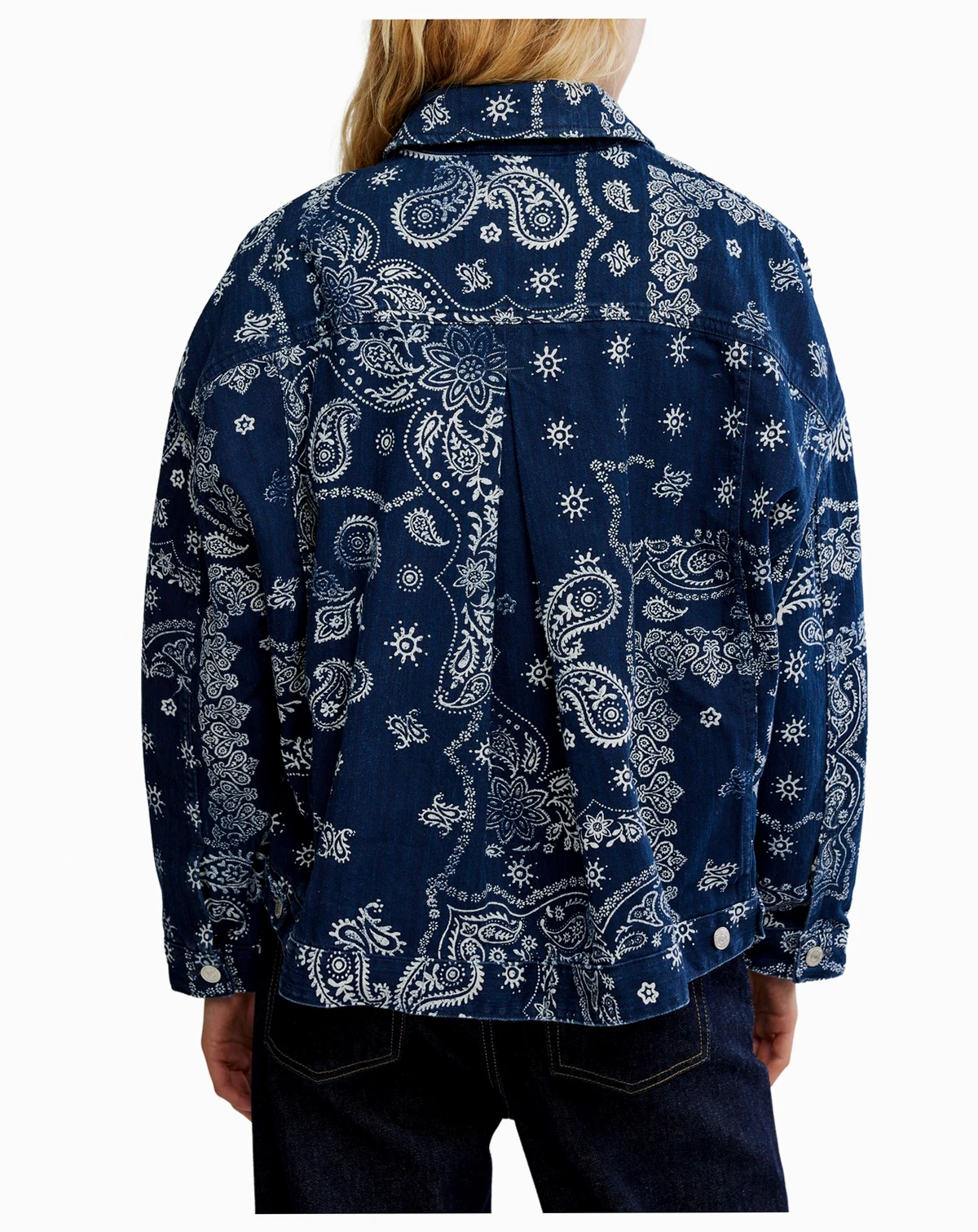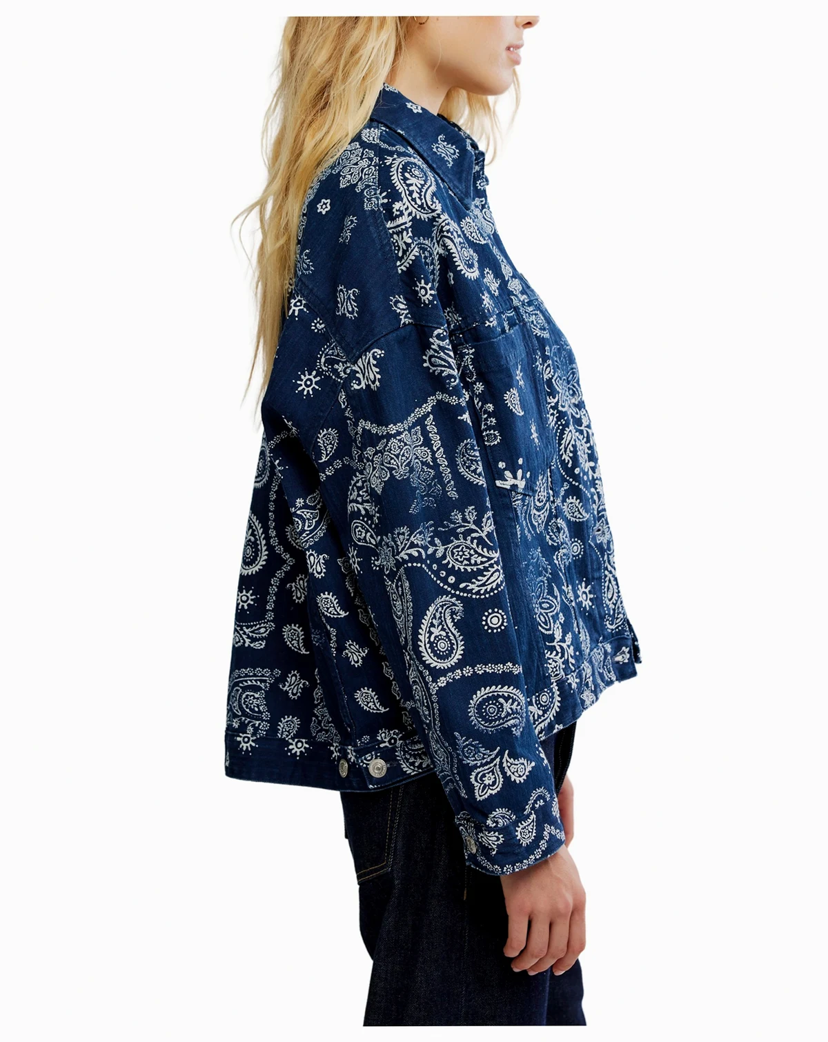 Elevate your ensemble with this Free People Opal Swing printed denim jacket, featuring dropped shoulders. Defined pleating at the back adds a swingy touch, creating a cool and distinctive look. ABOUT THE BRAND: If you love the laid-back charm of boho-chic apparel, you'll find a beautiful selection from Free People at Macy's that suits your style. From ultra-feminine dresses to cute tops, browse the collection of casual, hip designs.