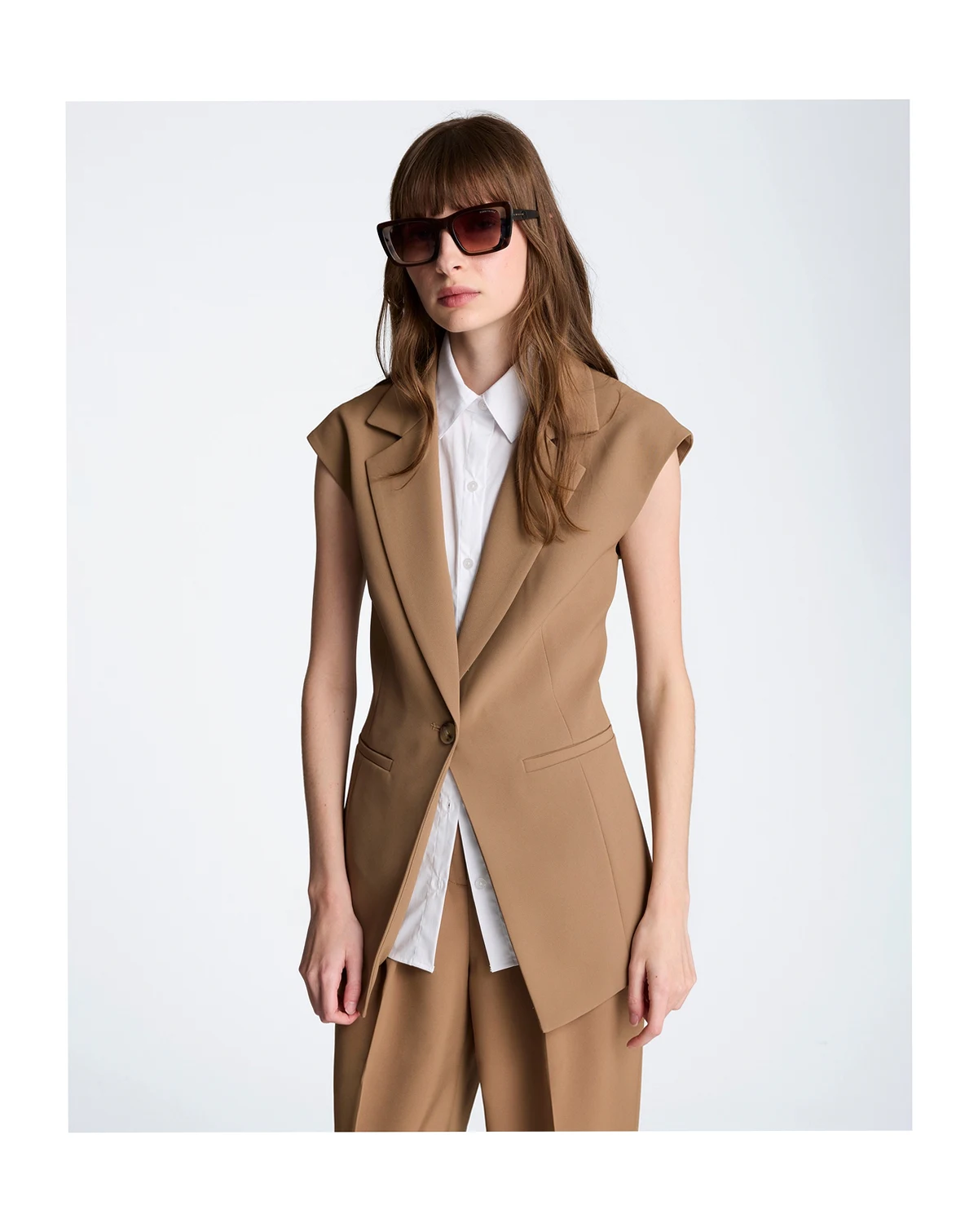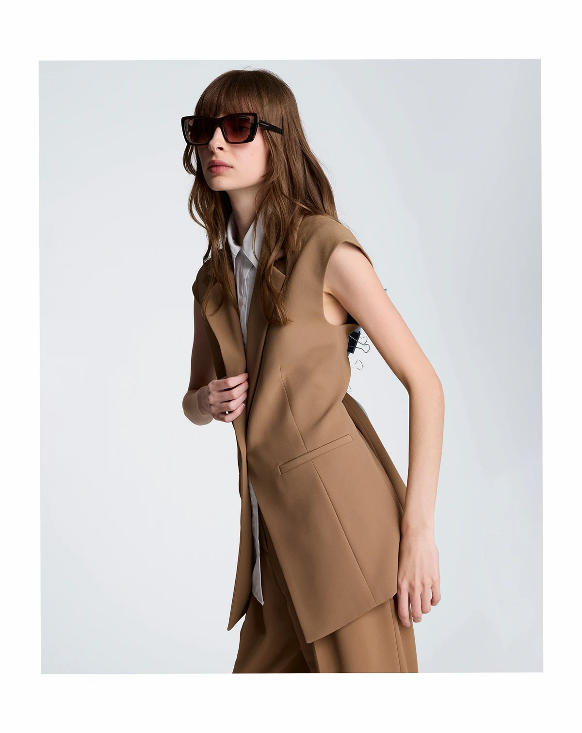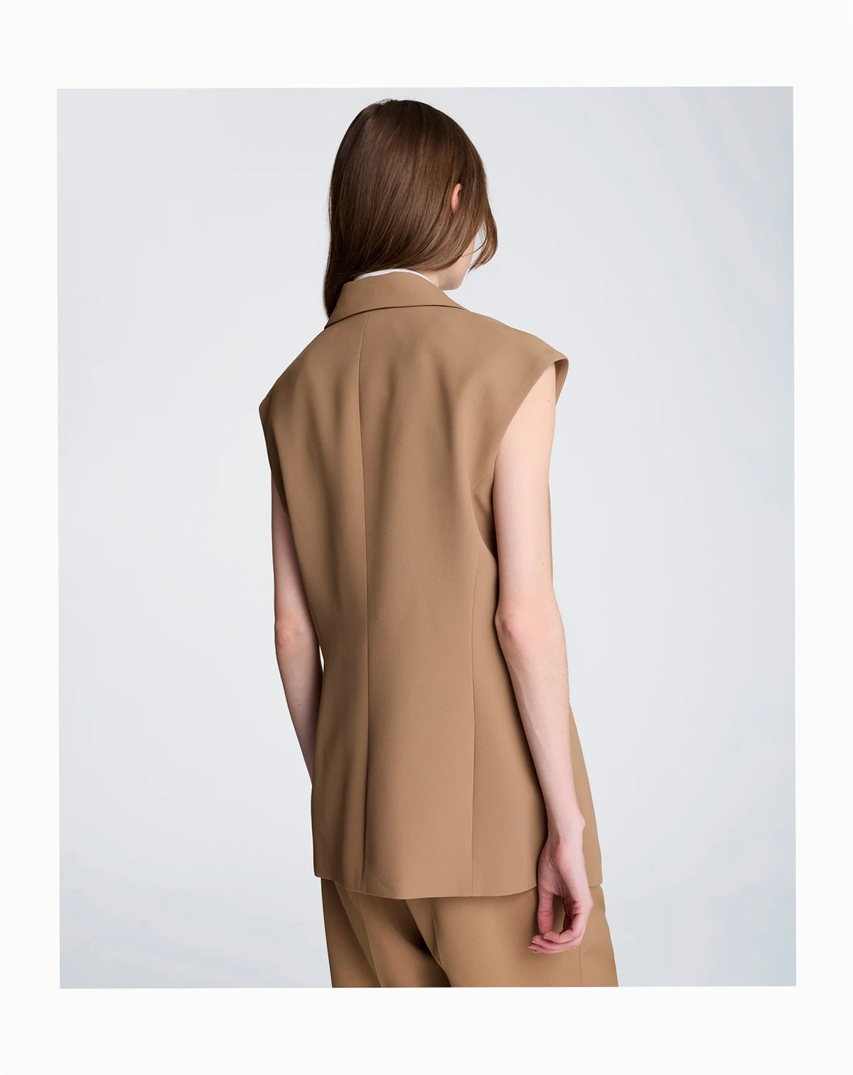 Layer with tailored versatility using this Kenneth Cole Luxe twill vest, designed to transition seamlessly across looks. A notch collar, detachable faux shirt inserts, and hip besom pockets add structure and polish to the sleeveless design.