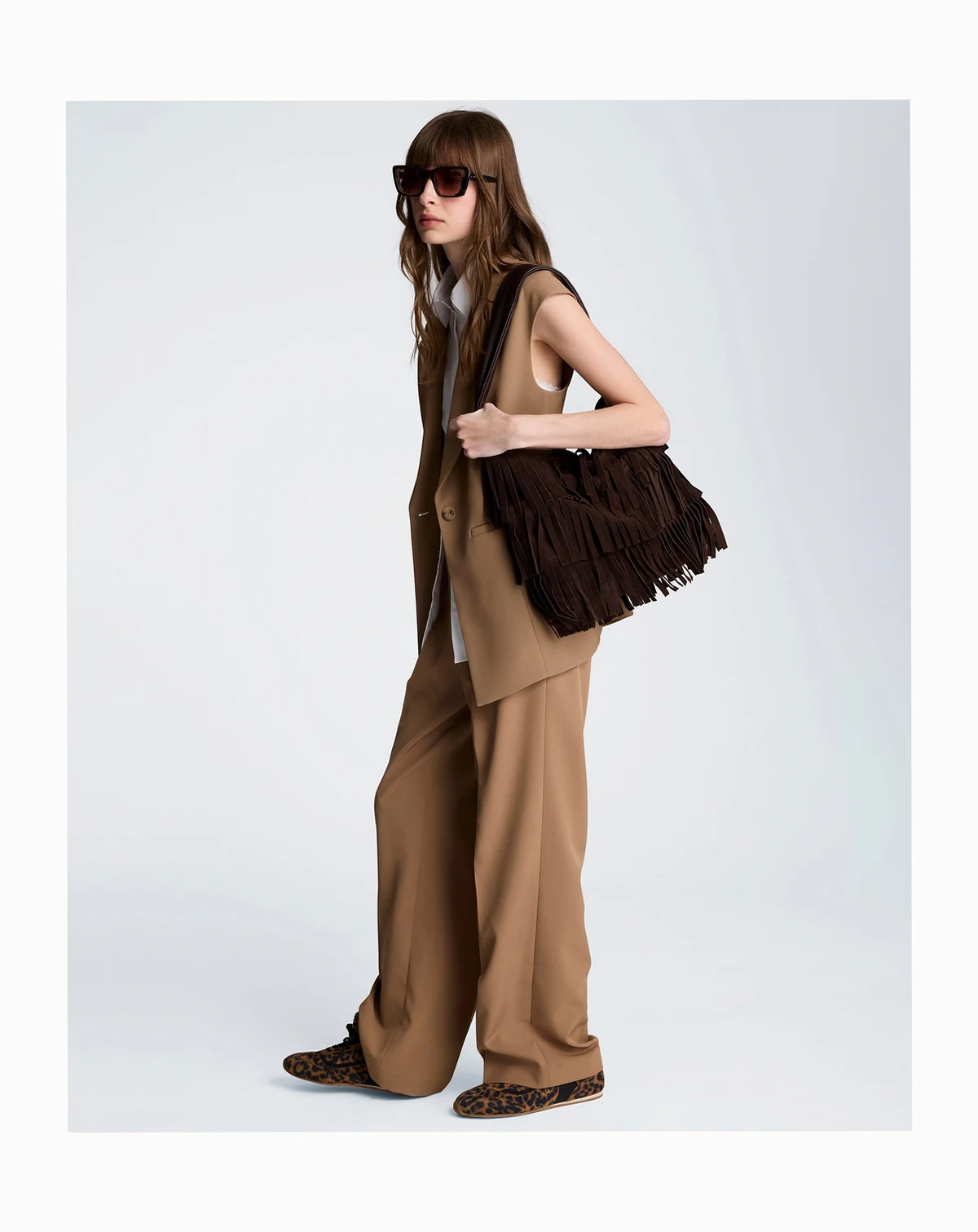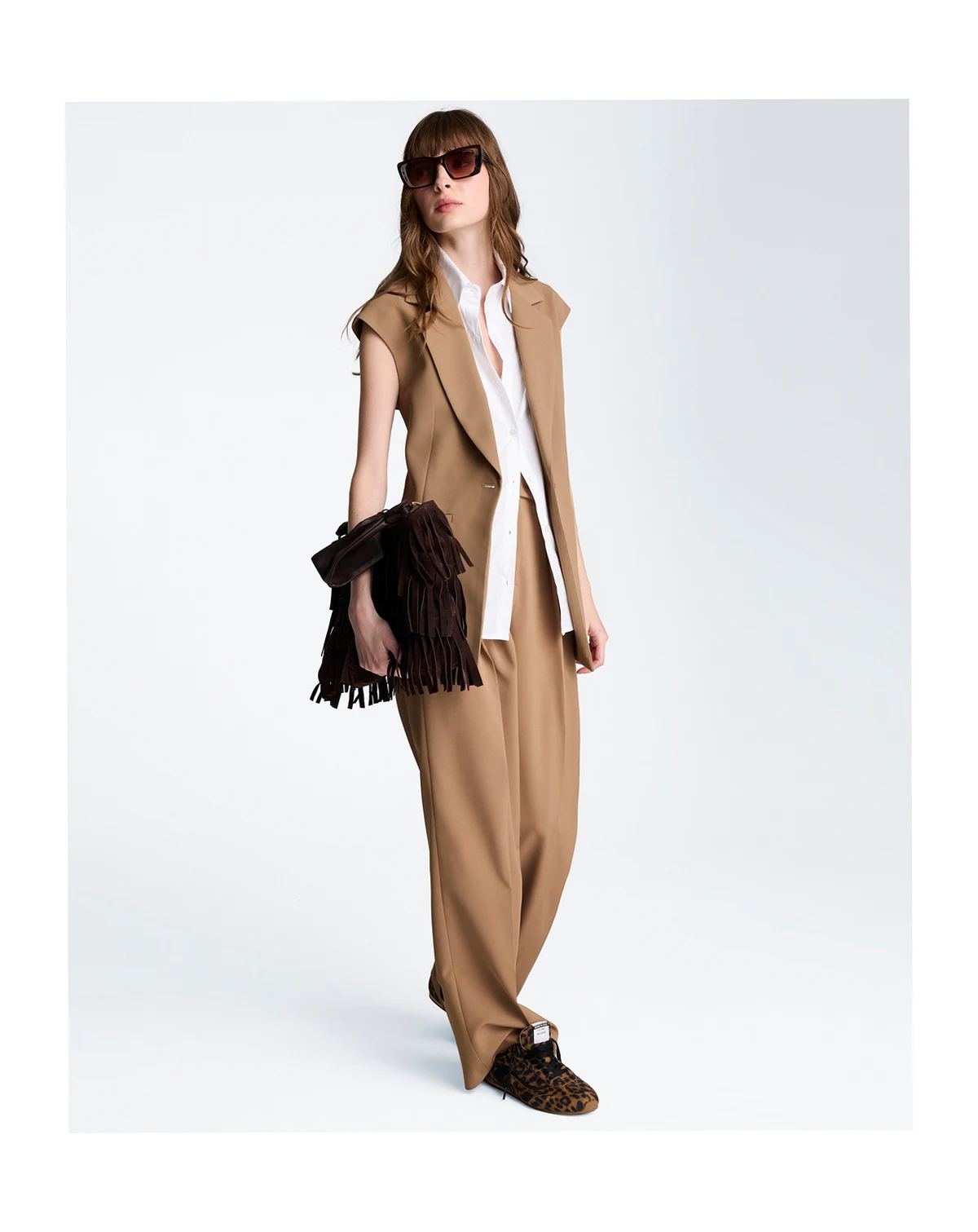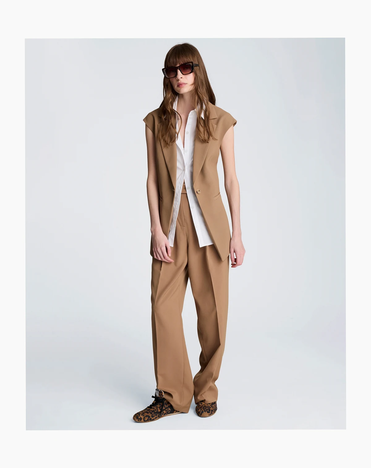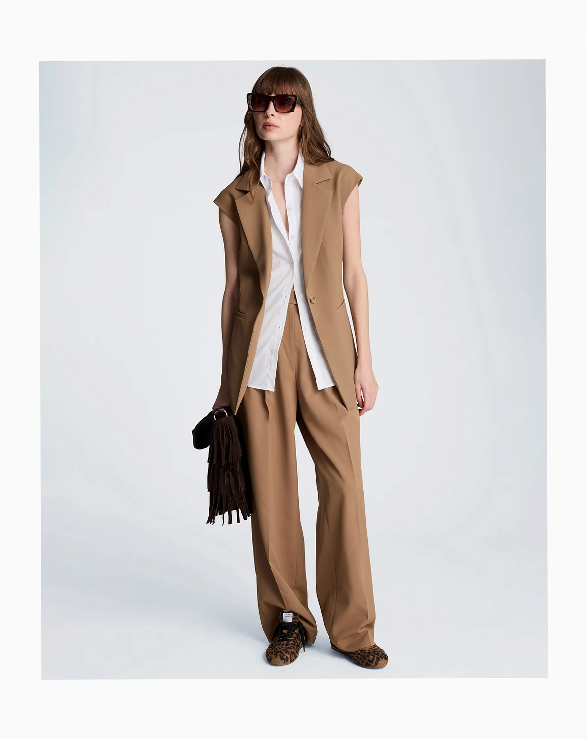 Layer with tailored versatility using this Kenneth Cole Luxe twill vest, designed to transition seamlessly across looks. A notch collar, detachable faux shirt inserts, and hip besom pockets add structure and polish to the sleeveless design.