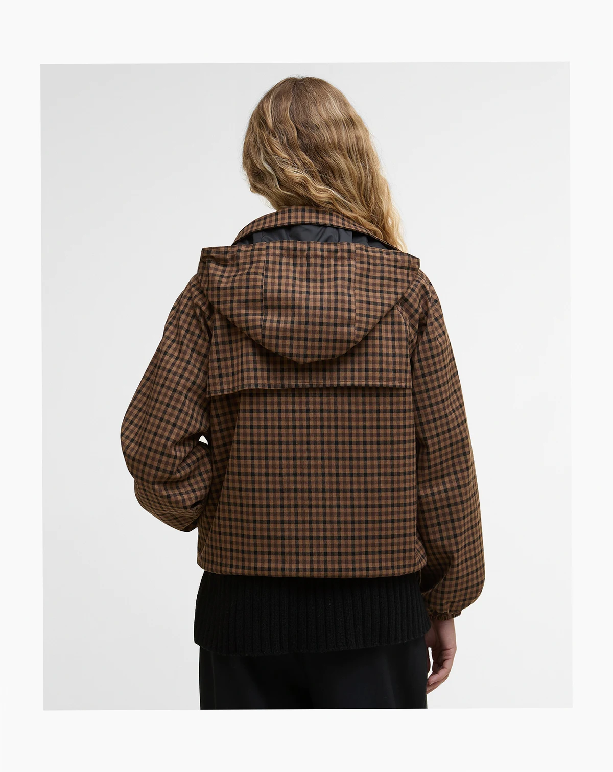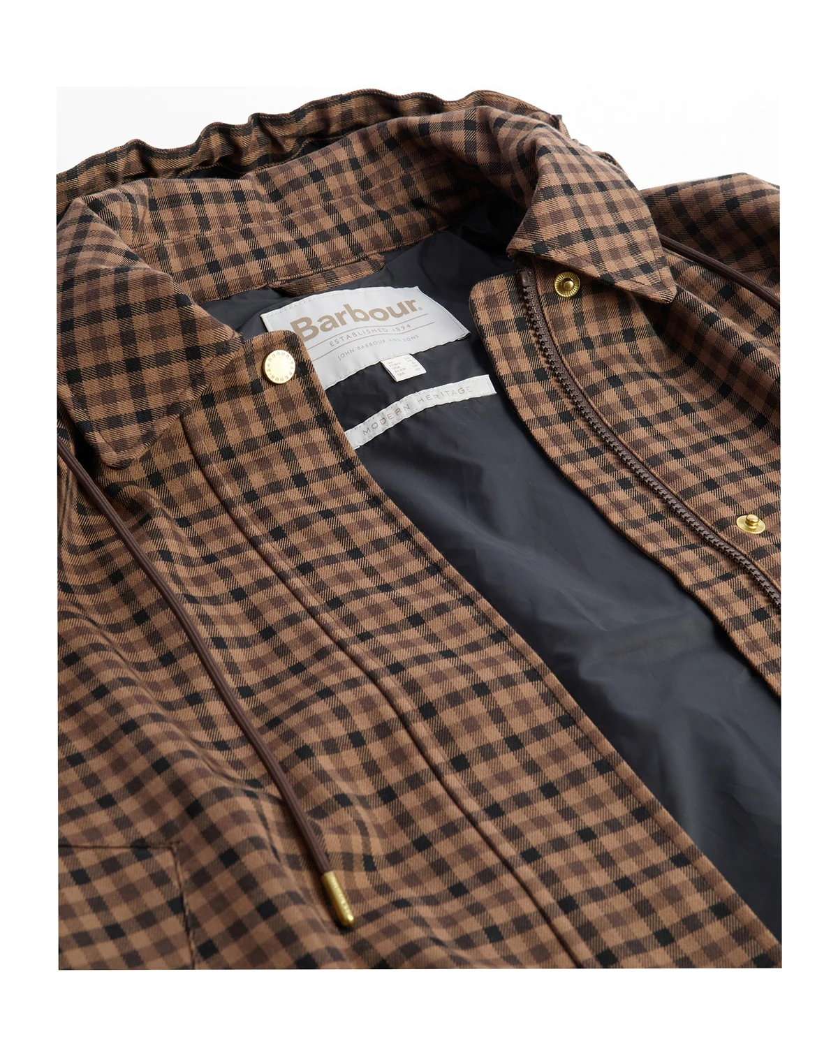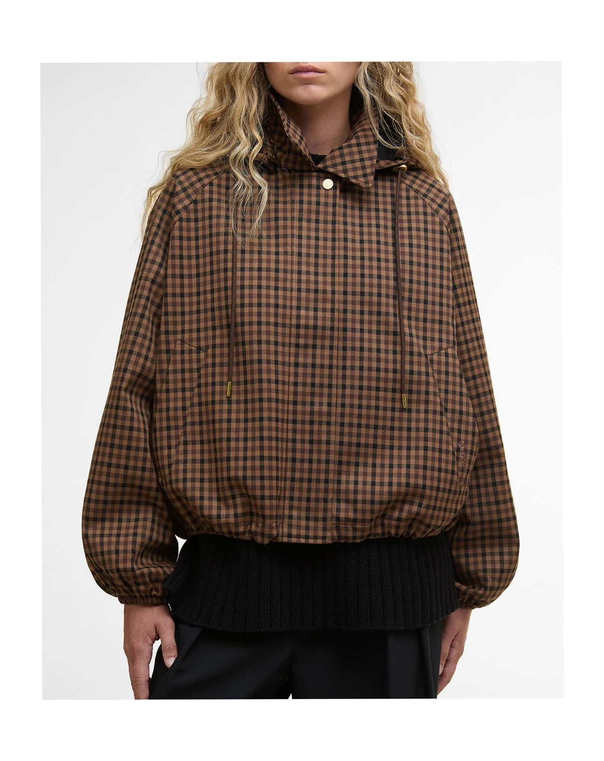 Barbour's checkered bomber-style jacket is cleverly designed with a snap-off hood and water-resistant finish.