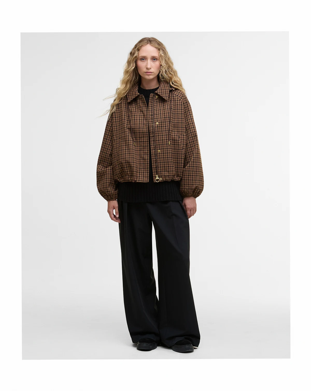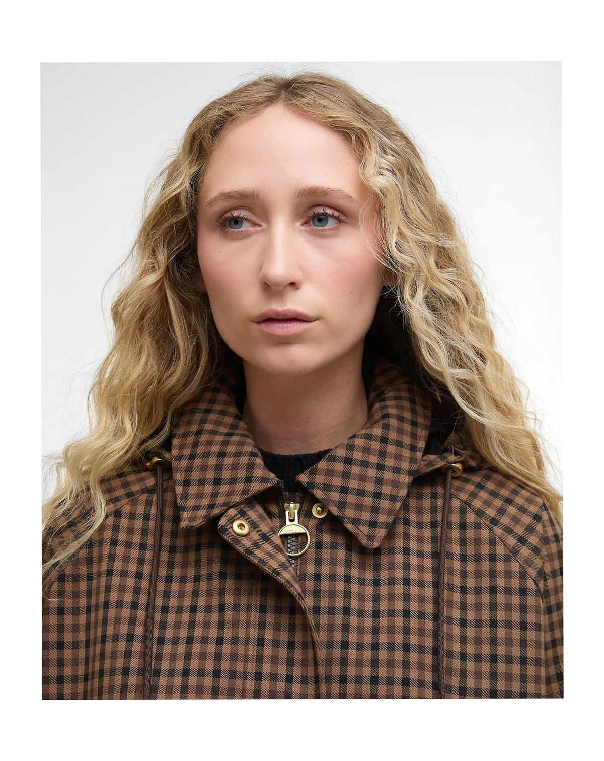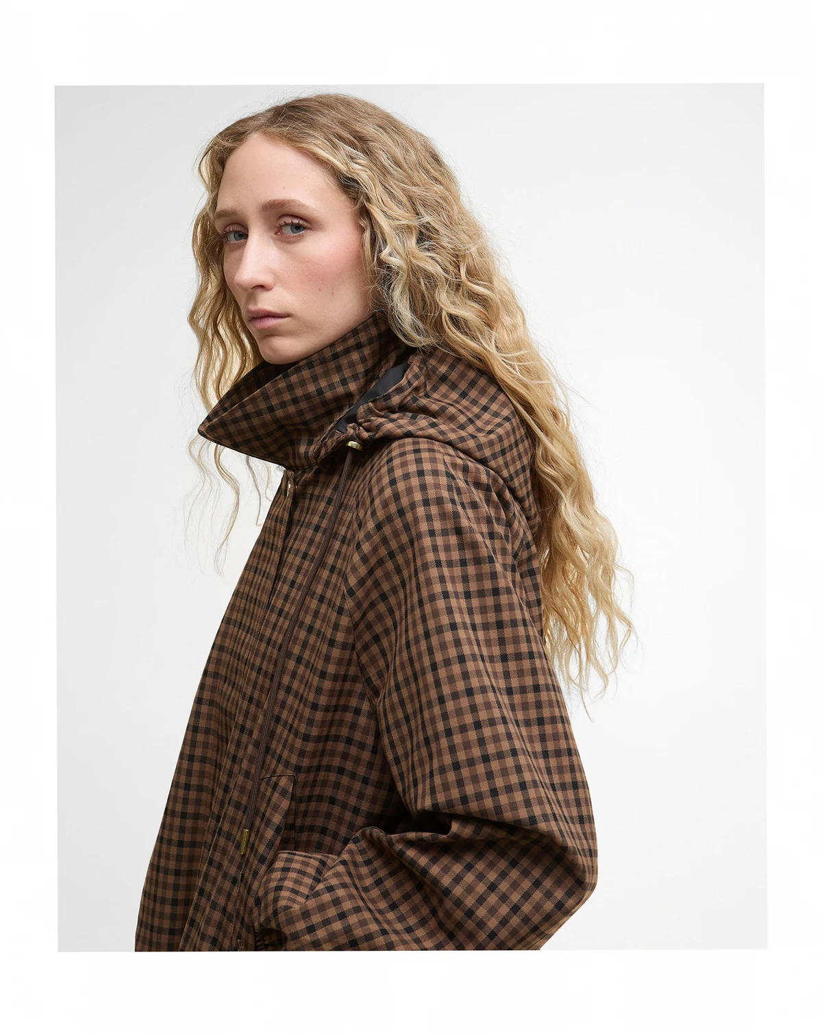 Barbour's checkered bomber-style jacket is cleverly designed with a snap-off hood and water-resistant finish.