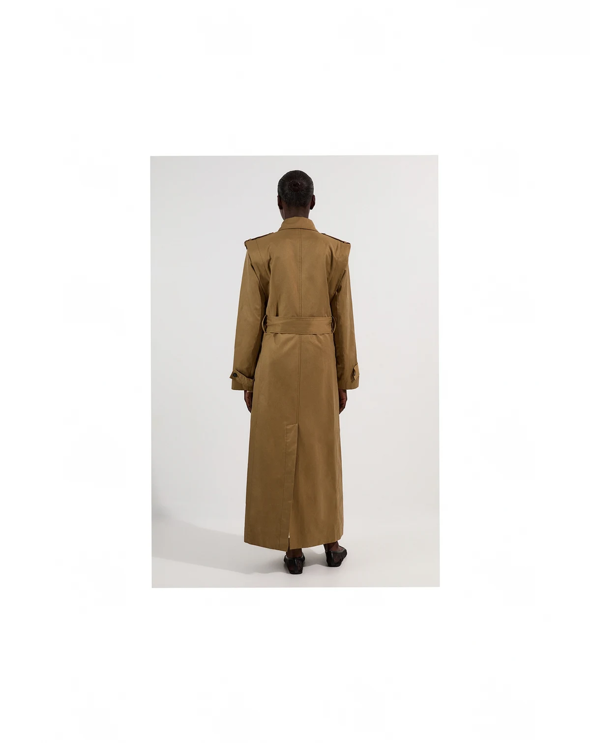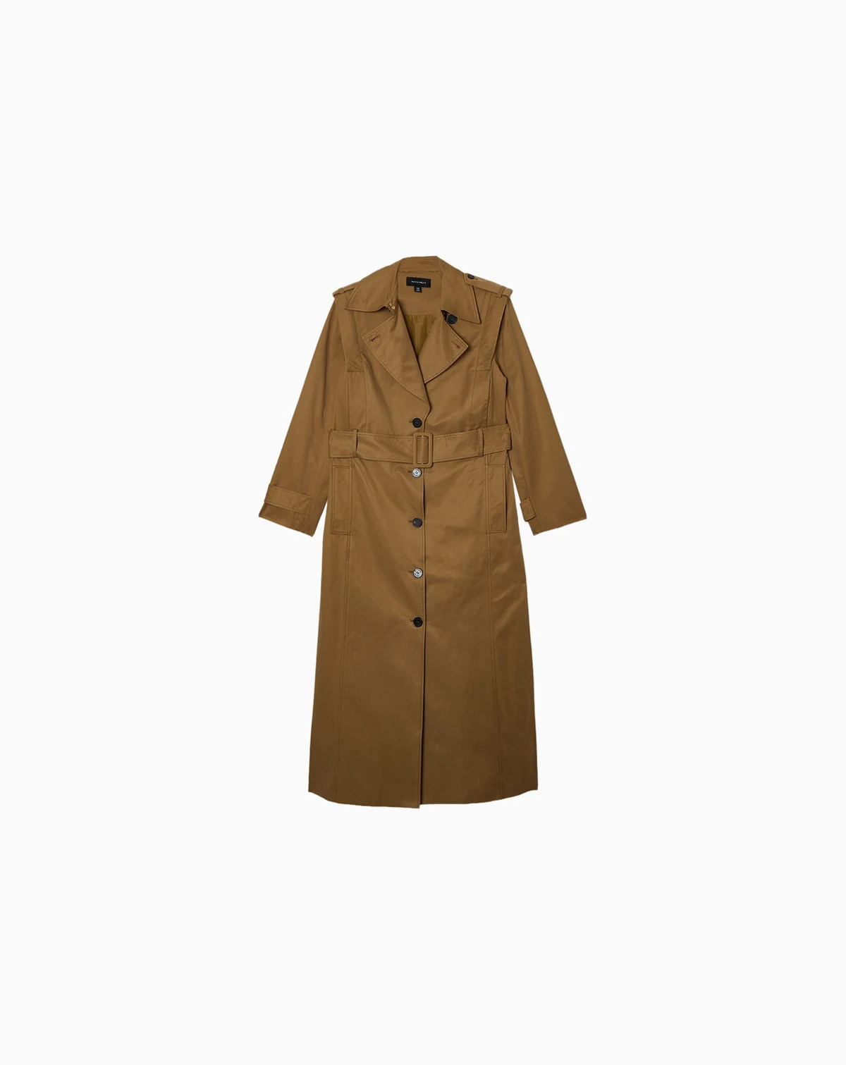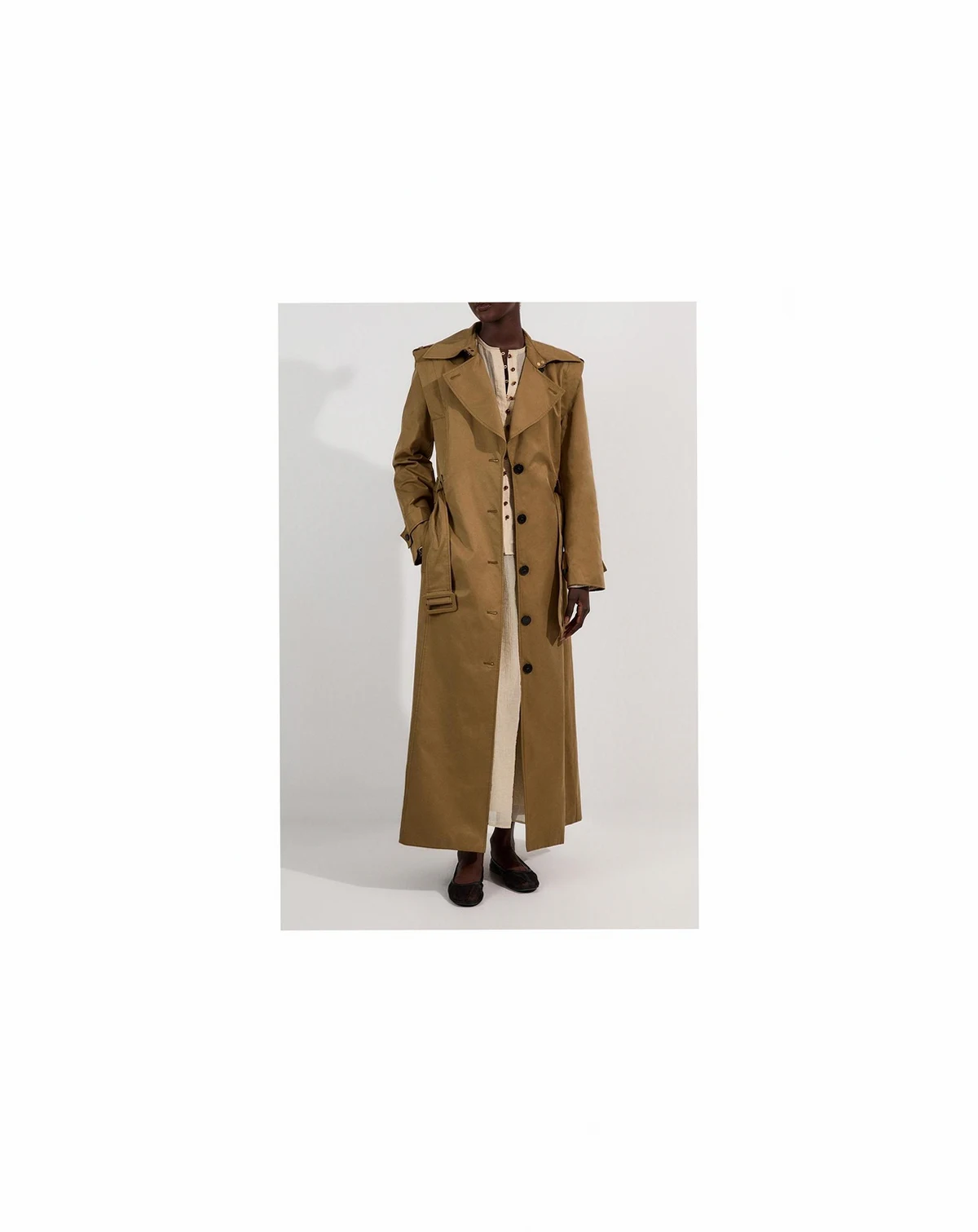 Dramatic strong shoulder design creates a structured, contemporary silhouette. Adjustable belted waist for a customised fit and defined shape. Full-length maxi cut offers maximum coverage and timeless appeal. Classic trench coat styling with traditional collar and button-through front. Crafted from 100% cotton for breathable comfort and durability.