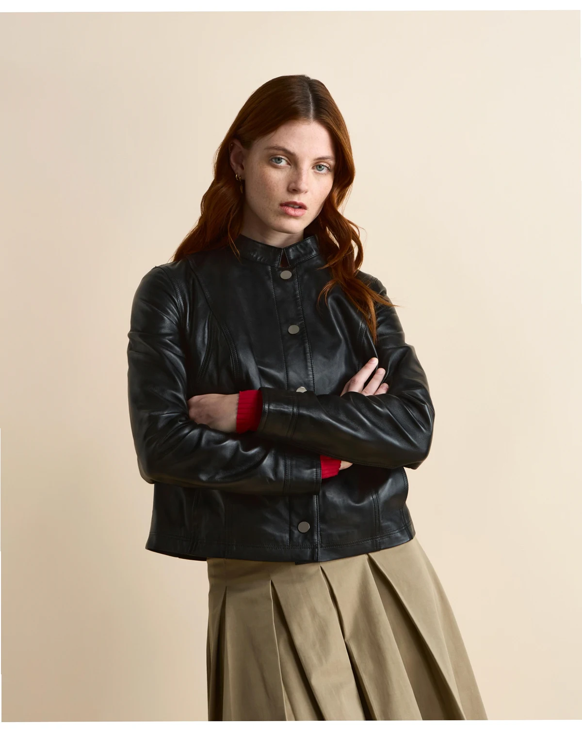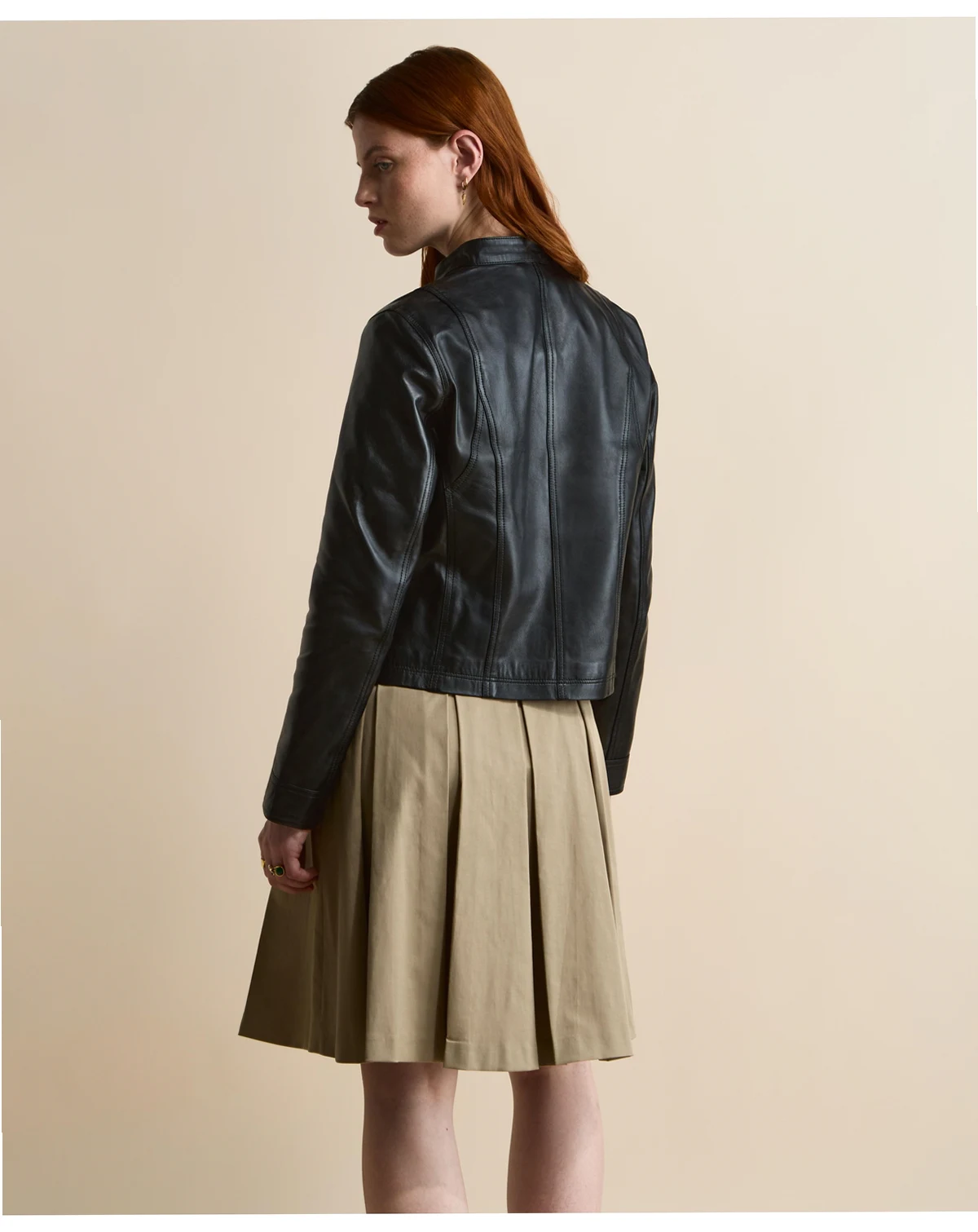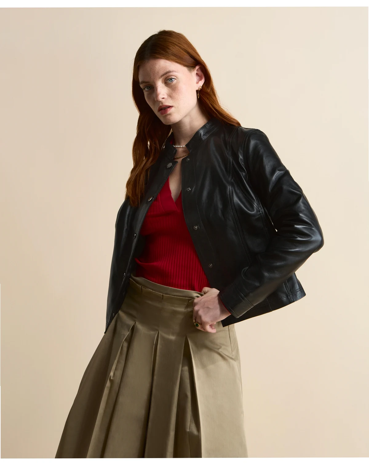 Sleek, sculpted, and endlessly versatile, our Leather Stand-Collar Jacket in black blends modern minimalism with refined tailoring. Crafted from premium British leather, this piece brings subtle elegance to your spring wardrobe.