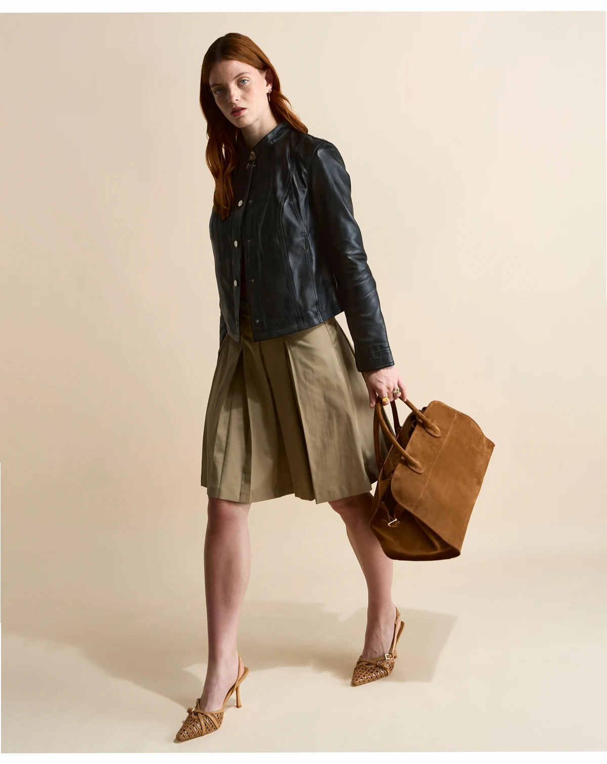 Leather; Hand-crafted from Genuine Premium British Leather, ensuring luxury and durability.; Style Tip: Layer it over a cotton blouse and faded denim for an effortlessly elevated day look—or style it with a satin midi skirt for unexpected evening chic. Style: BN0225-NAP-BLK Model Height: 5 11” | Bust: 32” | Waist: 24”
