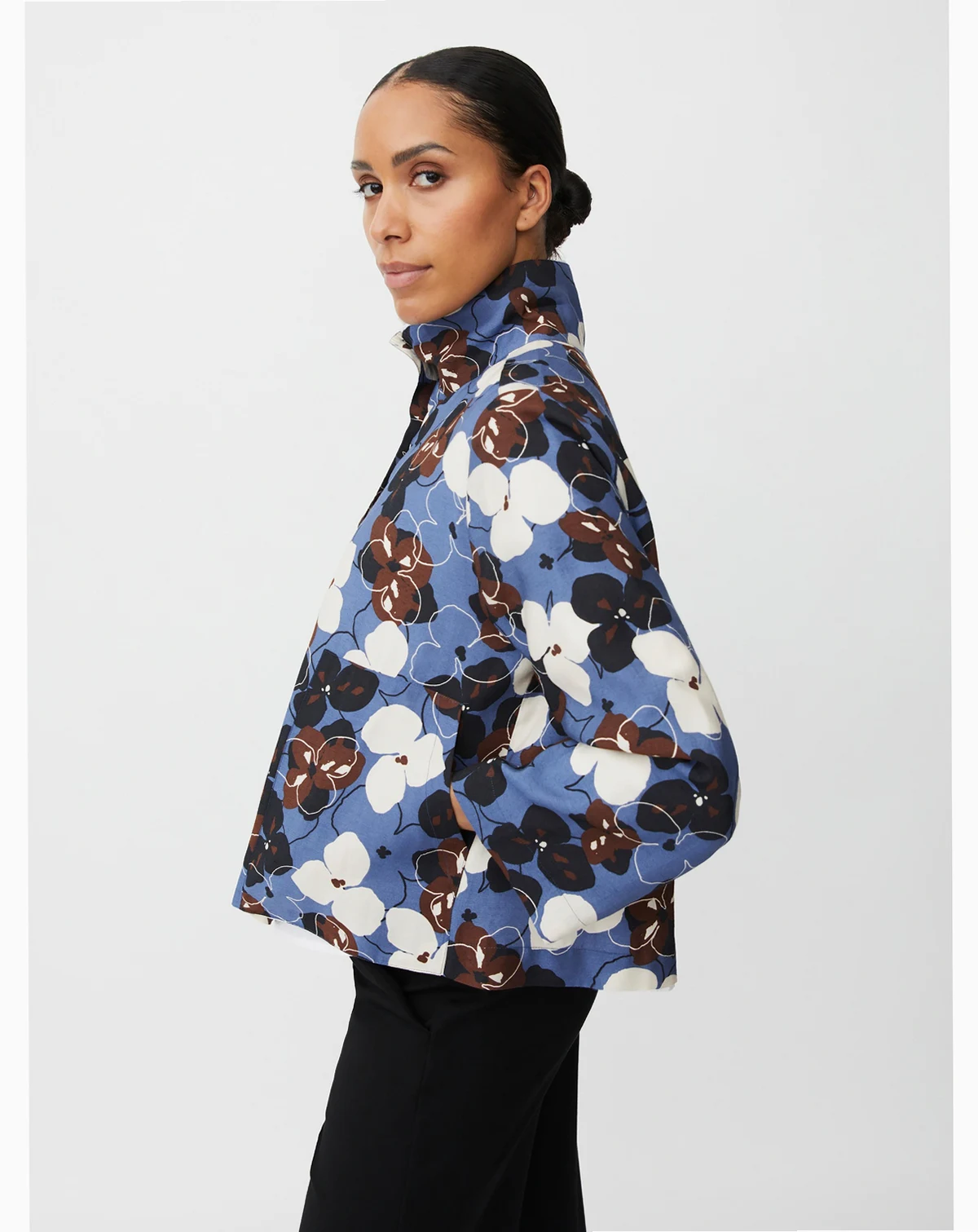 Add a colorful accent to your outfit with this short floral jacket. Made from soft viscose, it falls comfortably over the body and features a high neck, wide sleeves, and decorative pockets.