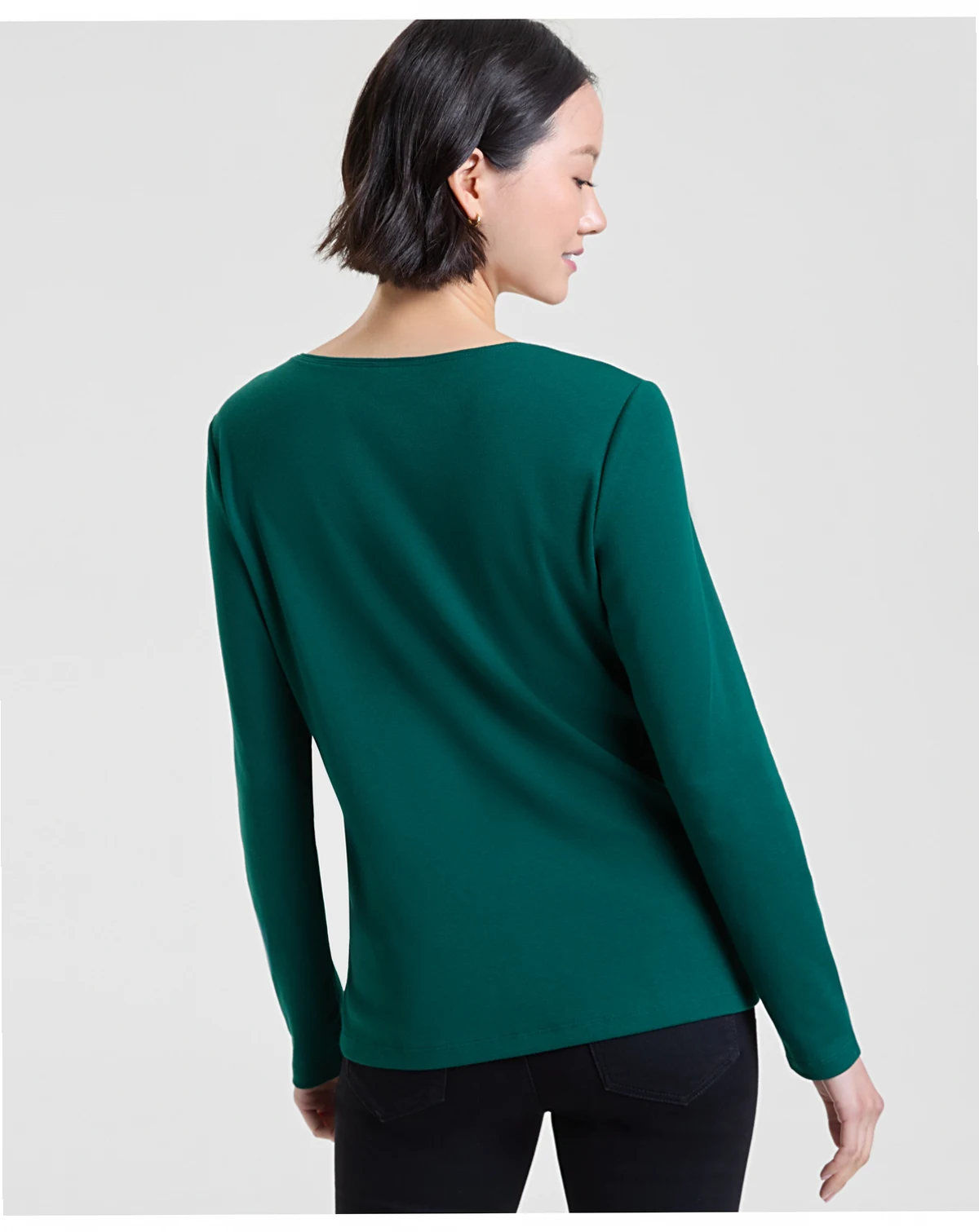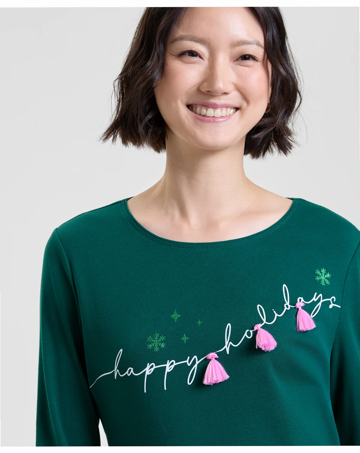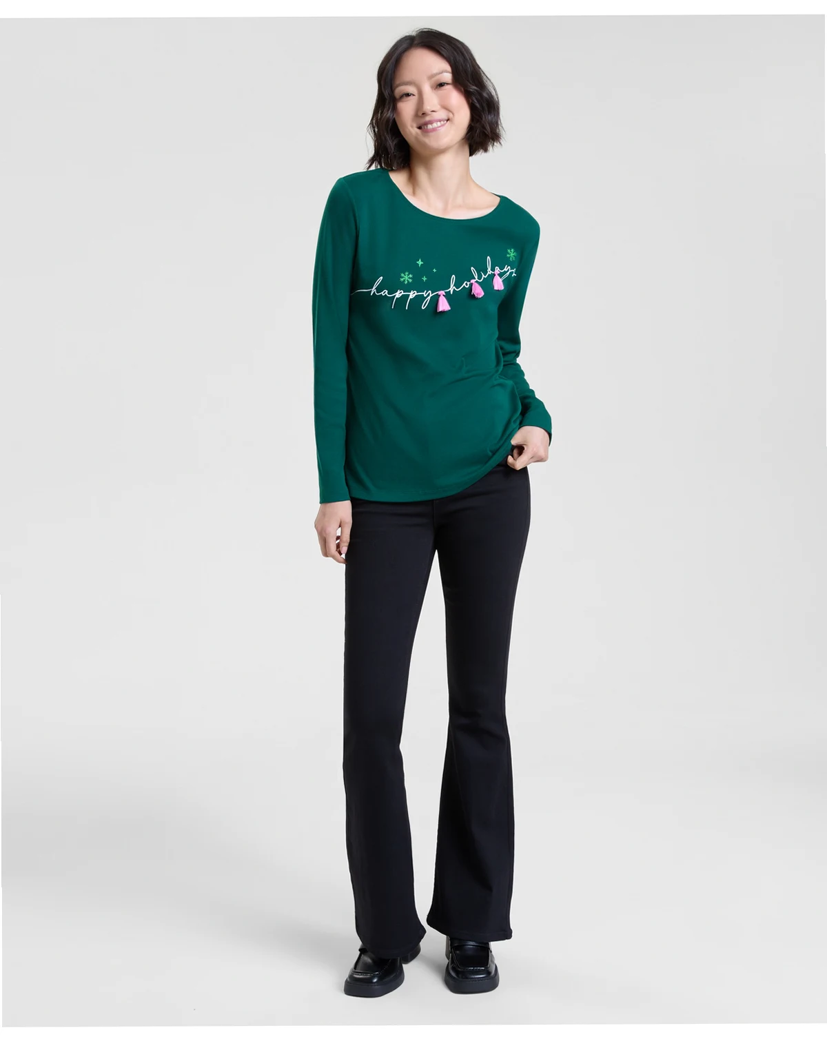 Get into the holiday spirit with this fun and festive top from Holiday Lane, a long-sleeve scoop neck design detailed with an embellished "happy holidays" message at the front.