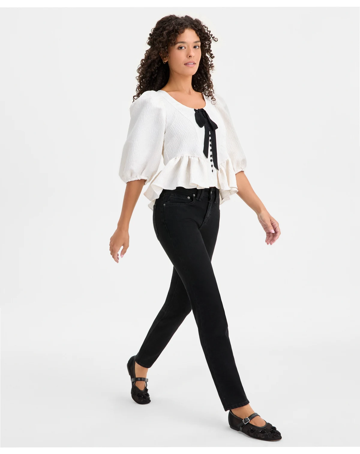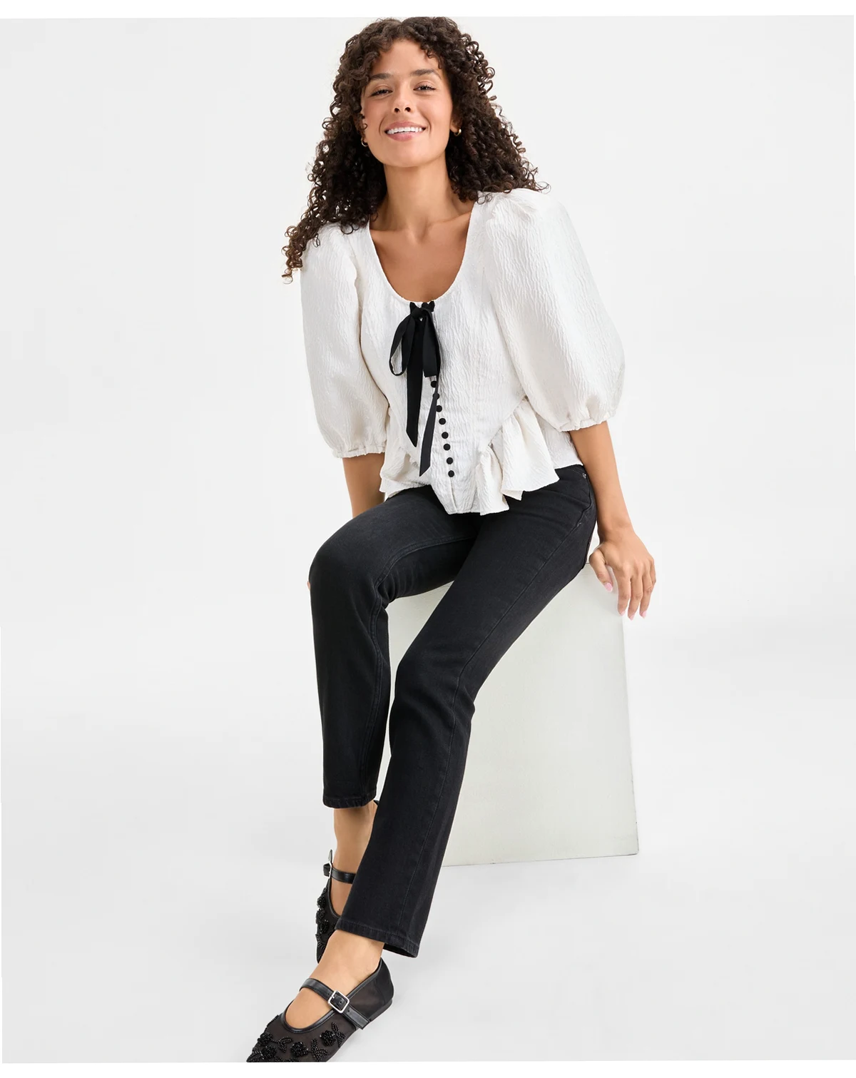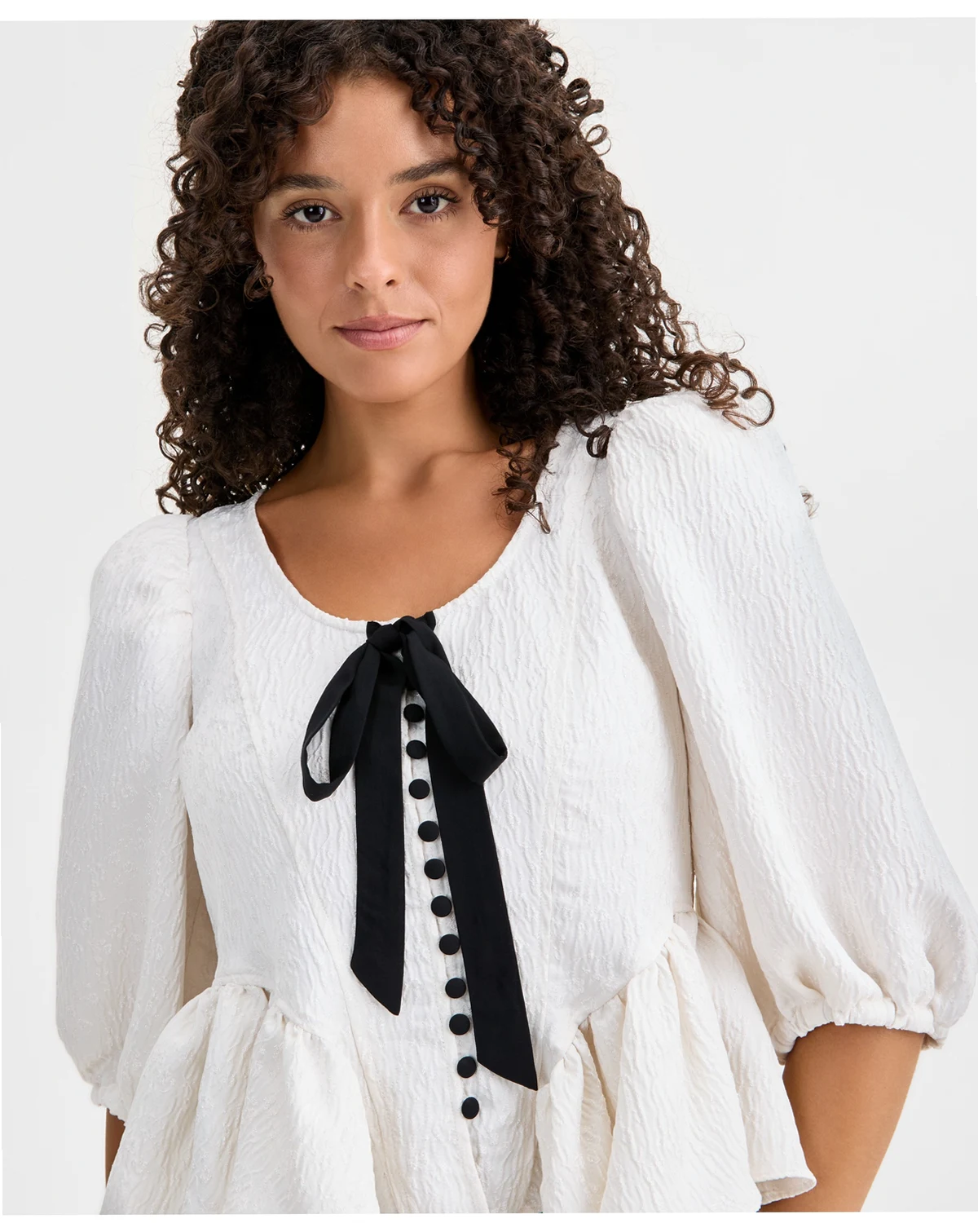 Effortlessly feminine, this satin jacquard top from Free People features a classic scoop neckline, puffy short sleeves with contrast bow detailing, and a frilly ruffled hem. With a relaxed fit and button closures, it's a blend of charm and versatility for any occasion. ABOUT THE BRAND: If you love the laid-back charm of boho-chic apparel, you'll find a beautiful selection from Free People at Macy's that suits your style. From ultra-feminine dresses to cute tops, browse the collection of casual, hip designs.