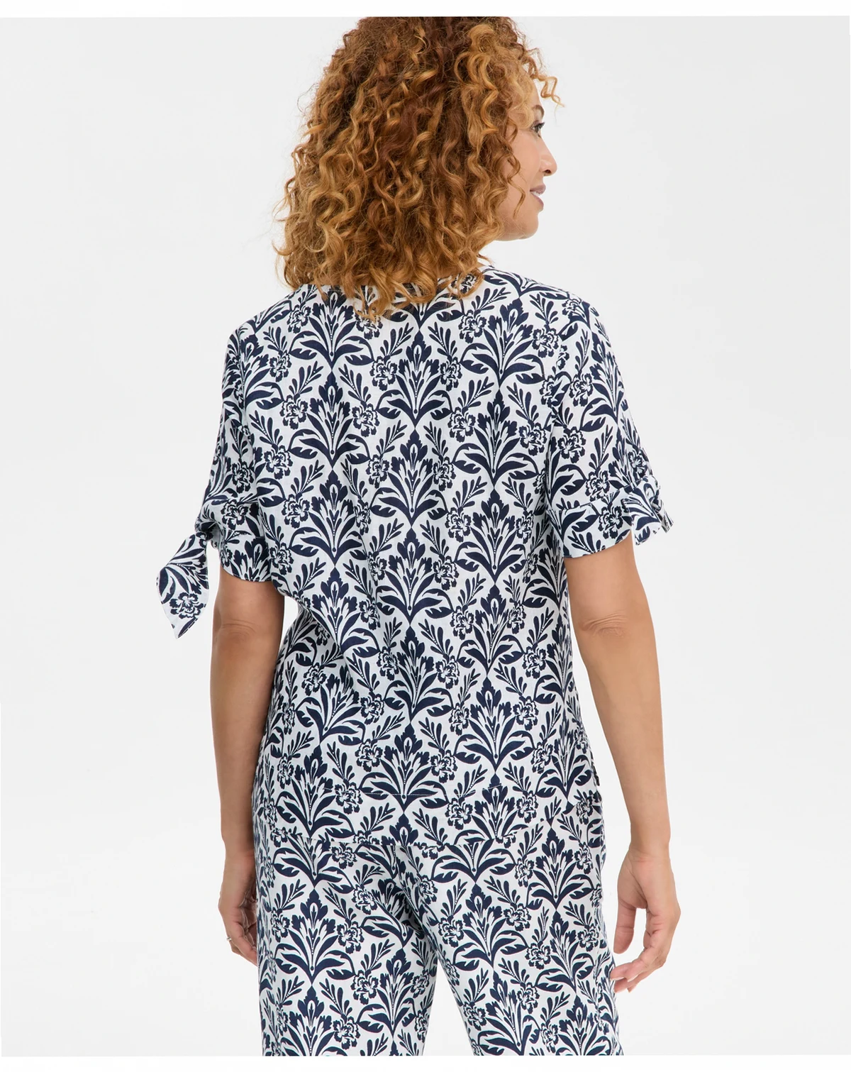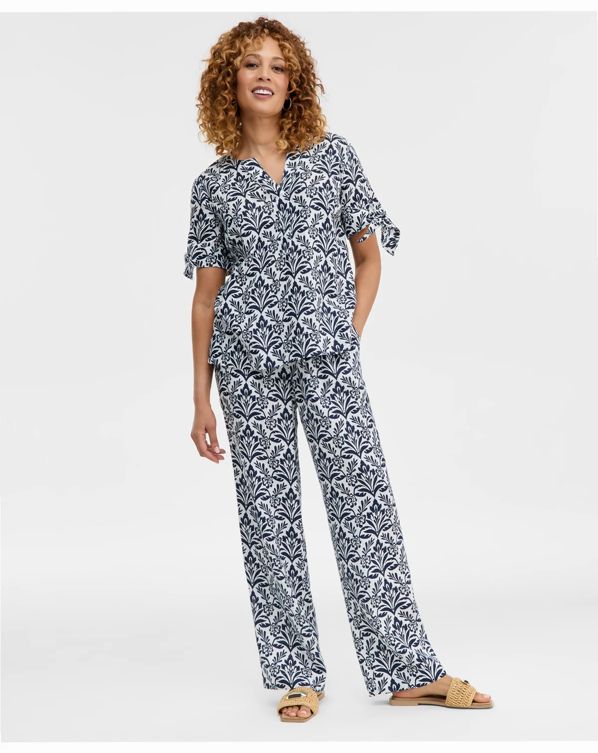Women's 100% Linen Tile Tie-Cuff Split-Neck Top, Macy's Exclusive