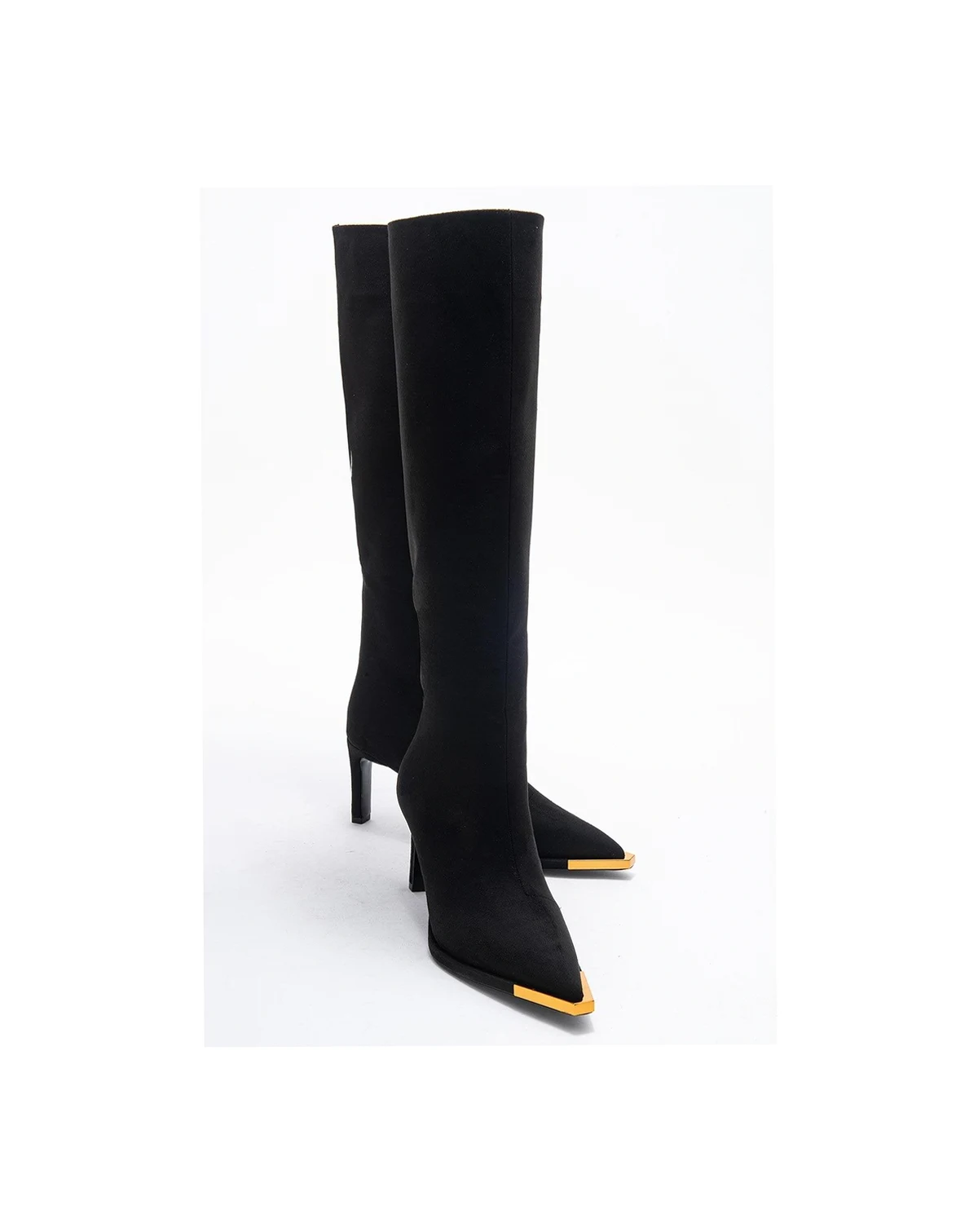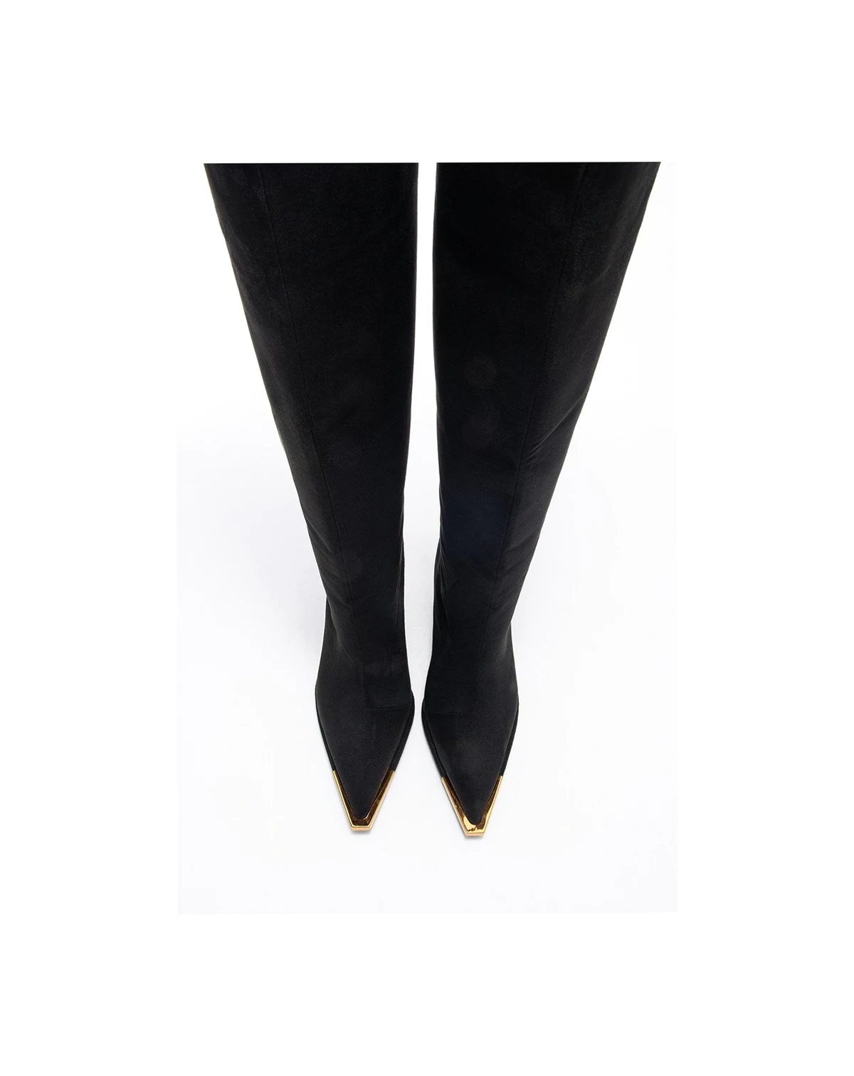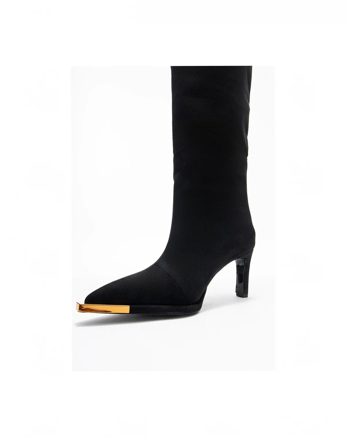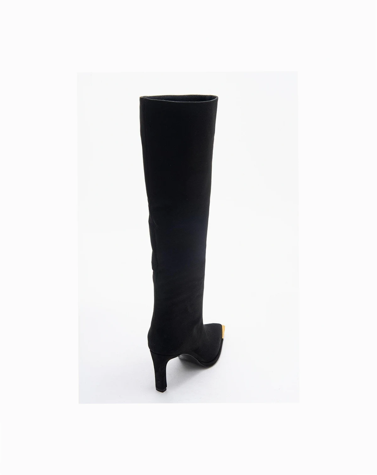 A sophisticated knee-high silhouette with refined gold accents and a pointed toe that elevates any ensemble