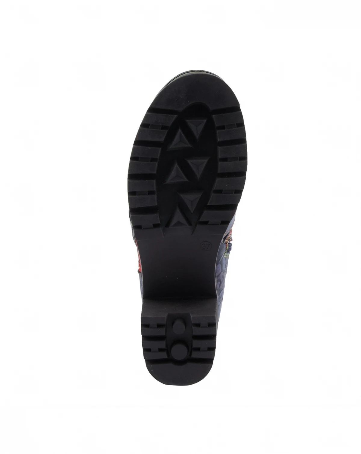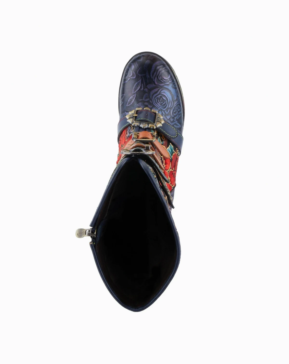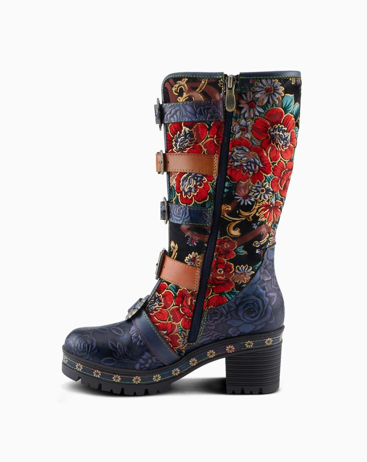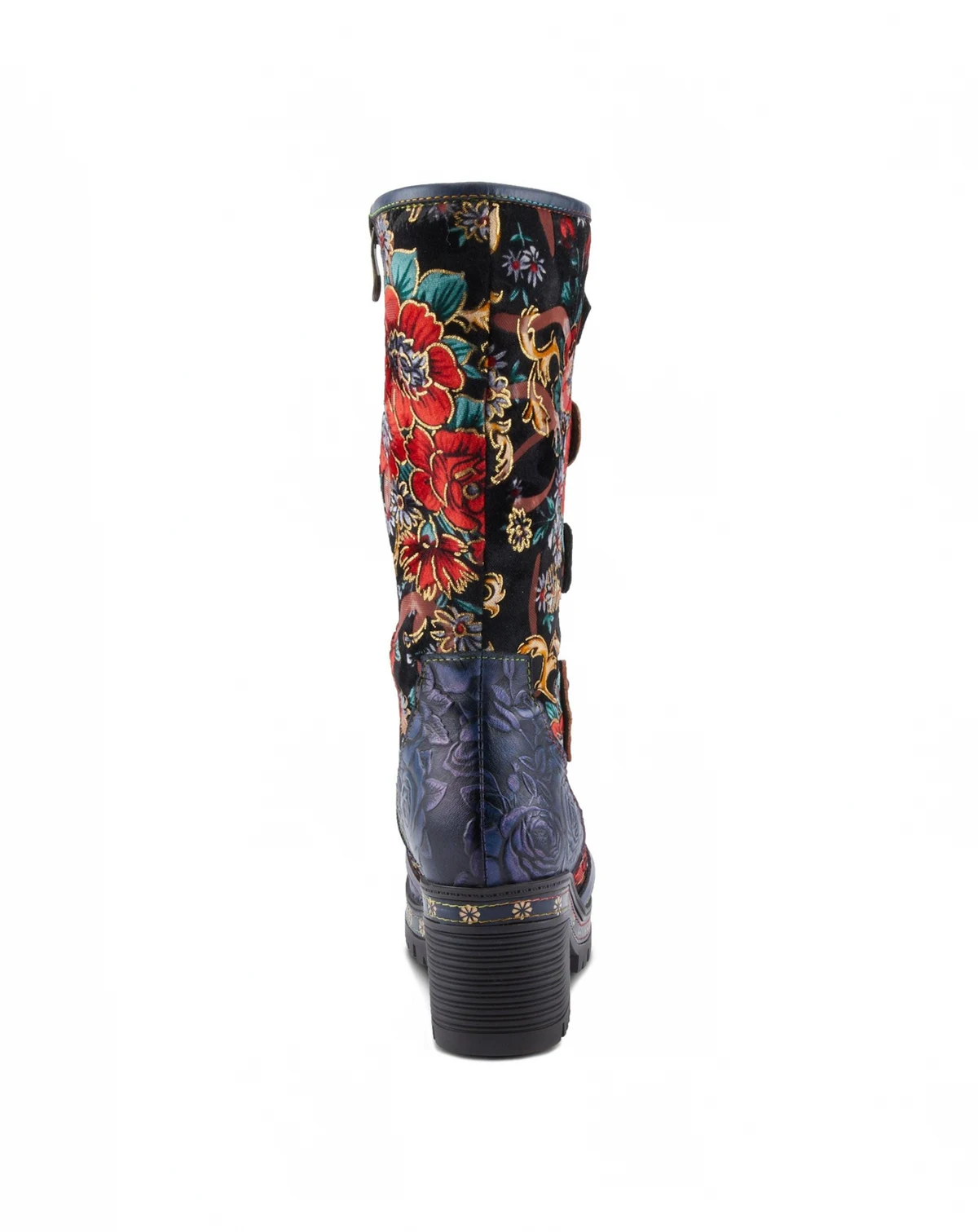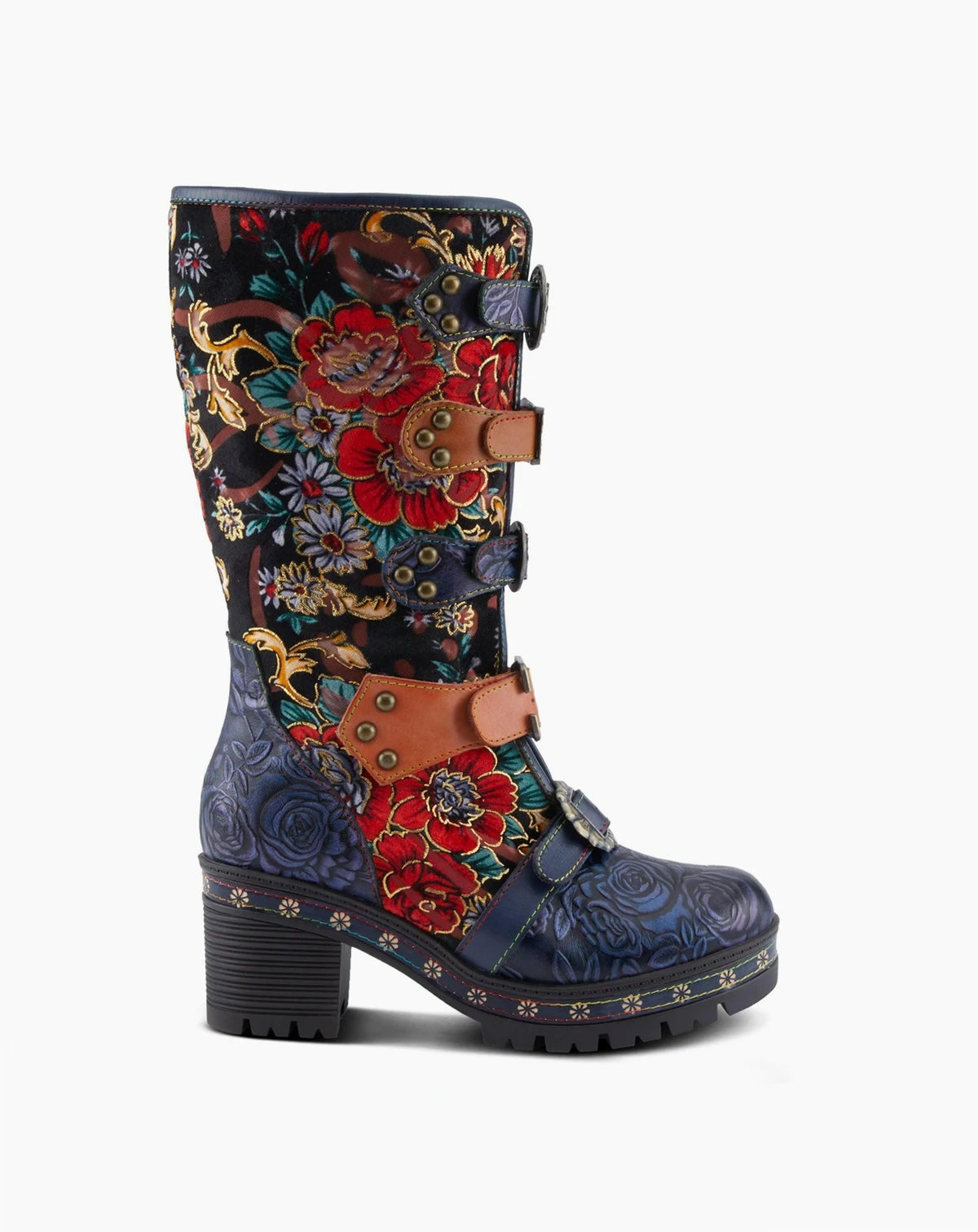 Step out in fearless fashion with the L Artiste BRAZEN boot—crafted for the woman who dares to make a statement. This mid-shaft boot blends bold design with luxurious comfort, featuring a sophisticated textile shaft and beautifully embossed leather floral details on the toe and heel counter. Five decorative straps with antique brass buckles wrap around the shaft for a unique edge, while the inside zipper allows for easy on/off wear. A faux fur lining and padded insole deliver cozy comfort, all grounded by a 2¾" stacked heel and a 1" platform rubber outsole for added stability. Perfectly versatile for dressing up or down, BRAZEN lets your confidence shine with every step.