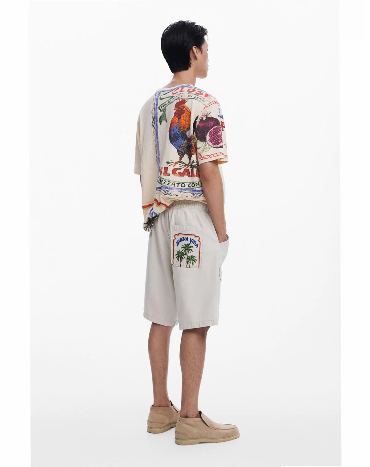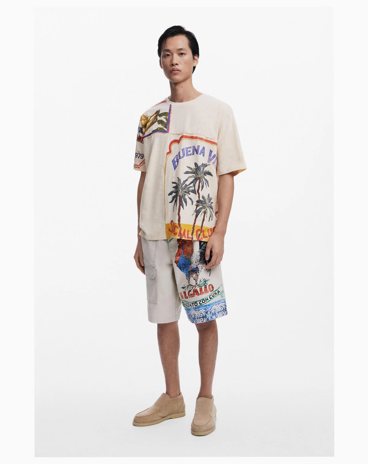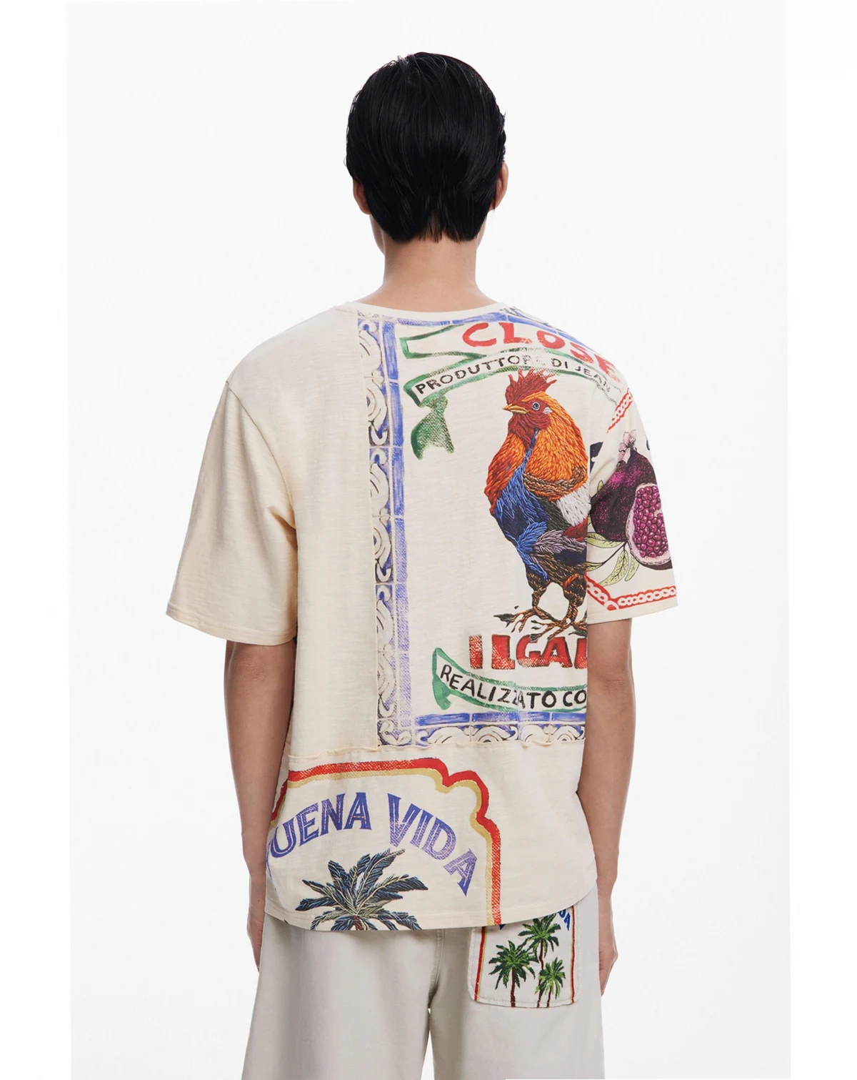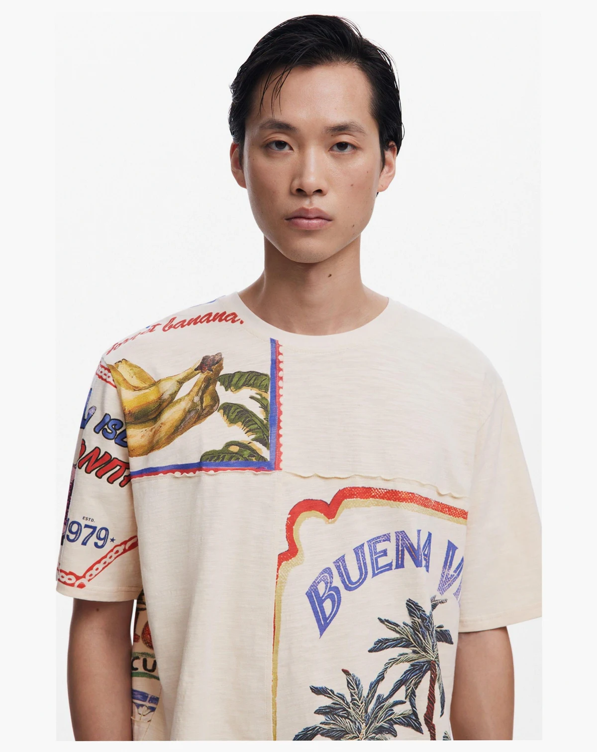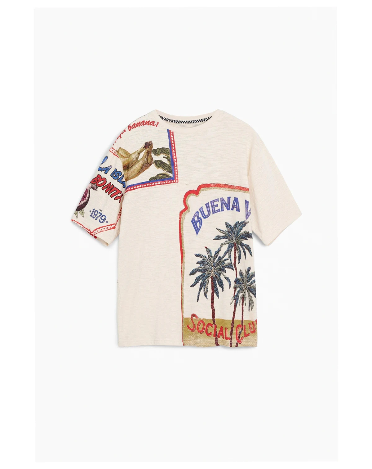 Short-sleeved T-shirt with round neck and tropical postcard illustrations.