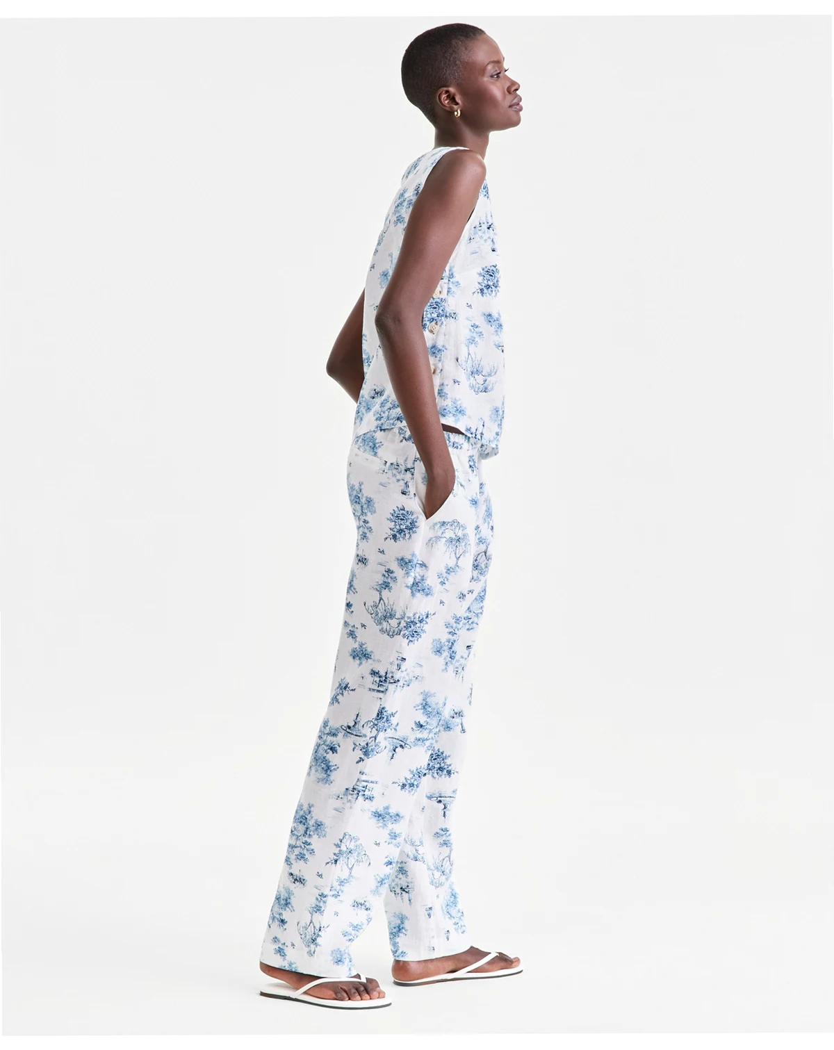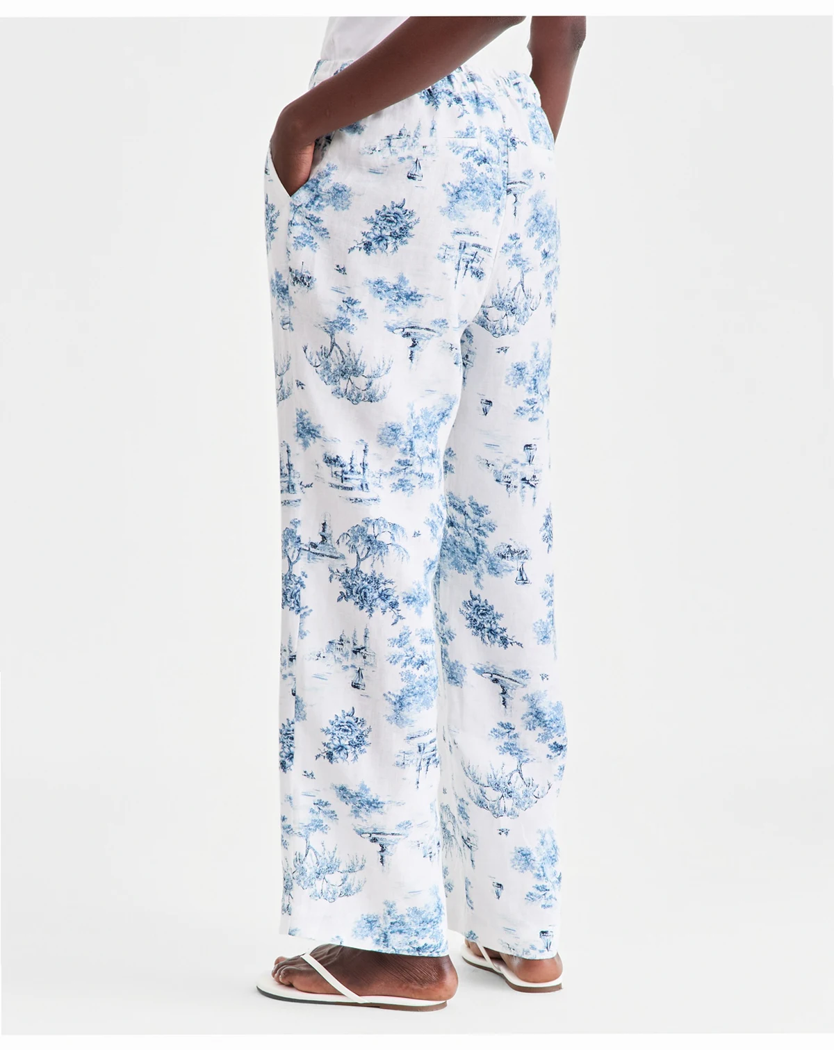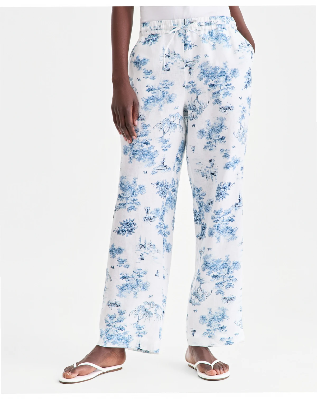 100% linen; thread and pocketing: 100% cotton; elastic: 100% polyester