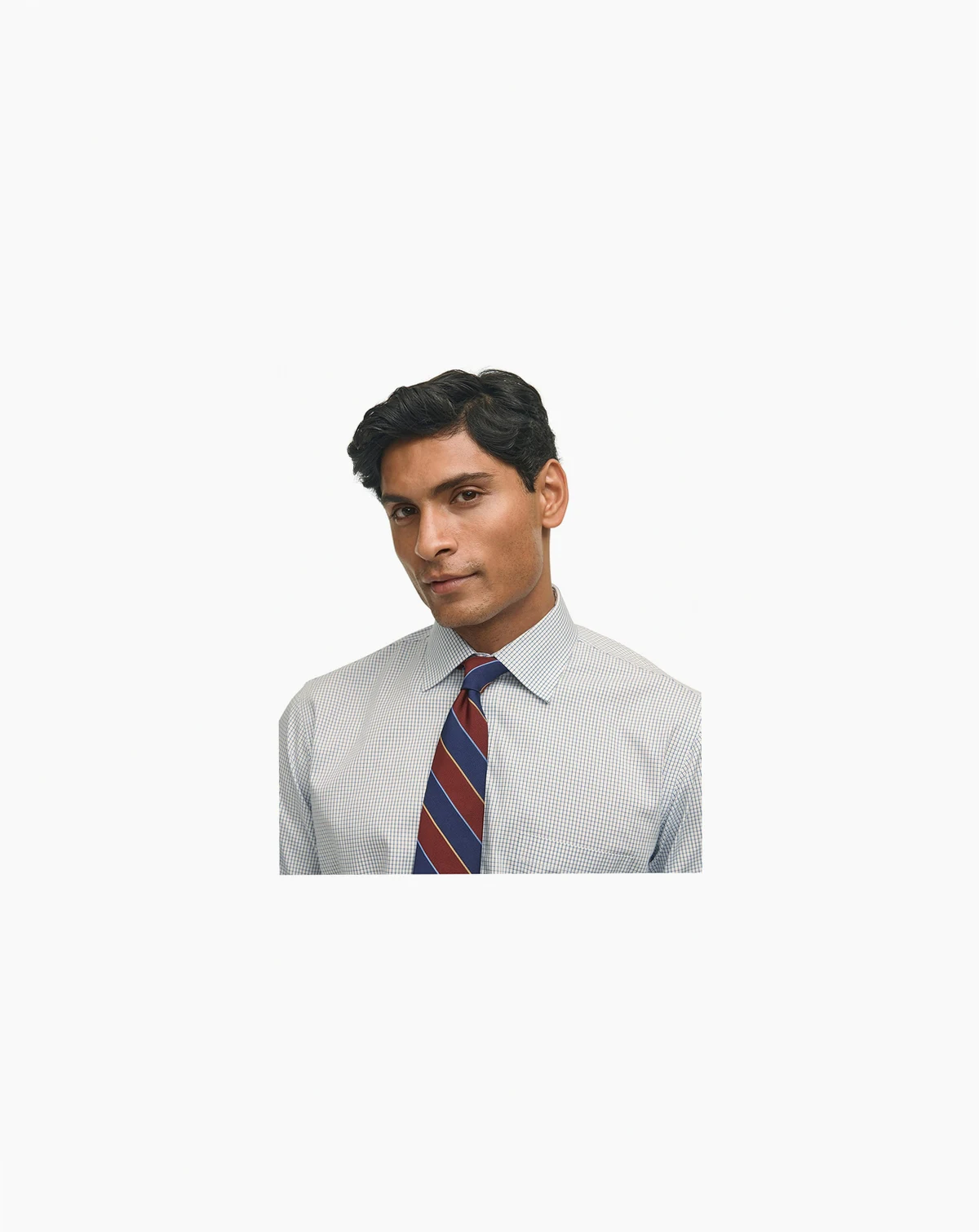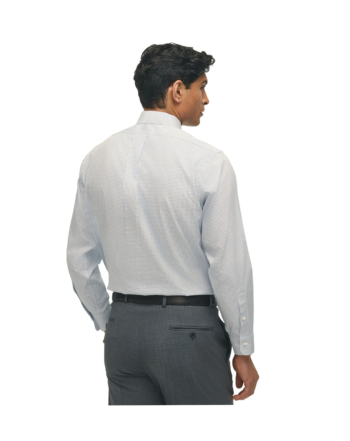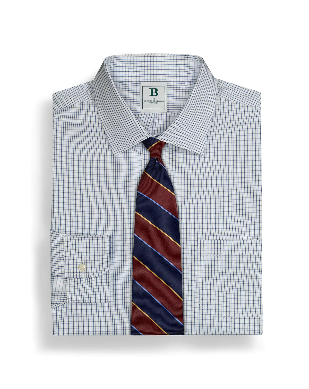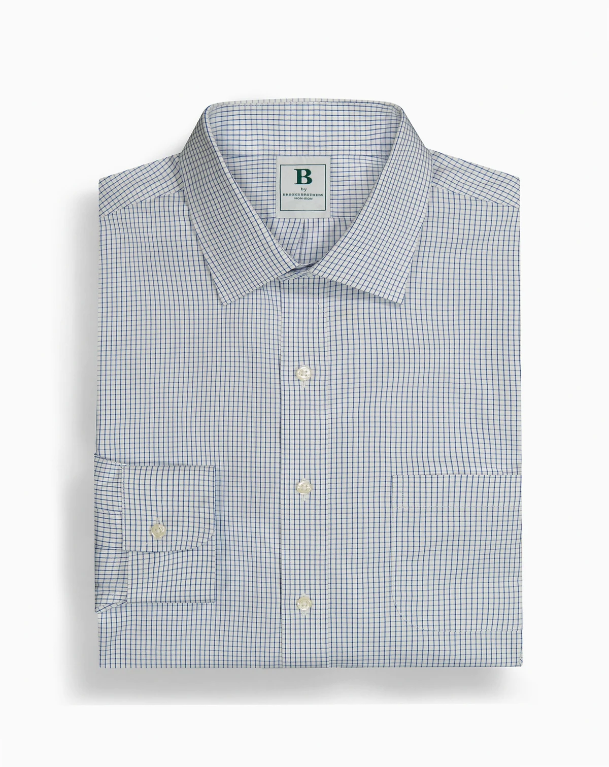 A classic choice, this blue check dress shirt from B by Brooks Brothers is made of non-iron cotton that resists wrinkling. The spread collar can be worn with or without a necktie.