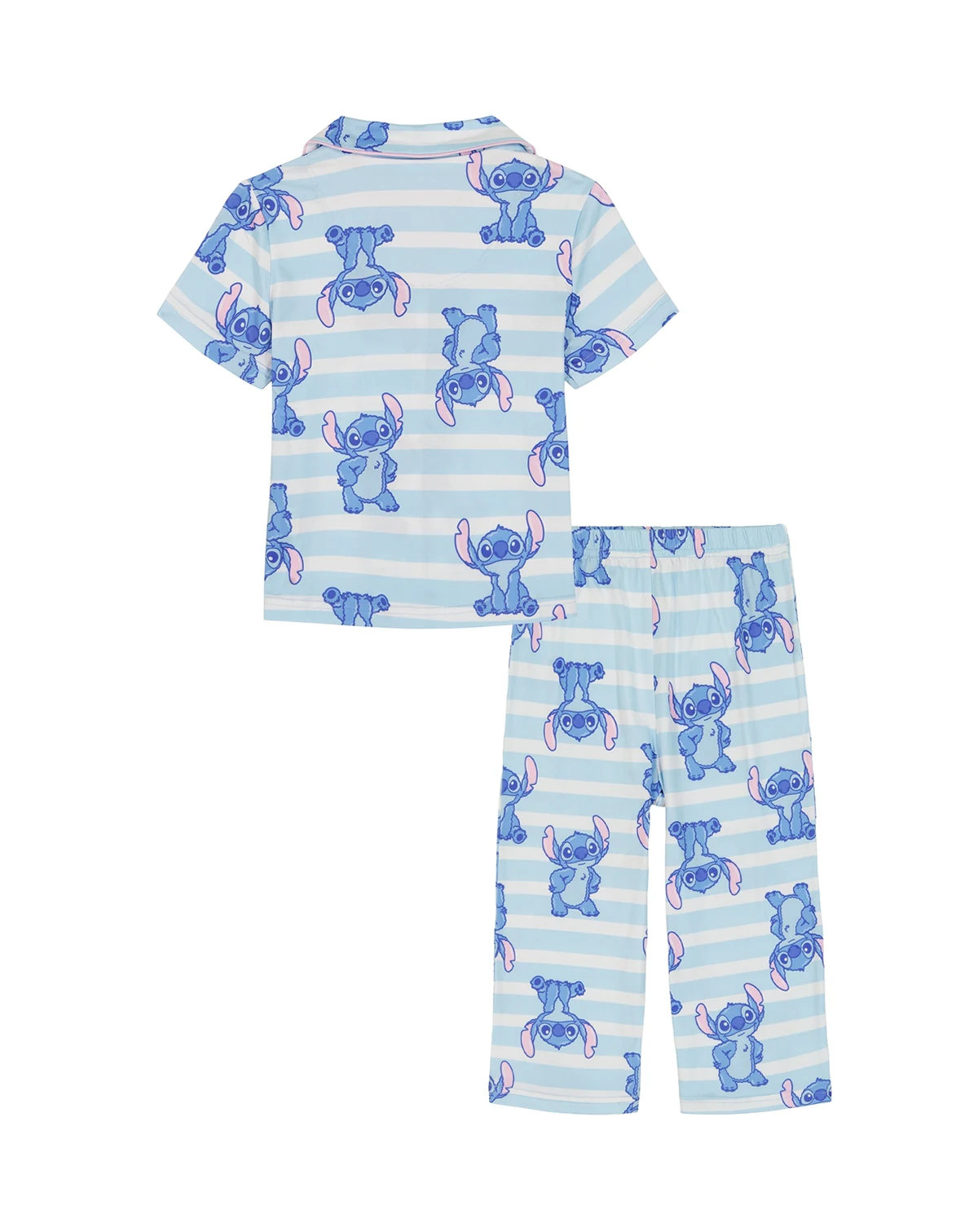 Add whimsical charm to bedtime in this Lilo Stitch pajama set, featuring a blue notch-collar, button-down short-sleeve top. Wide-leg pants with an all-over Lilo & Stitch print and an elastic waistband provide a comfortable, relaxed fit.