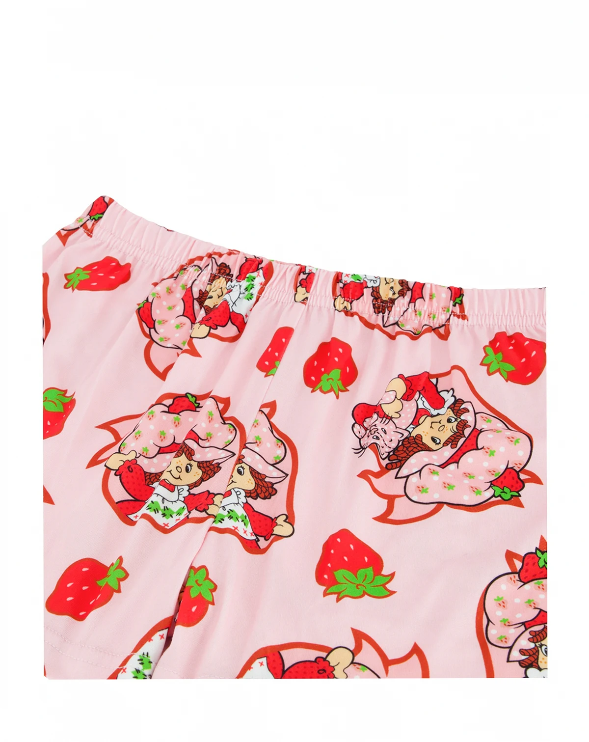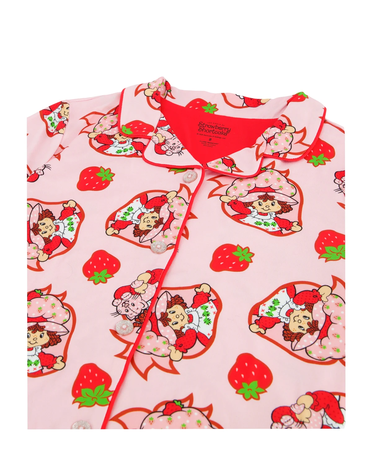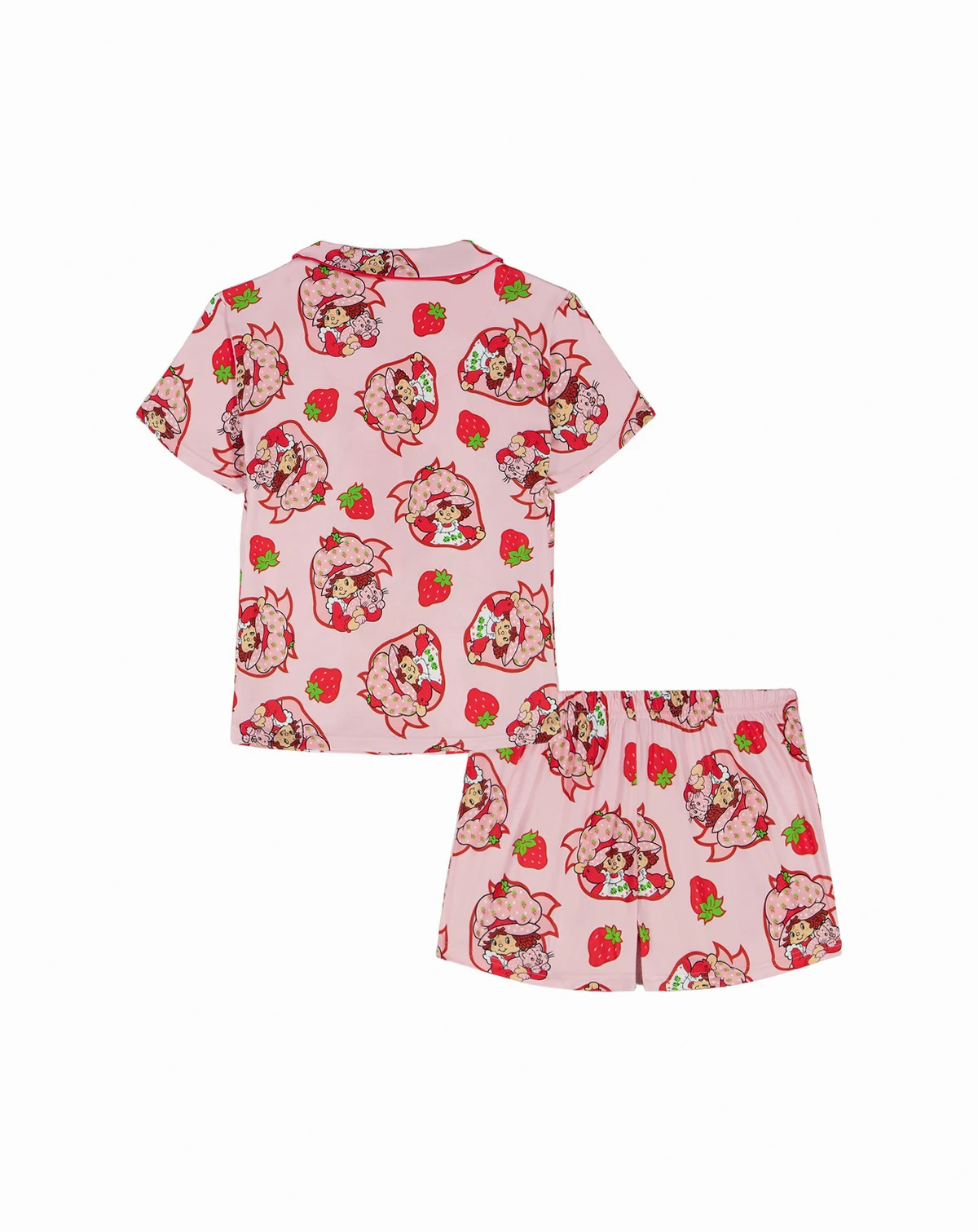 Sweet and cheerful, this Strawberry Shortcake pajama set features a notch-collar, button-down top covered in an all-over Strawberry Shortcake print. Coordinating shorts with the same playful print complete the set for a fun, comfortable look.