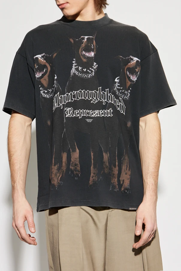 The T-shirt features a striking graphic of three dobermans on the front, rendered in dark hues for a bold yet understated look. Accompanying the graphic are the words "Thoroughbred" and "Represent," essential identifiers of this unique garment. The classic cut, with short sleeves and a crew neck, ensures both comfort and style.