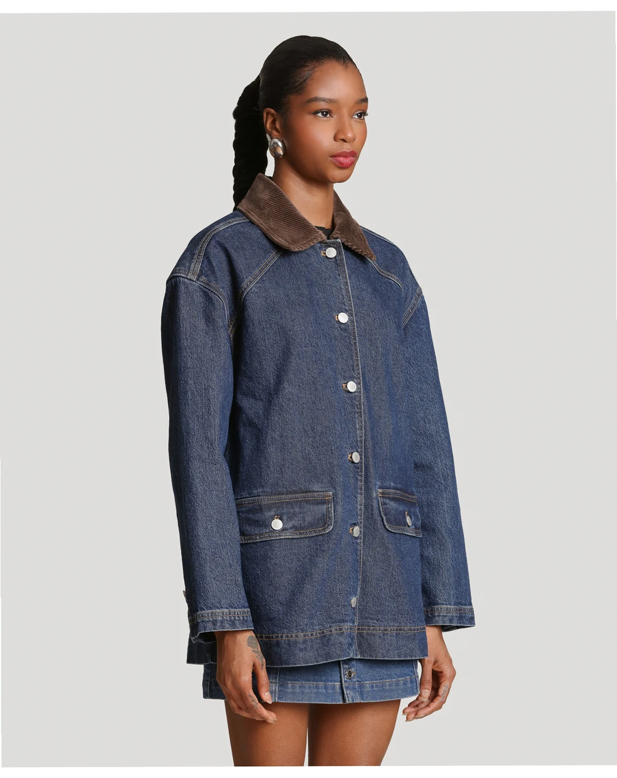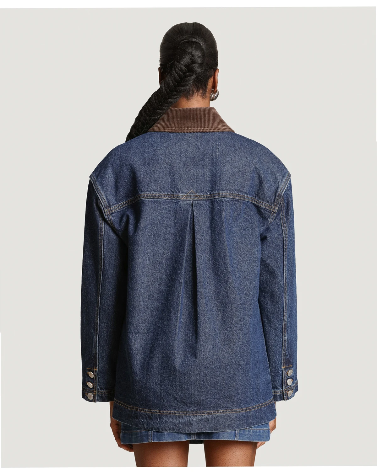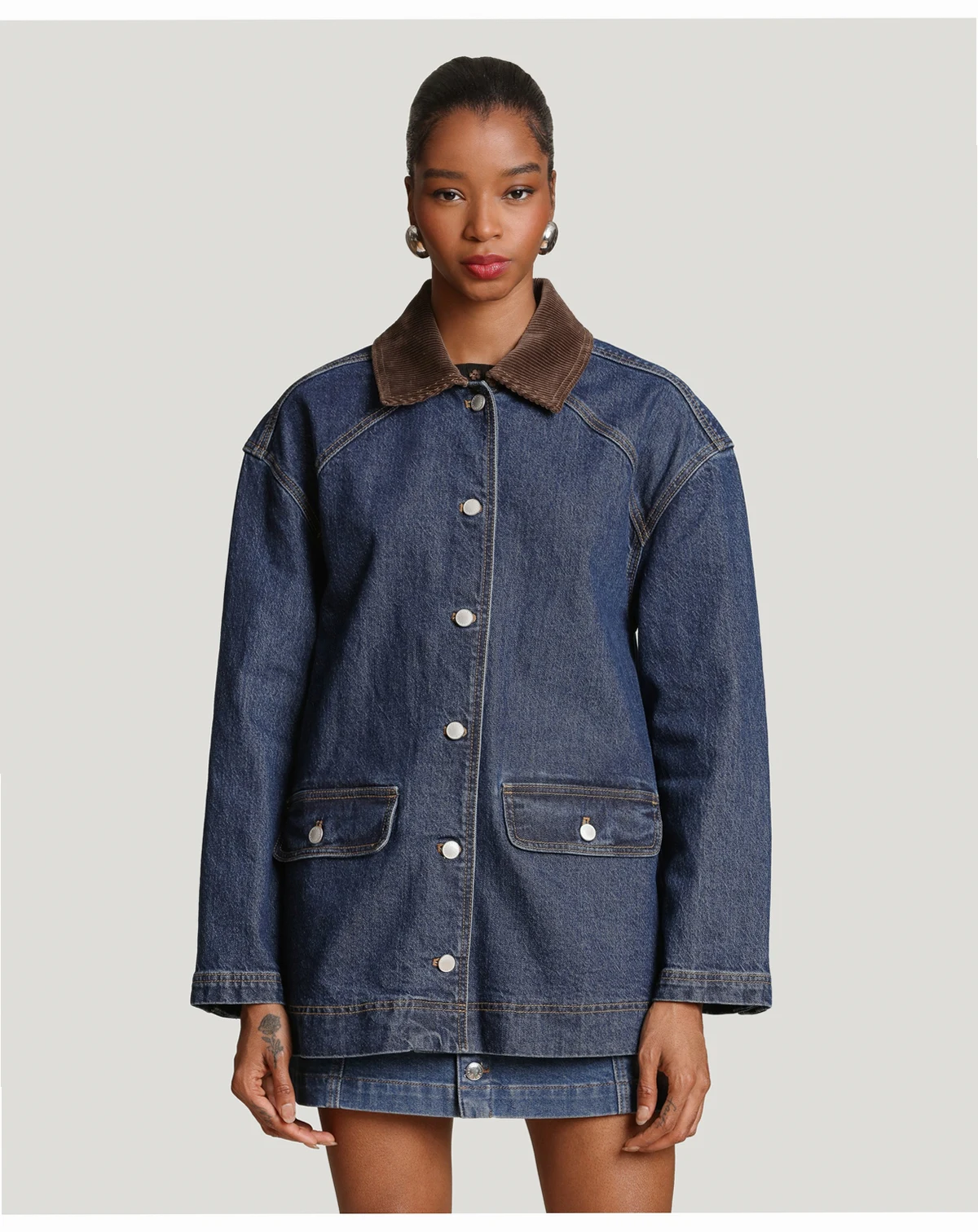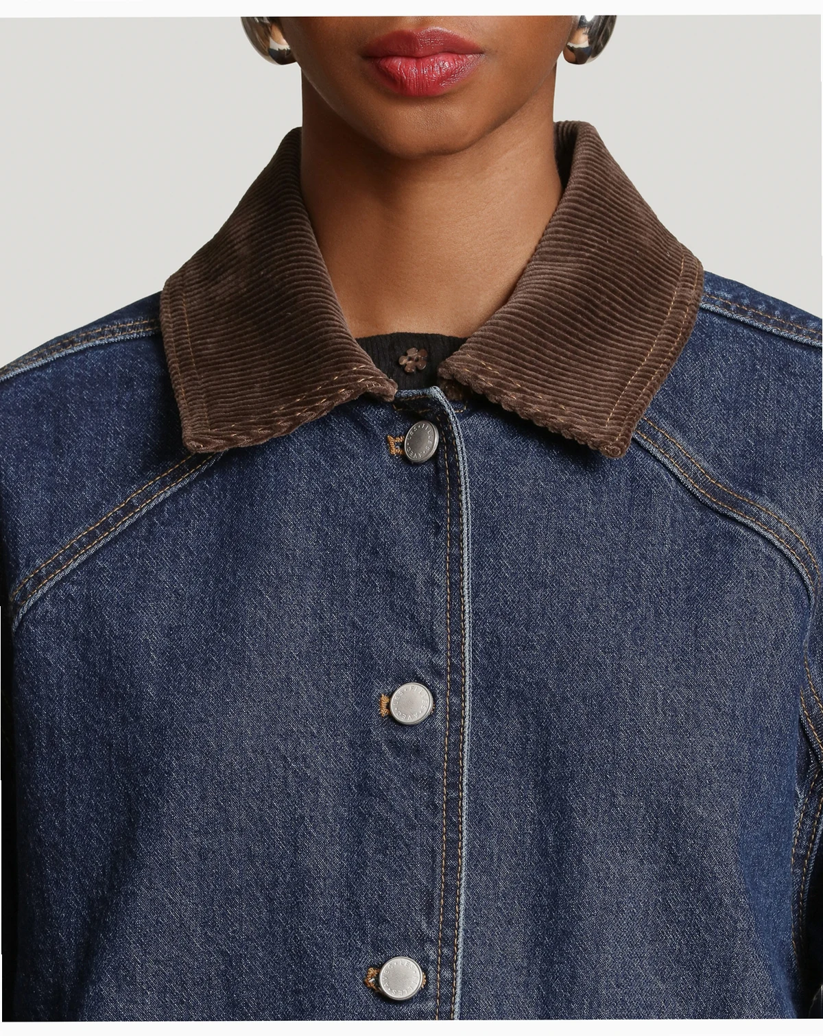 Add a cool, vintage-inspired layer to your wardrobe with this Avec Les Filles raw indigo denim jacket. Featuring a contrasting corduroy collar, utility-style pockets, and silver-tone hardware, it's the perfect mix of rugged and refined. Throw it over a dress or pair it with jeans for an effortlessly chic, laid-back vibe.