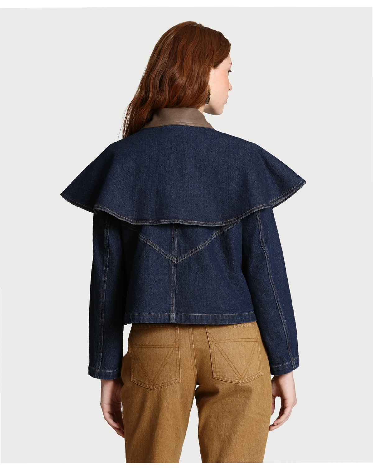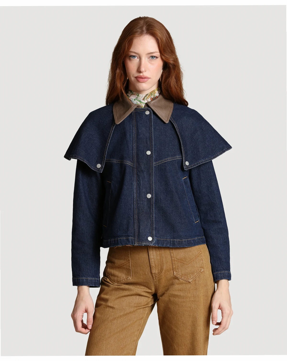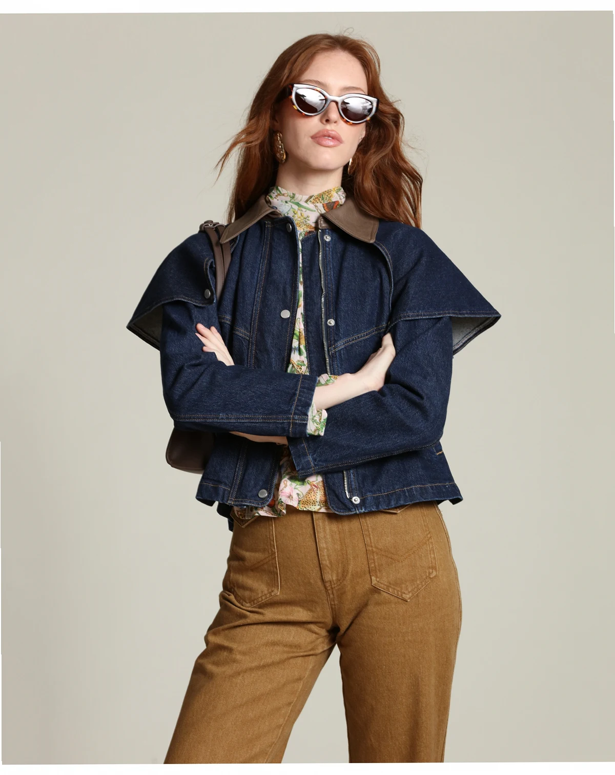 Presenting a unique cape silhouette, this denim jacket from Avec Les Filles features a spread collar and long sleeves. Front functional pockets add a utilitarian touch.
