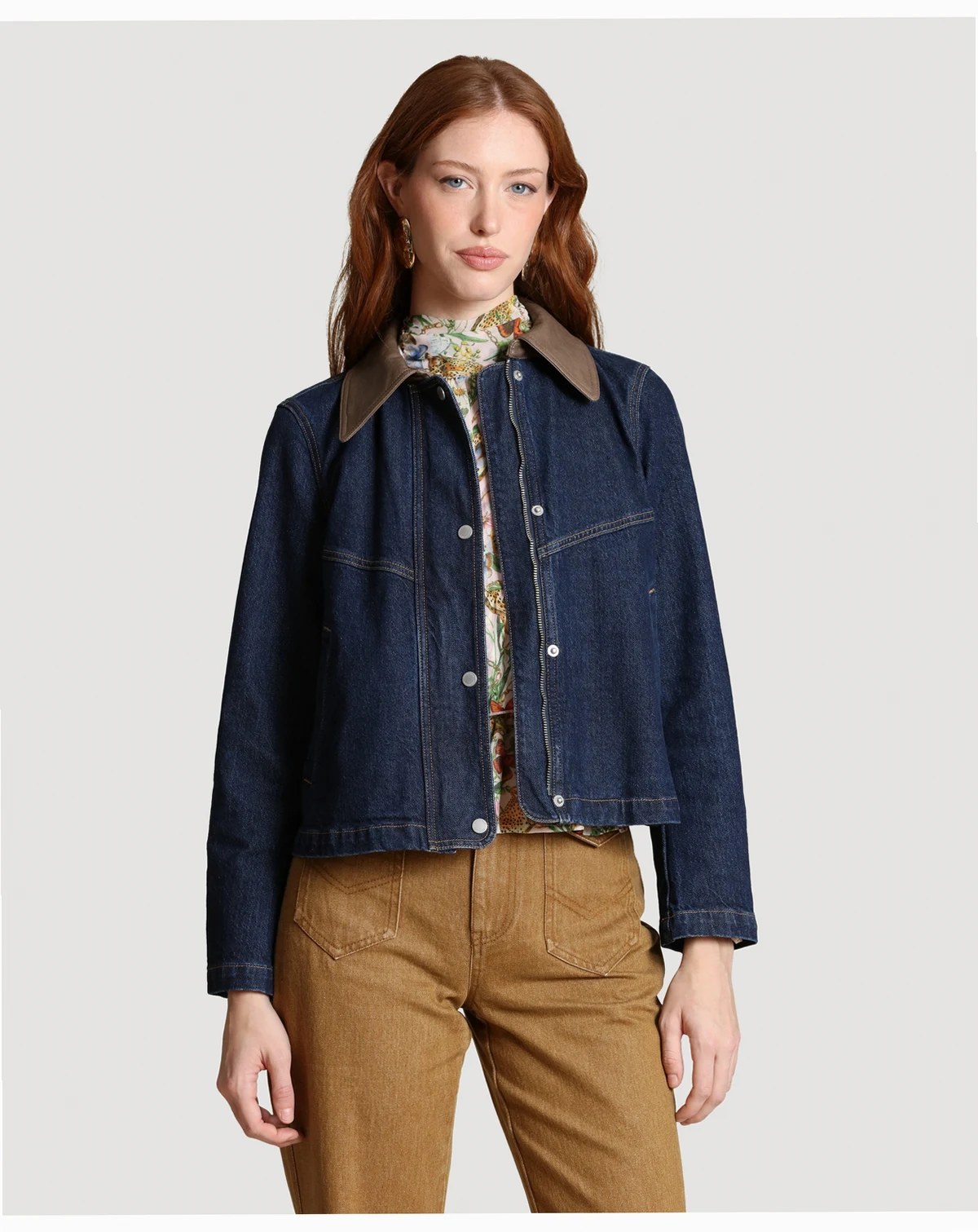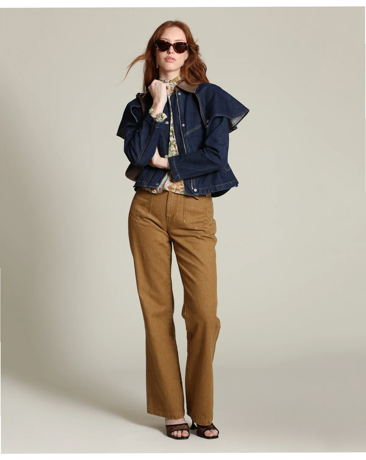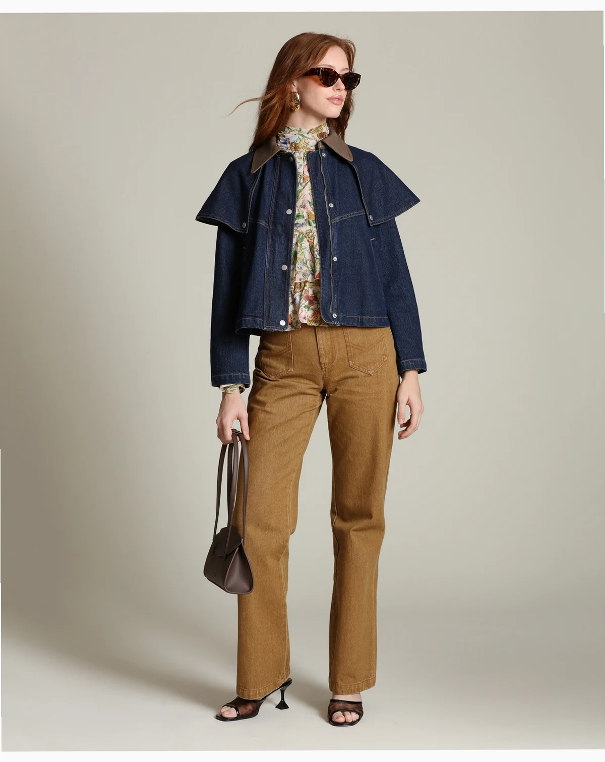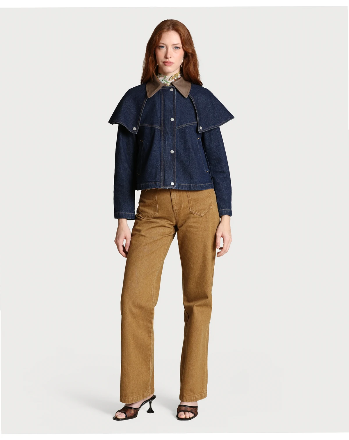 Presenting a unique cape silhouette, this denim jacket from Avec Les Filles features a spread collar and long sleeves. Front functional pockets add a utilitarian touch.