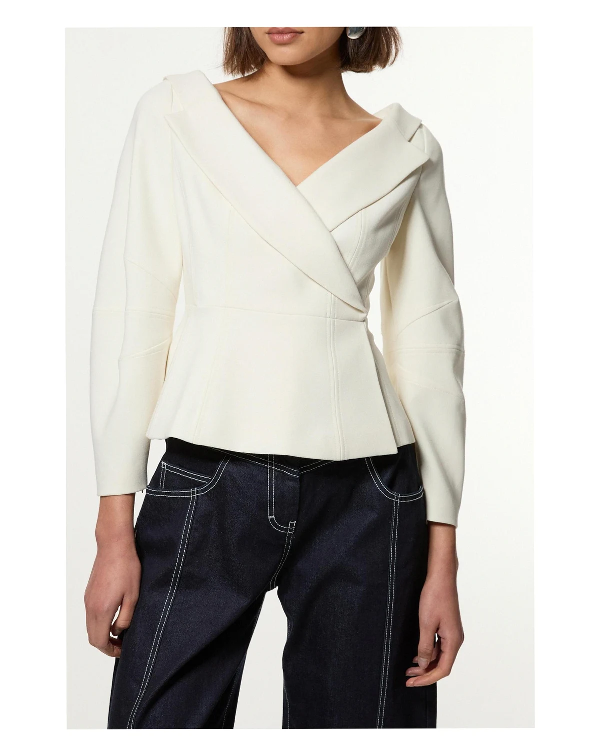 Striking asymmetric neckline with elegant wrap-style front design. Tailored silhouette with stretch fabric for comfortable movement. Feminine peplum detail creating a flattering waistline. Structured shoulders and long sleeves for a sophisticated profile. Versatile 53cm length perfect for layering over various bottoms. This karen millen asymmetric peplum jacket redefines daywear with architectural precision and contemporary flair.