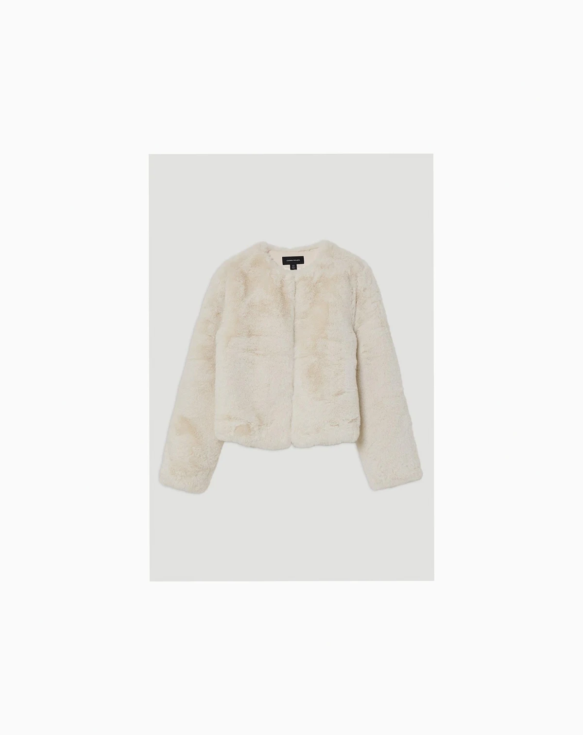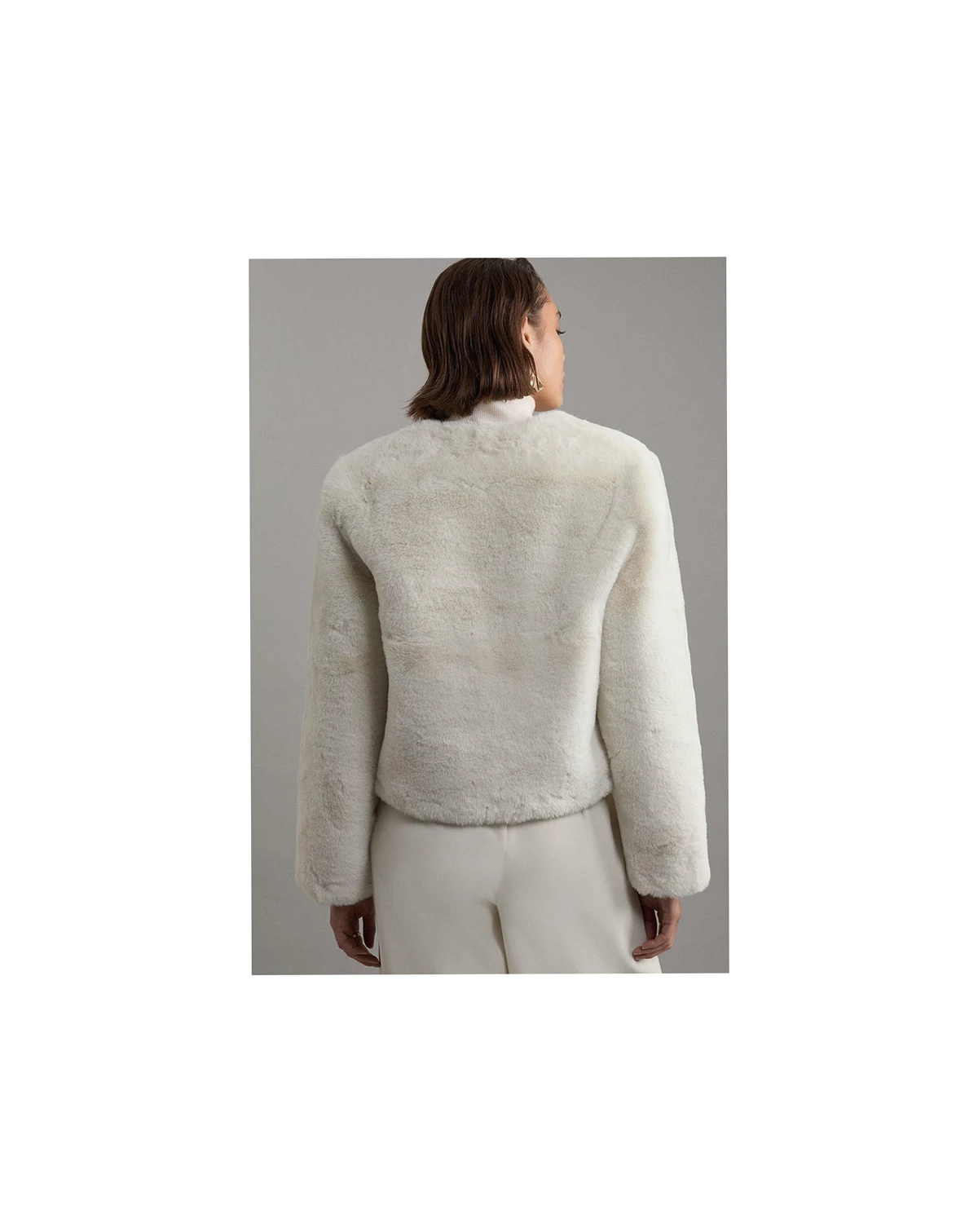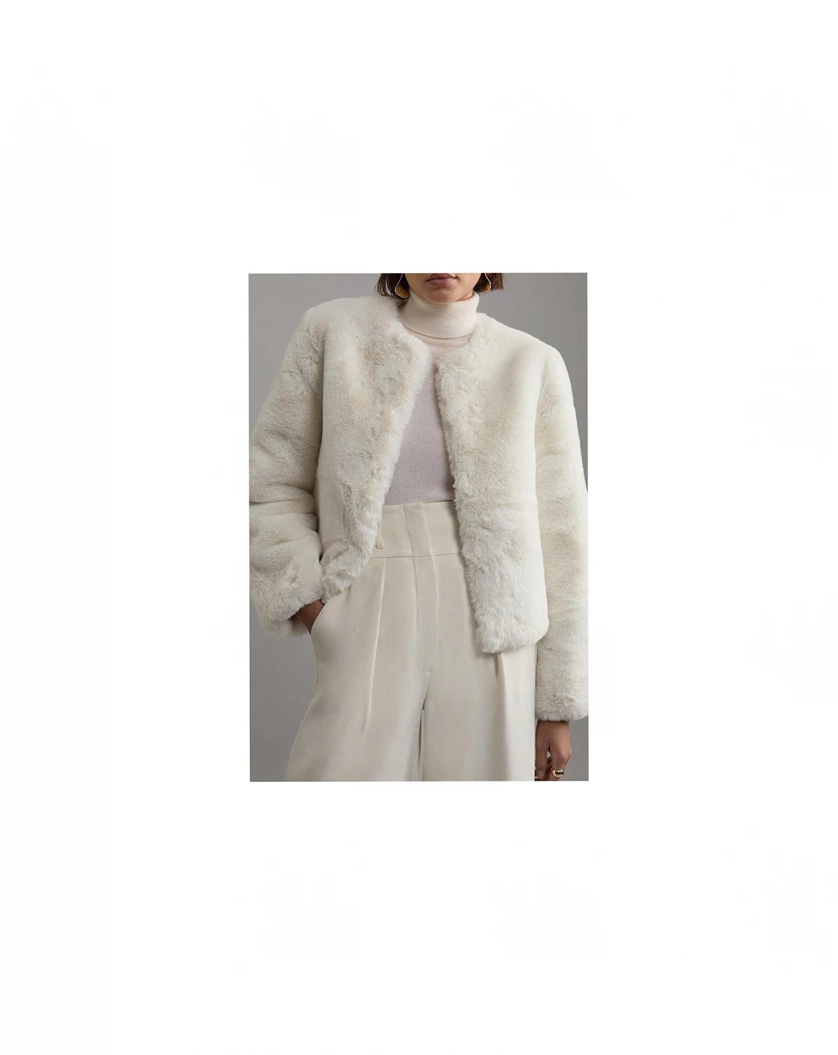 This Karen Millen collarless faux fur jacket embodies sophisticated glamour with effortless appeal. The cropped silhouette creates a flattering proportion when paired with high-waisted skirts or trousers, as styled in the image with a leather midi skirt. Layer over a tonal blouse for daytime gatherings or family brunches, creating a coordinated ensemble that's both polished and practical.