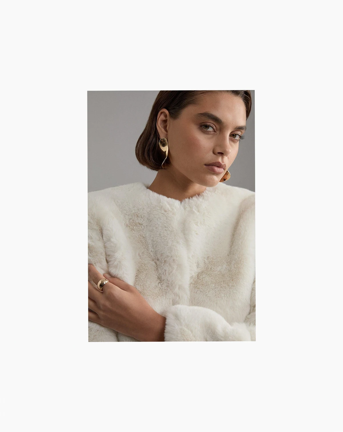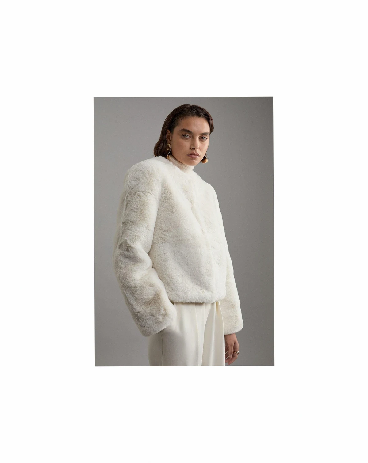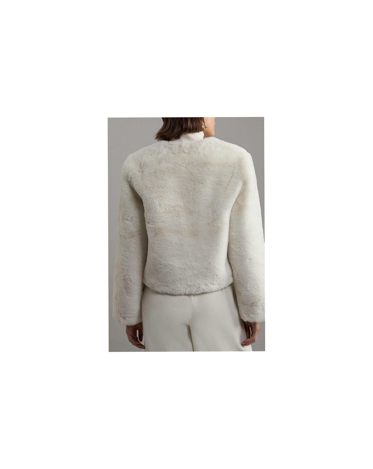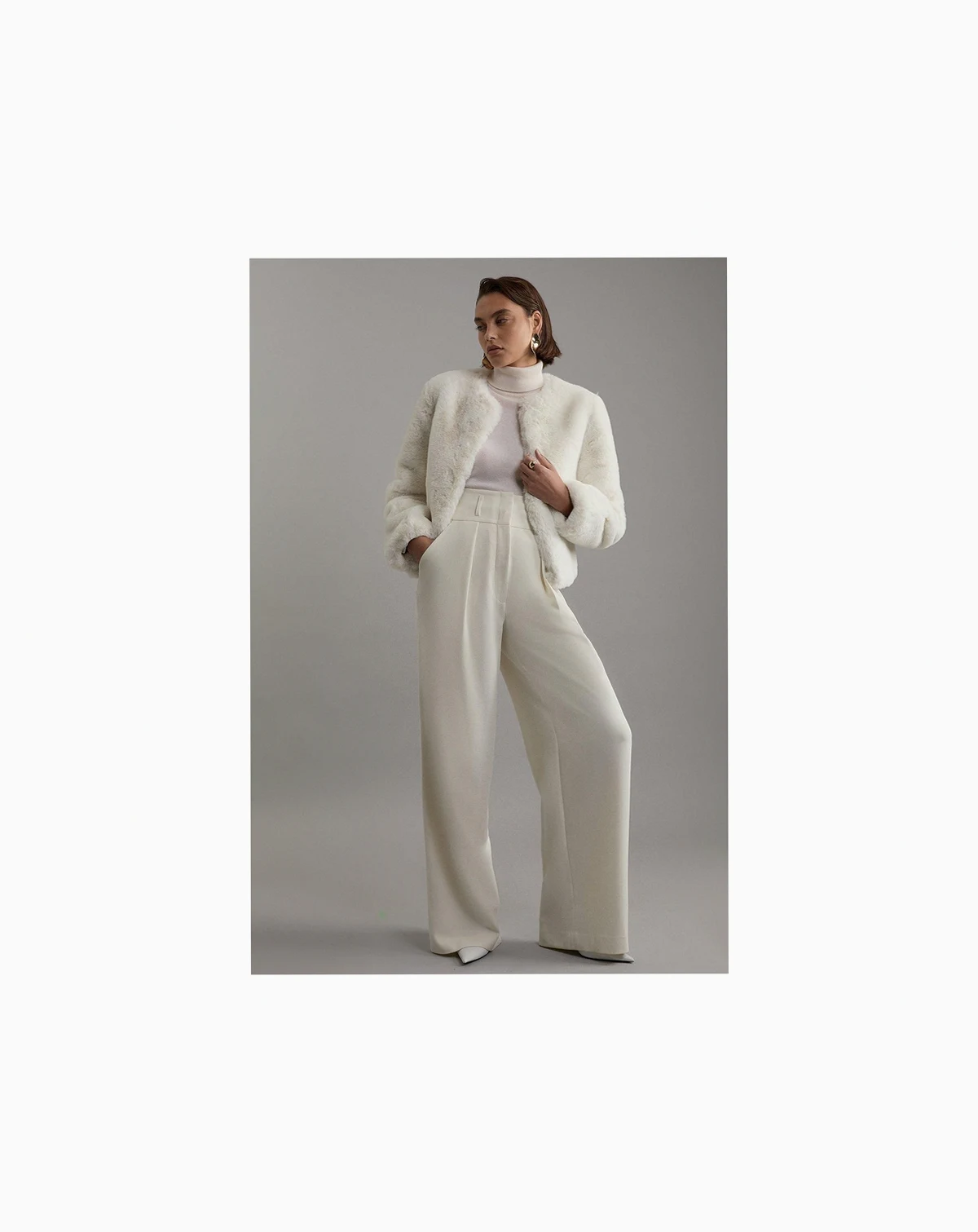 This Karen Millen collarless faux fur jacket embodies sophisticated glamour with effortless appeal. The cropped silhouette creates a flattering proportion when paired with high-waisted skirts or trousers, as styled in the image with a leather midi skirt. Layer over a tonal blouse for daytime gatherings or family brunches, creating a coordinated ensemble that's both polished and practical.