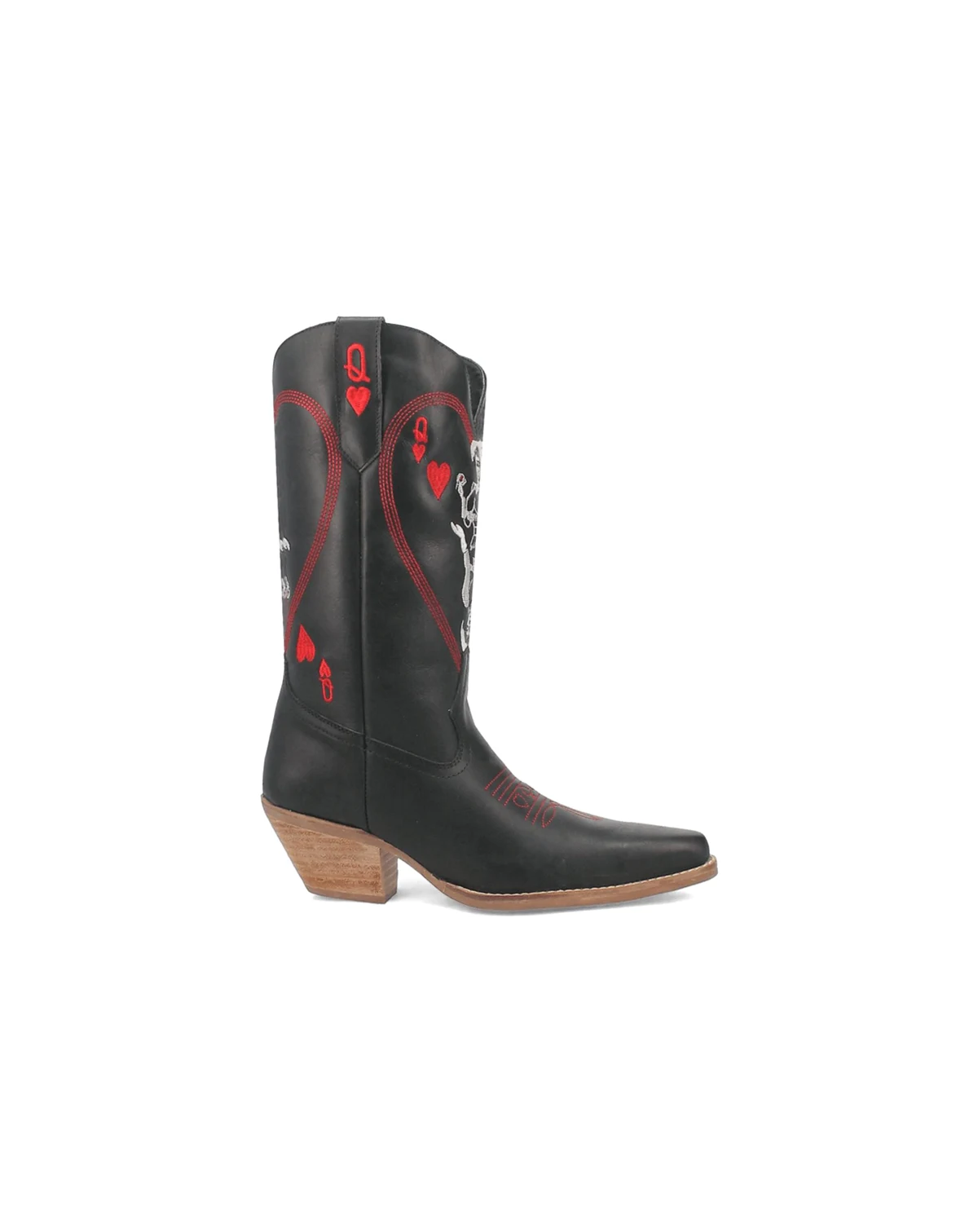 Step into western royalty, where everything is coming up roses with our Queen A Hearts boot from Dingo1969. Featuring unique and stately stitching throughout the shaft and a 2-1/4 inch heel, the 12-inch Queen A Hearts ensures no matter the hand you play, you're sure to win.