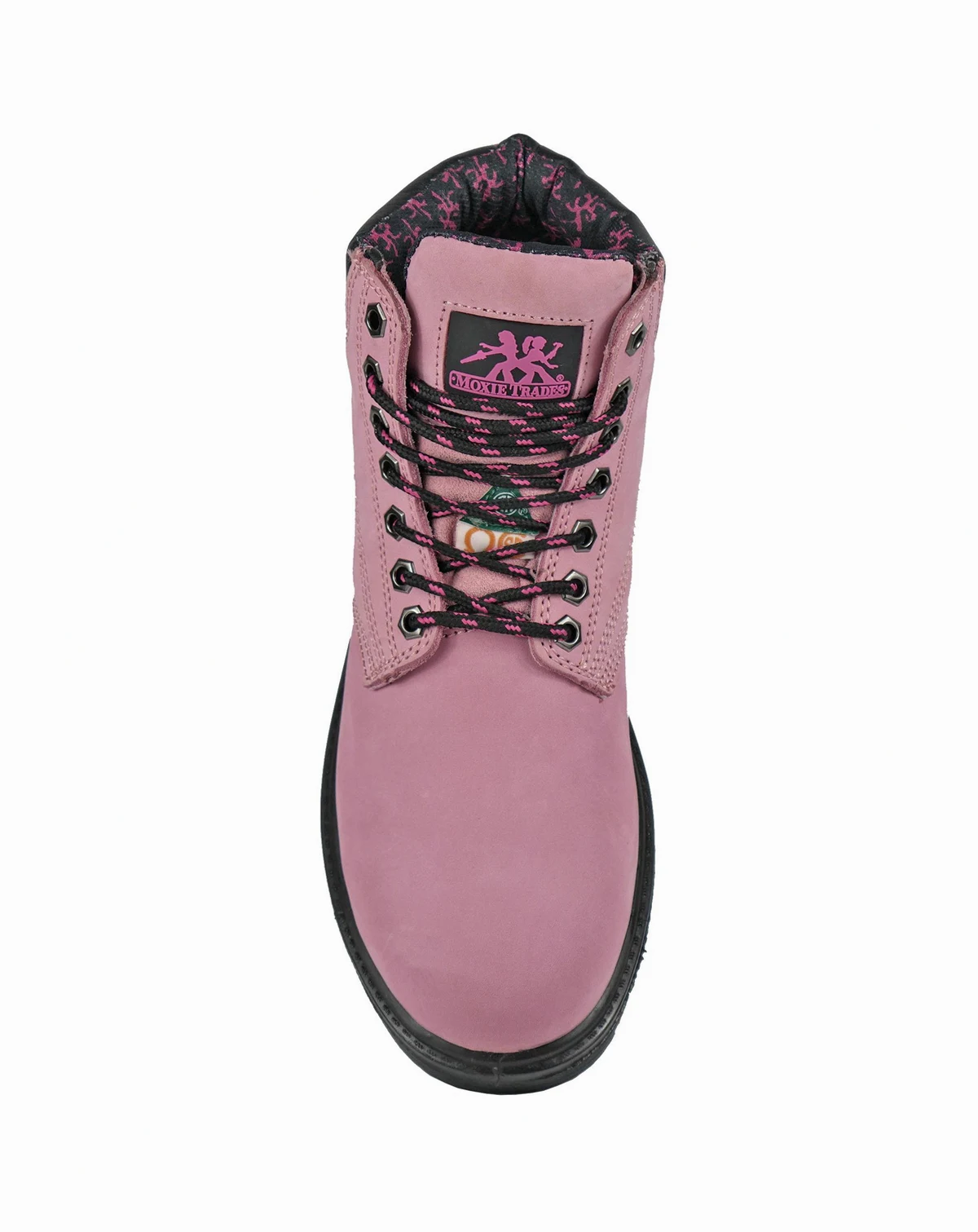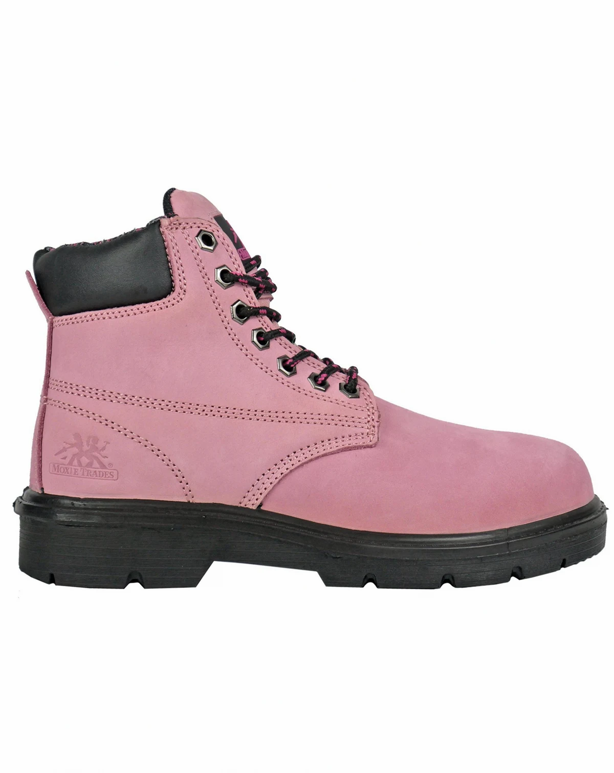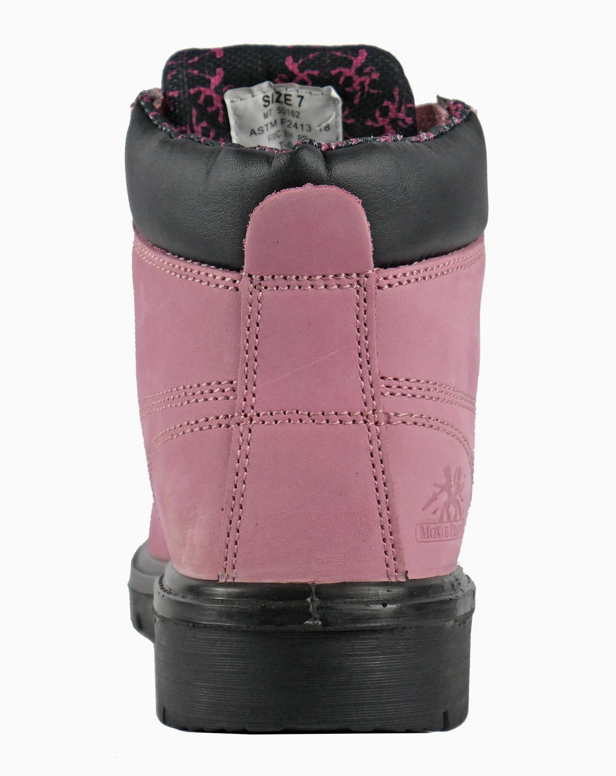 The Moxie Alice 6" Pink Steel Toe Work Boot delivers bold style with serious workplace protection. Built from premium full-grain soft nubuck leather, this boot combines durability with a distinctive, feminine look. A steel safety toe provides maximum impact and compression protection, while a puncture-resistant midsole helps guard against sharp underfoot hazards. The Tri-Tex waterproof breathable lining keeps feet dry and comfortable in changing conditions. A cushioned foam insole supports all-day comfort, and the direct-attach PU/PU slip-resistant outsole delivers dependable traction across varied surfaces. Certified to ASTM F3445-21 slip-resistant standards, ASTM F2413-18 F/I/C EH PR, and CSA Grade 1, the Alice 6" boot is engineered for confidence, comfort, and protection on the job. Available in women's sizes 5 through 11, including half sizes, and includes an extra black lace for added versatility.