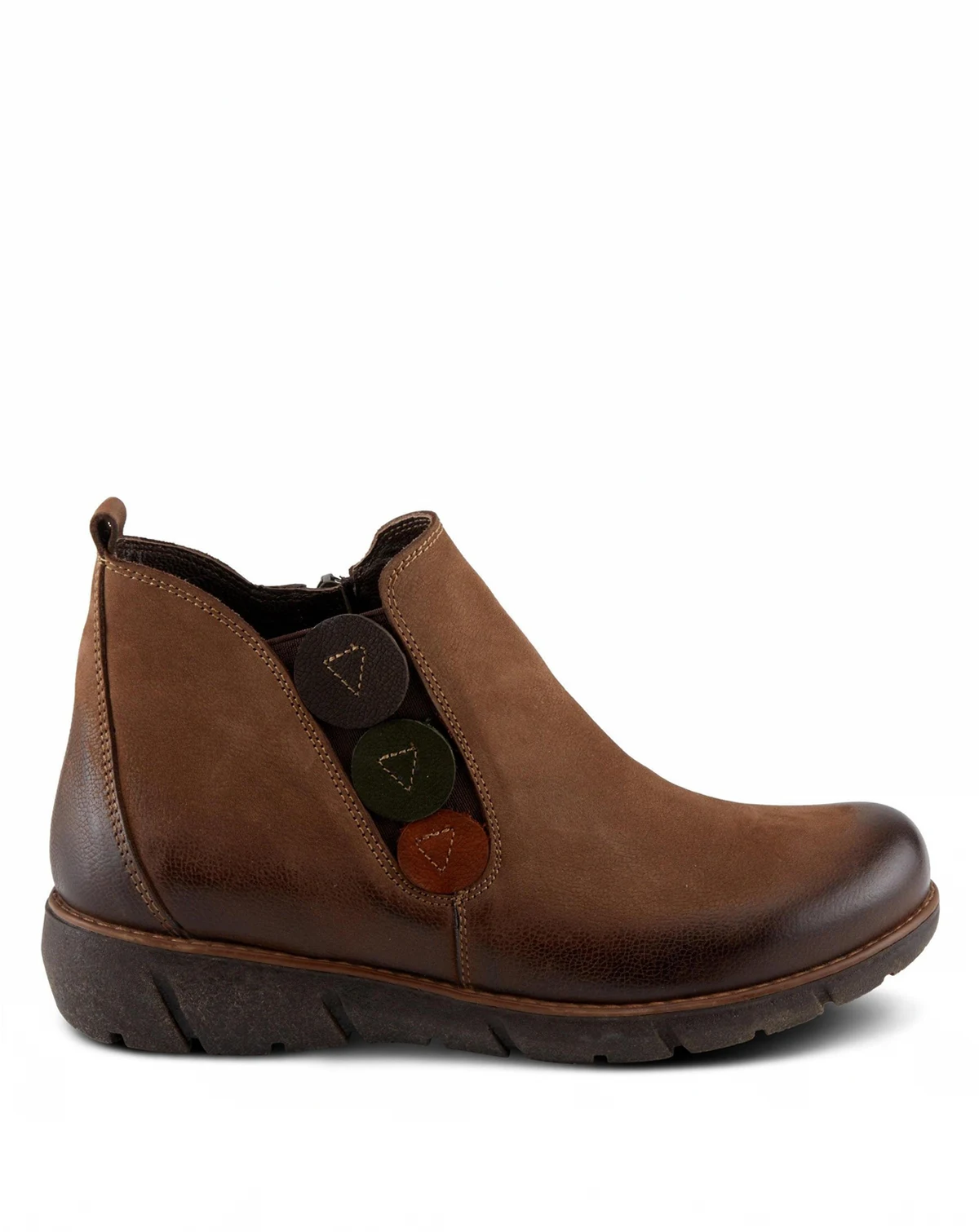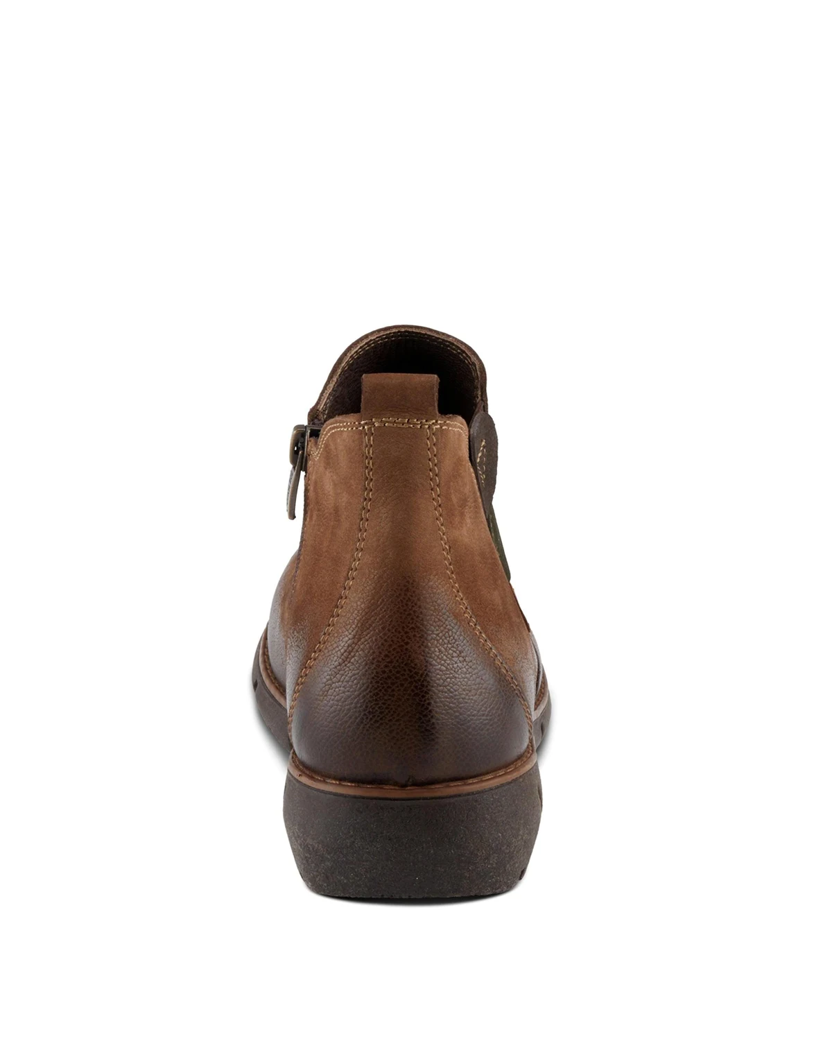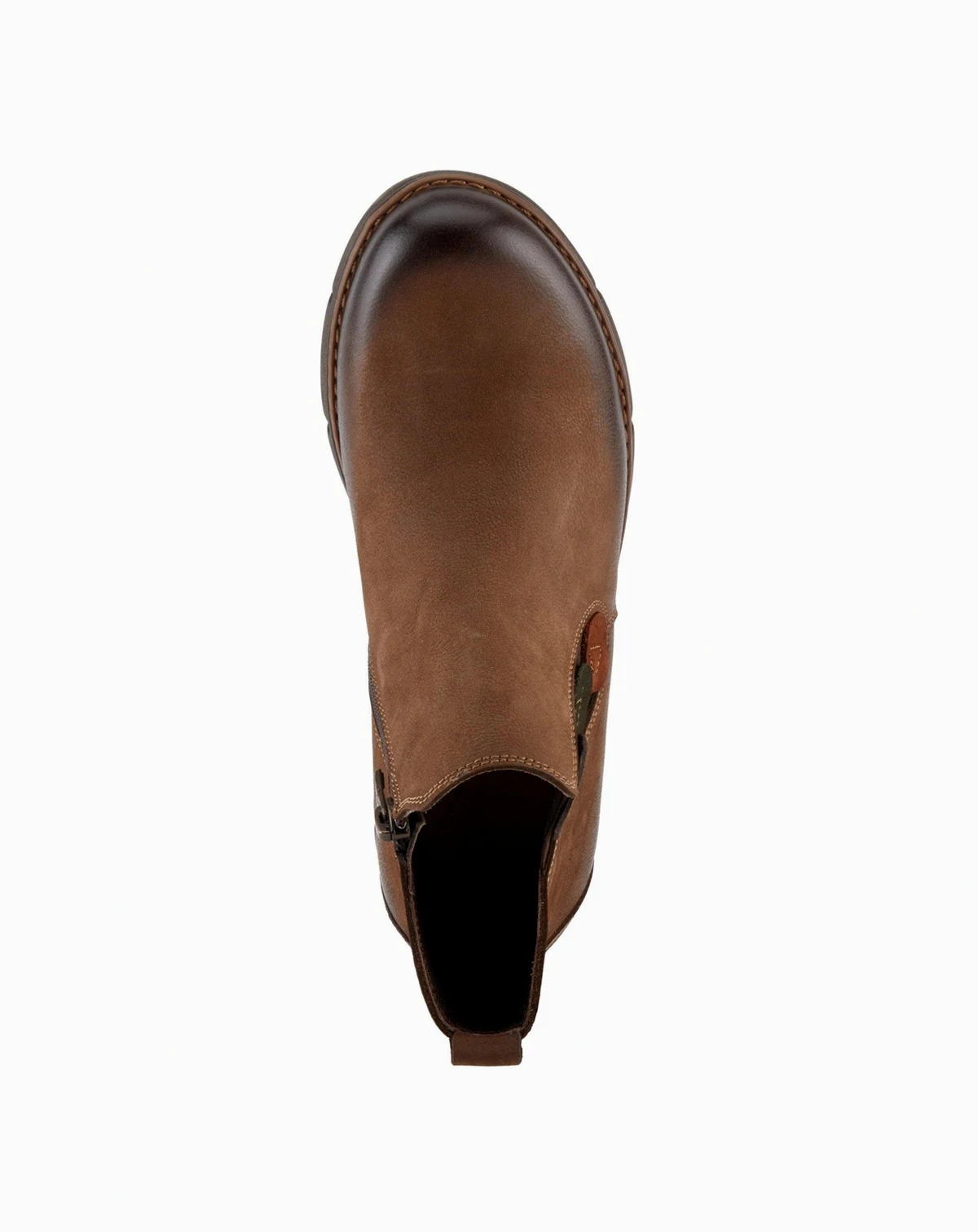 Step confidently in this fashion-forward bootie crafted from burnished nubuck leather that develops a rich patina over time. Accented with circular leather pieces over elastic gore, it features a removable cushioned insole and a rugged rubber outsole for traction and comfort from day to night.
