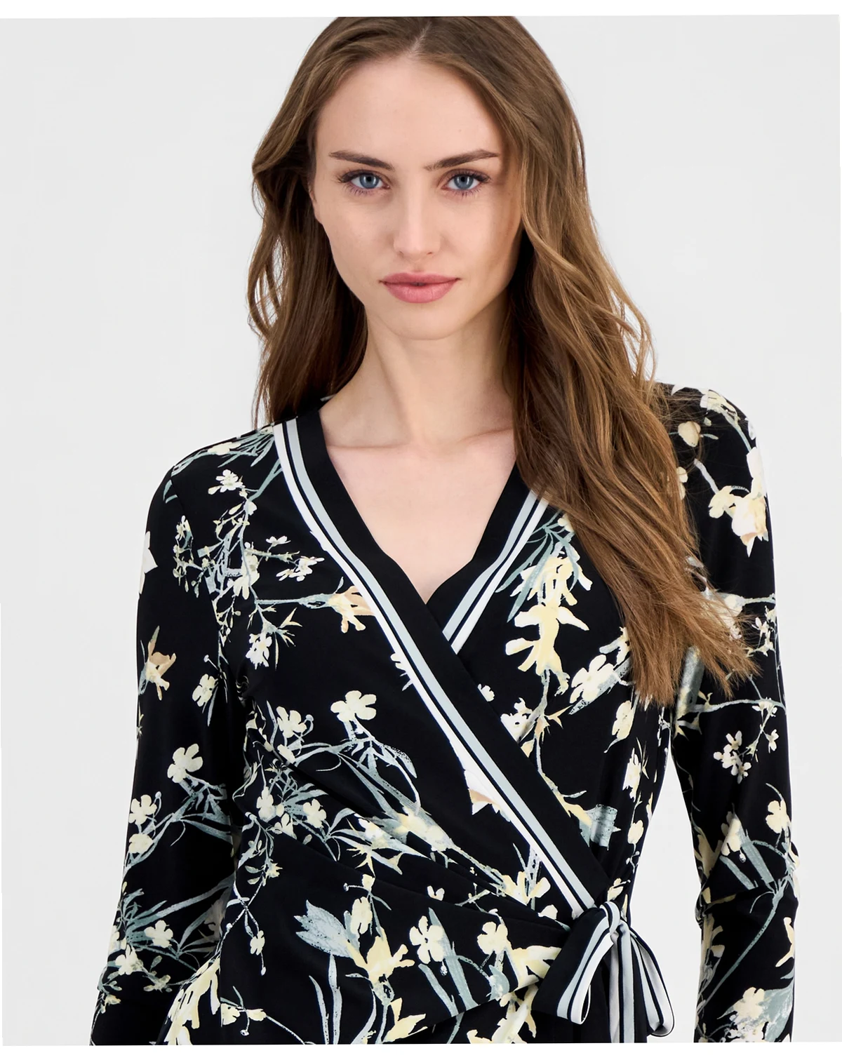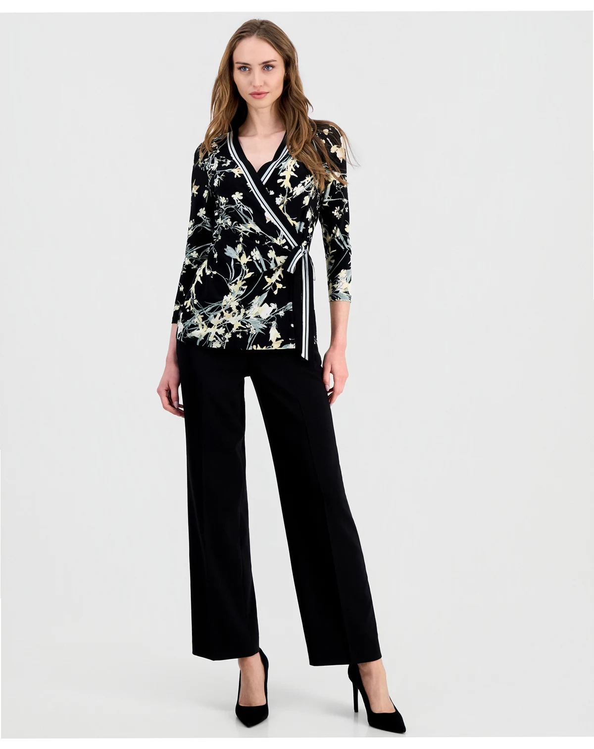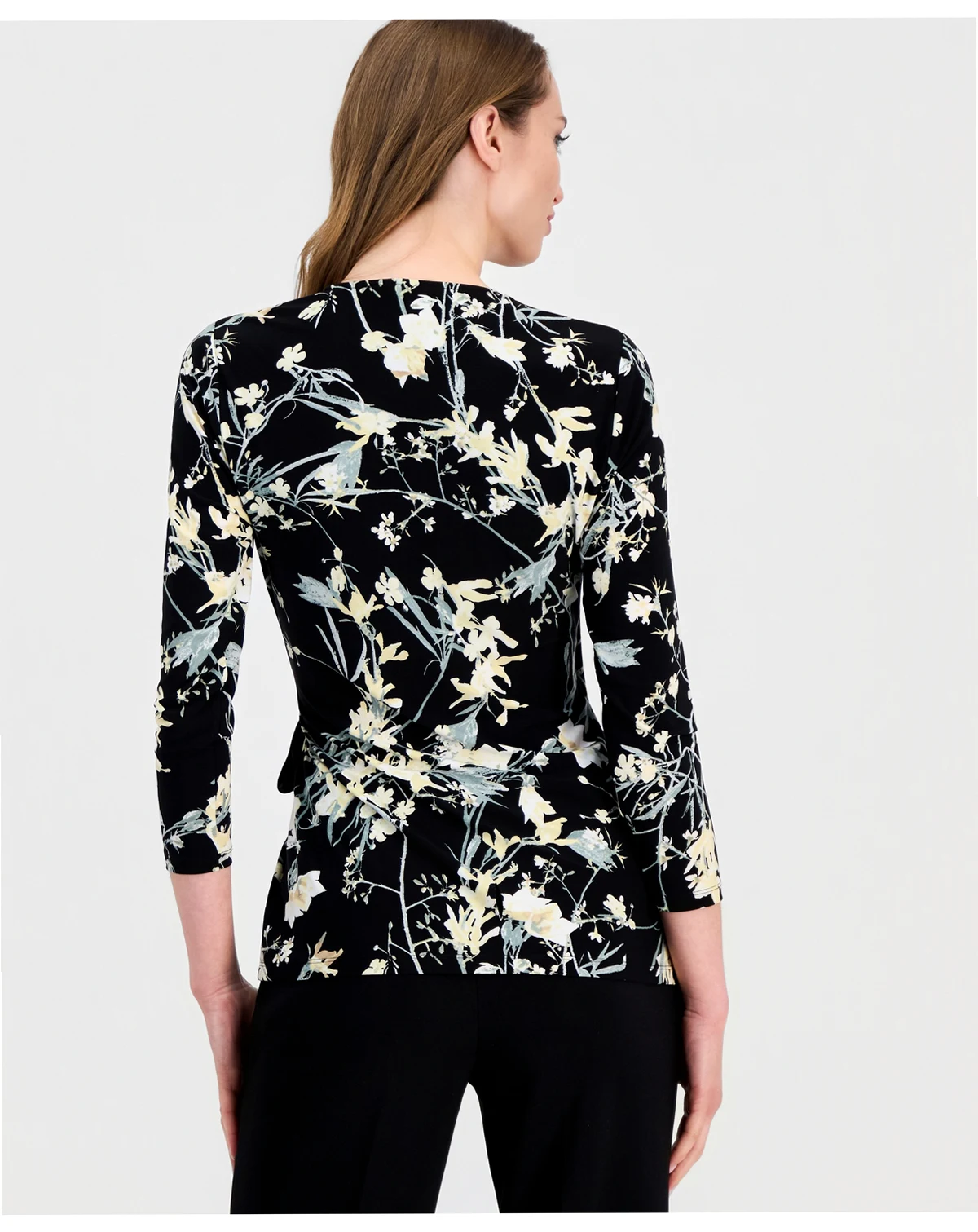 Fresh 3/4-sleeves lend effortless elegance to this printed wrap top from Anne Klein.