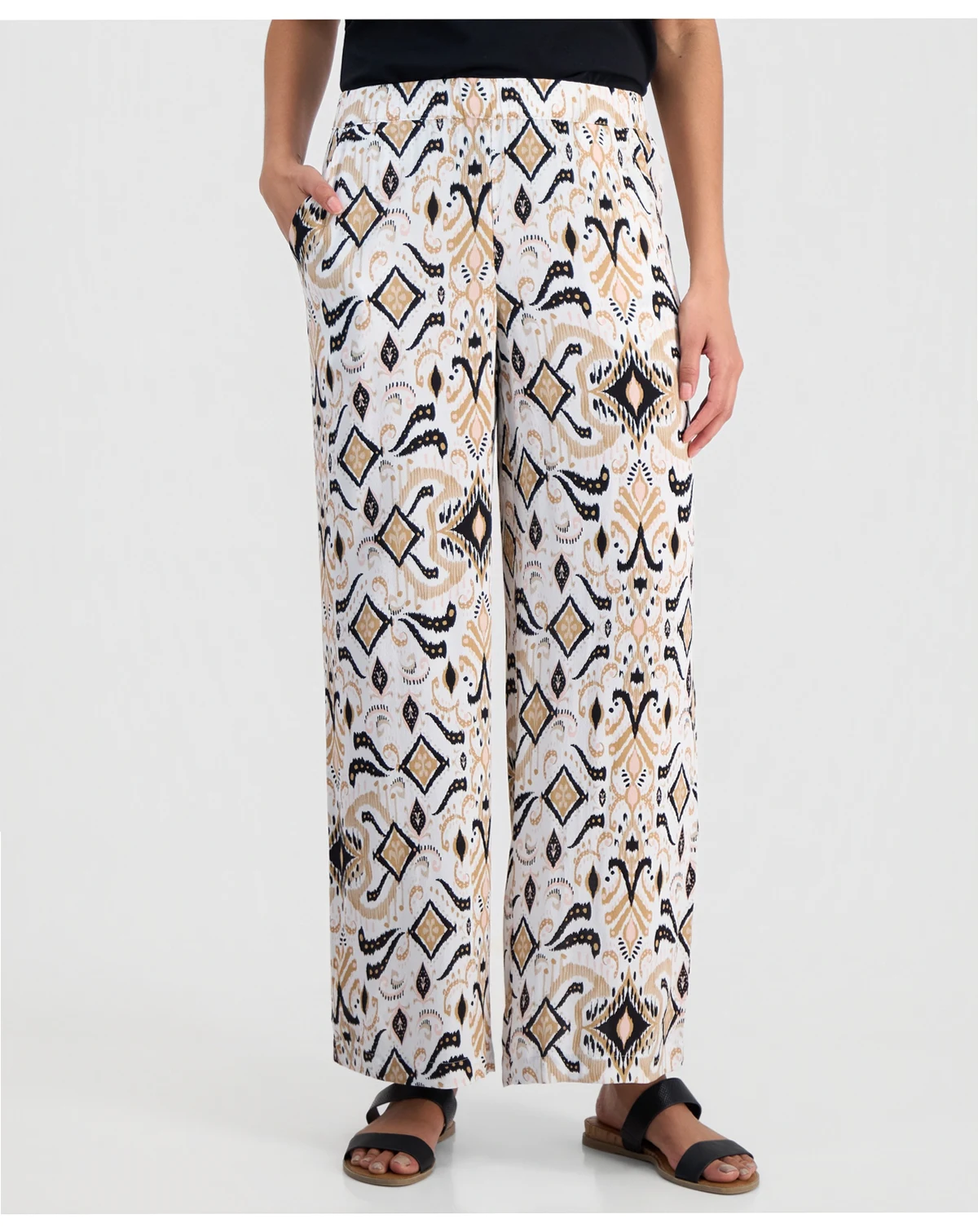Energize your look with these JM Collection pants, comfy pull-ons with wide, easy legs and a bold print.